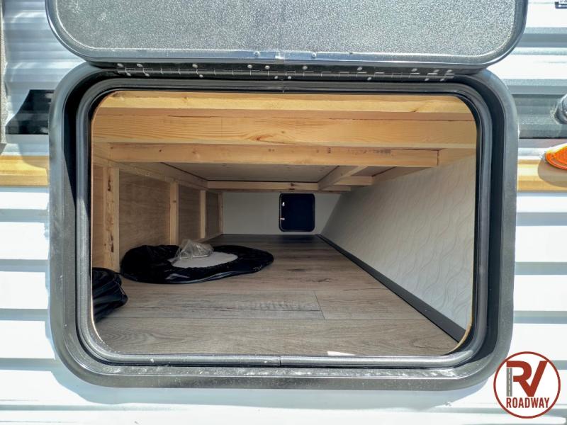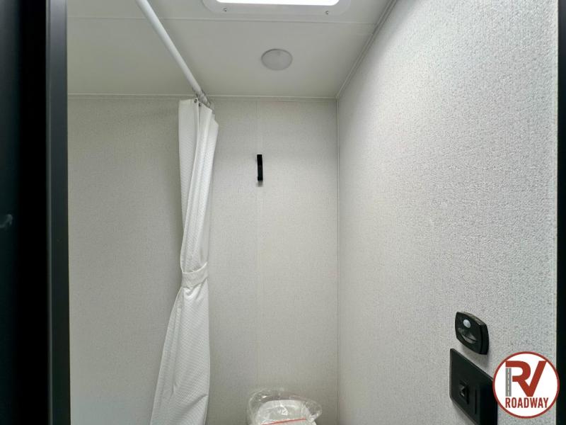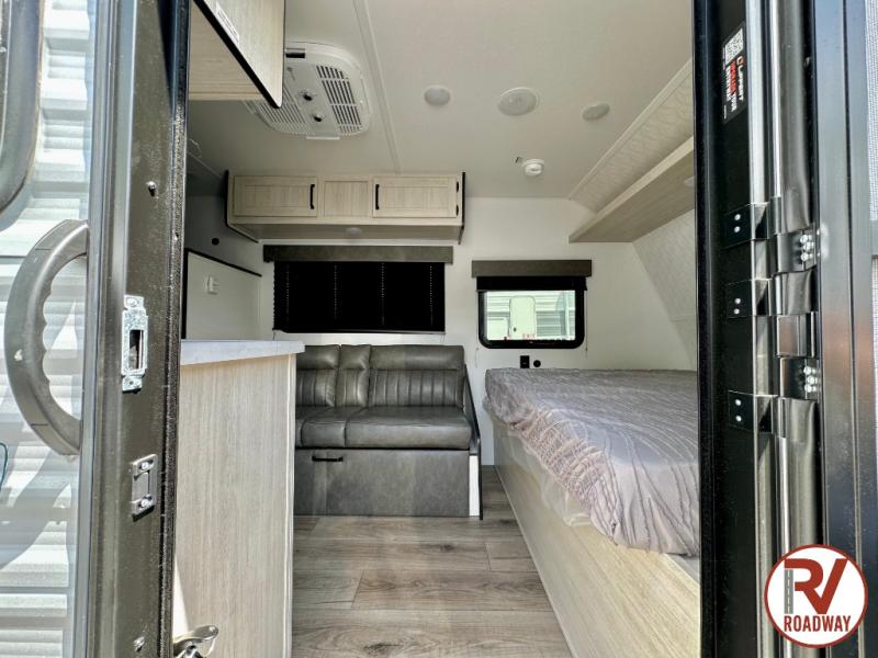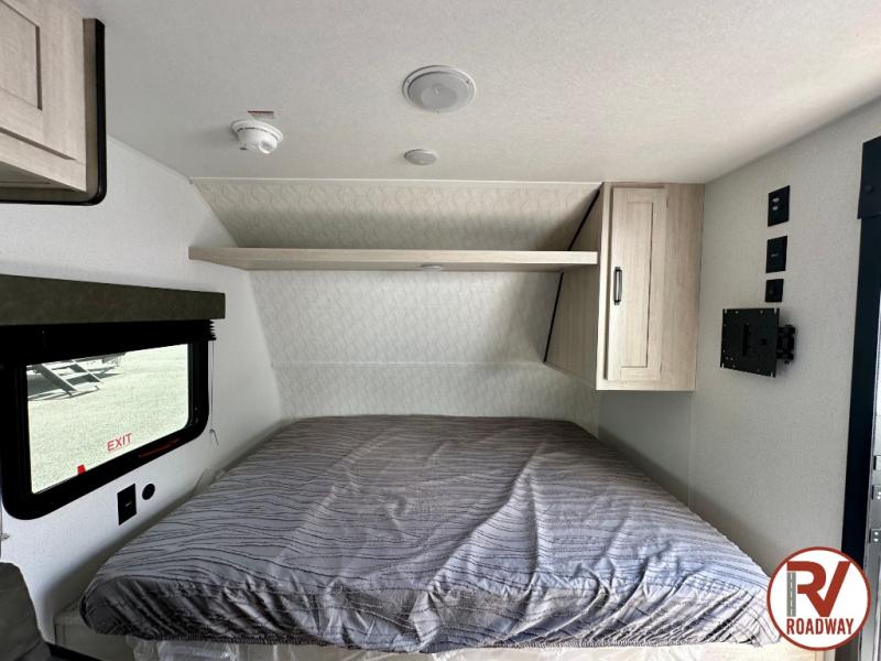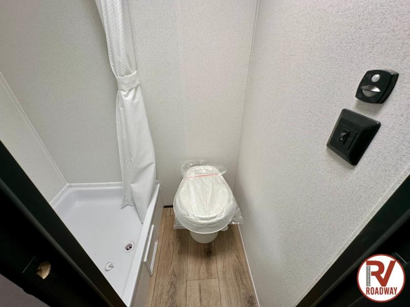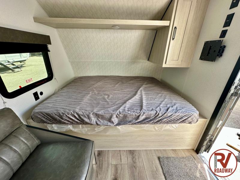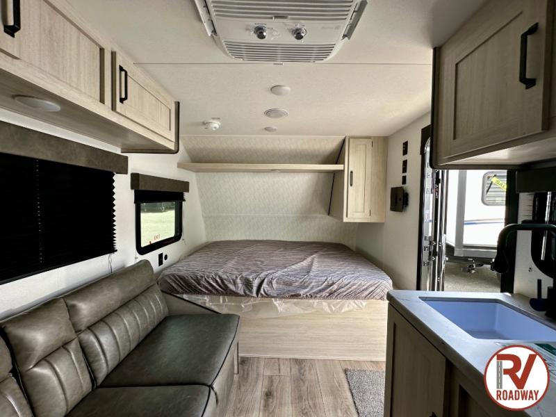 It will be so easy to enjoy camping trips in this single axle travel trailer! There is a front RV queen bed with flip-up storage at the foot of the bed for your belongings, and any additional guests can sleep on the bunk beds and sofa. A full kitchen includes a stainless two burner cooktop and stainless microwave to cook meals each day, and the 4.3 cu. ft. 12V black glass refrigerator will keep your food fresh. And a private bath with a toilet and shower will let you freshen up without having to use the camp's facilities!