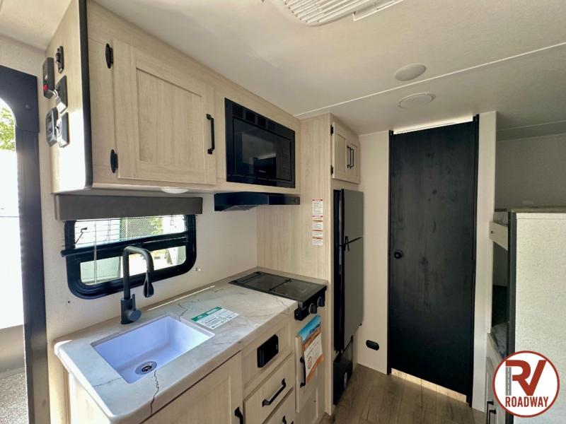It will be so easy to enjoy camping trips in this single axle travel trailer! There is a front RV queen bed with flip-up storage at the foot of the bed for your belongings, and any additional guests can sleep on the bunk beds and sofa. A full kitchen includes a stainless two burner cooktop and stainless microwave to cook meals each day, and the 4.3 cu. ft. 12V black glass refrigerator will keep your food fresh. And a private bath with a toilet and shower will let you freshen up without having to use the camp's facilities!