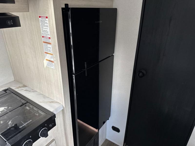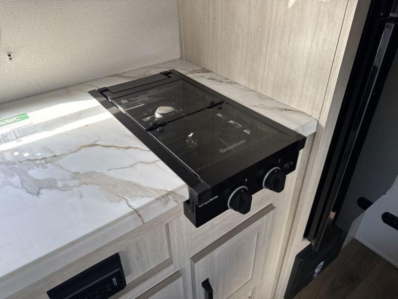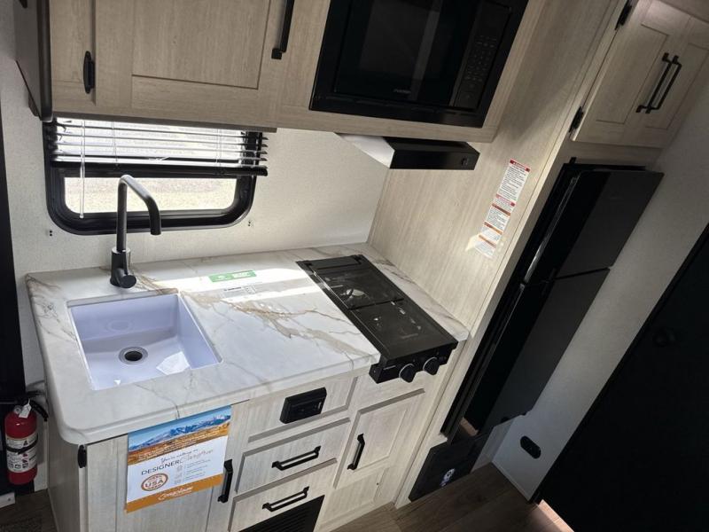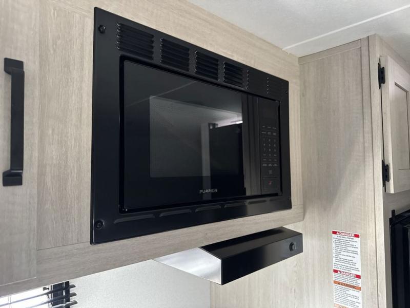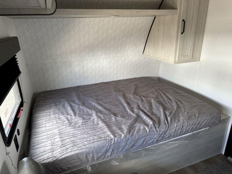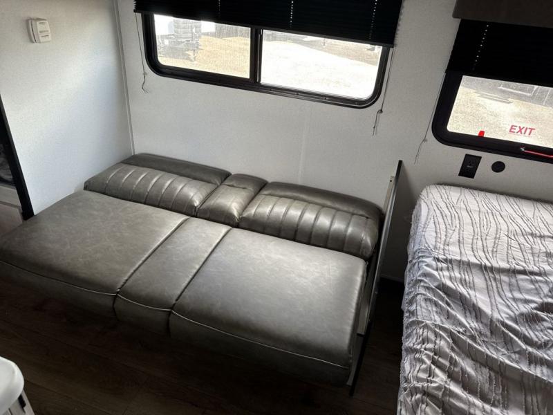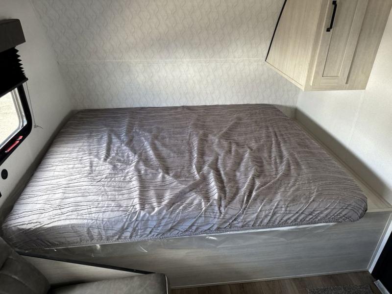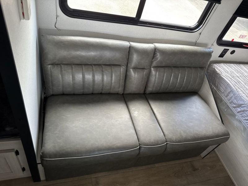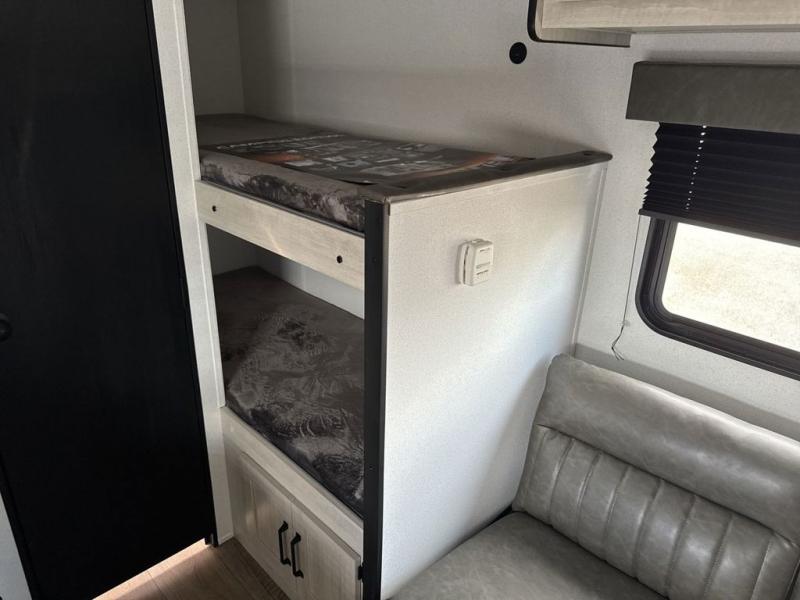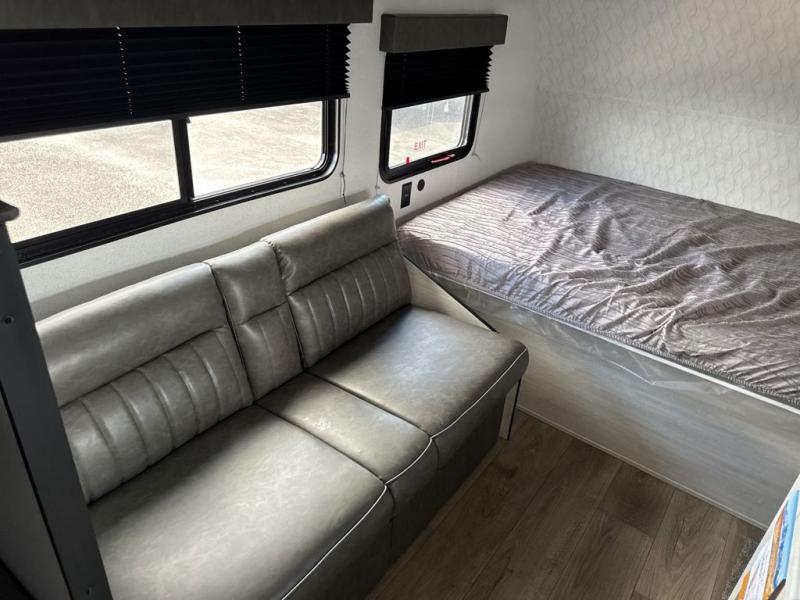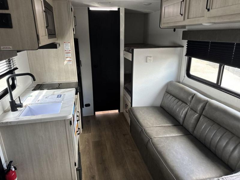 It will be so easy to enjoy camping trips in this single axle travel trailer! There is a front RV queen bed with flip-up storage at the foot of the bed for your belongings, and any additional guests can sleep on the bunk beds and sofa. A full kitchen includes a stainless two burner cooktop and stainless microwave to cook meals each day, and the 4.3 cu. ft. 12V black glass refrigerator will keep your food fresh. And a private bath with a toilet and shower will let you freshen up without having to use the camp's facilities!