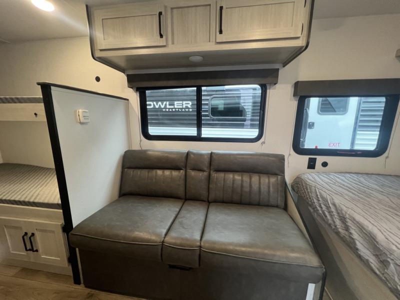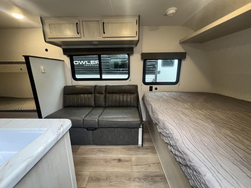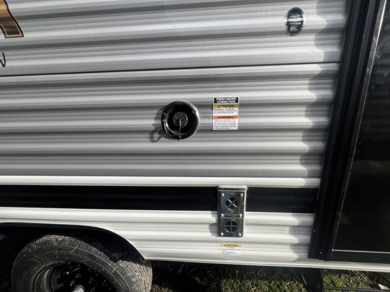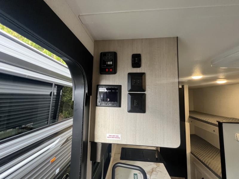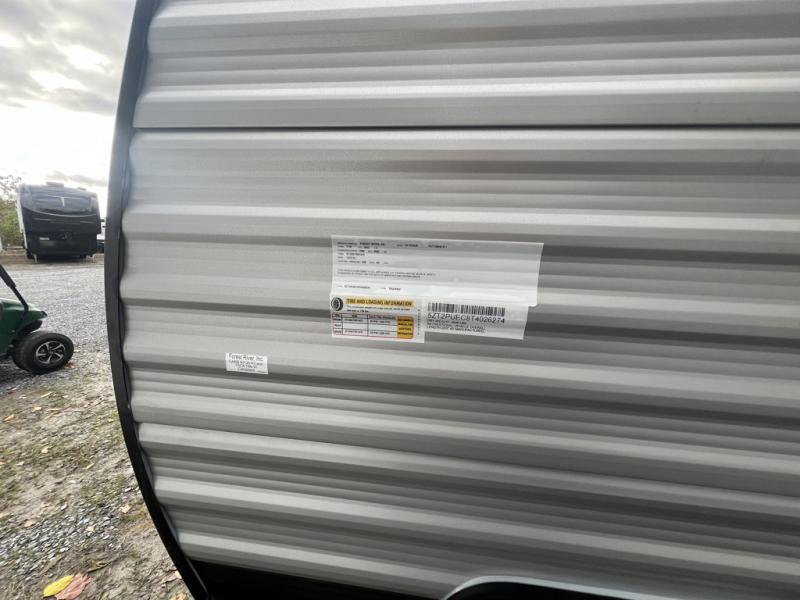 It will be so easy to enjoy camping trips in this single axle travel trailer! There is a front RV queen bed with flip-up storage at the foot of the bed for your belongings, and any additional guests can sleep on the bunk beds and sofa. A full kitchen includes a stainless two burner cooktop and stainless microwave to cook meals each day, and the 4.3 cu. ft. 12V black glass refrigerator will keep your food fresh. And a private bath with a toilet and shower will let you freshen up without having to use the camp's facilities!