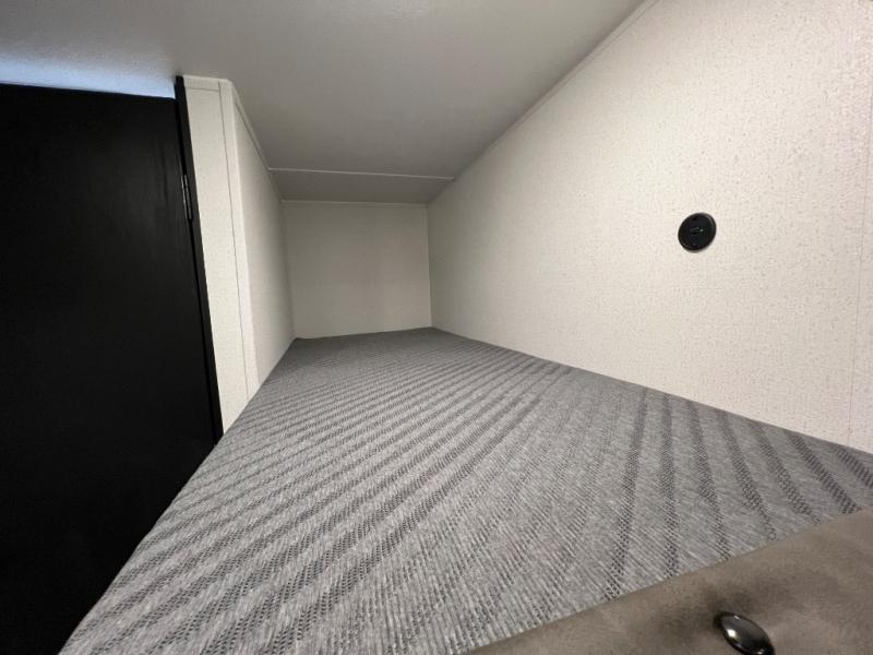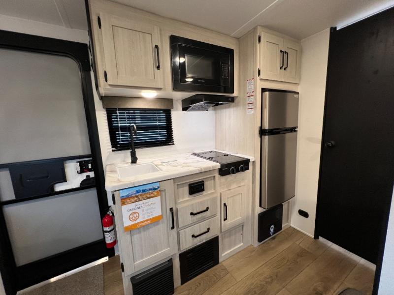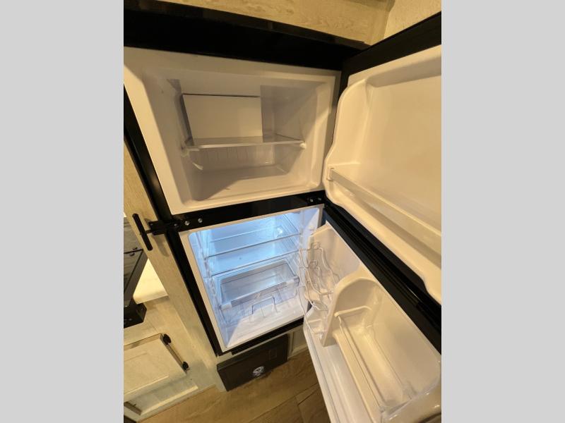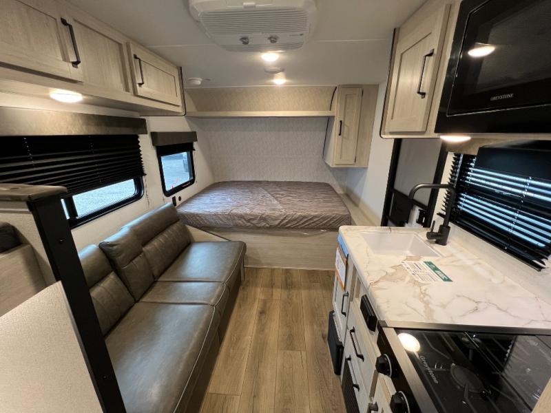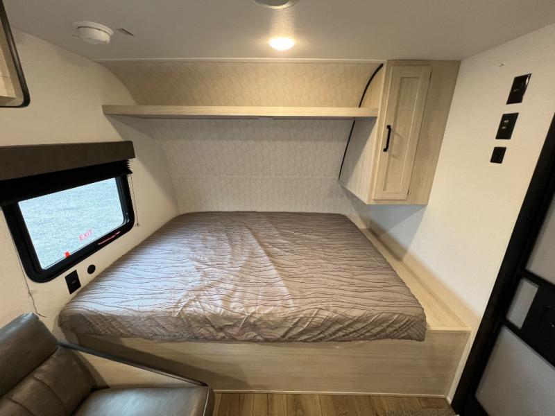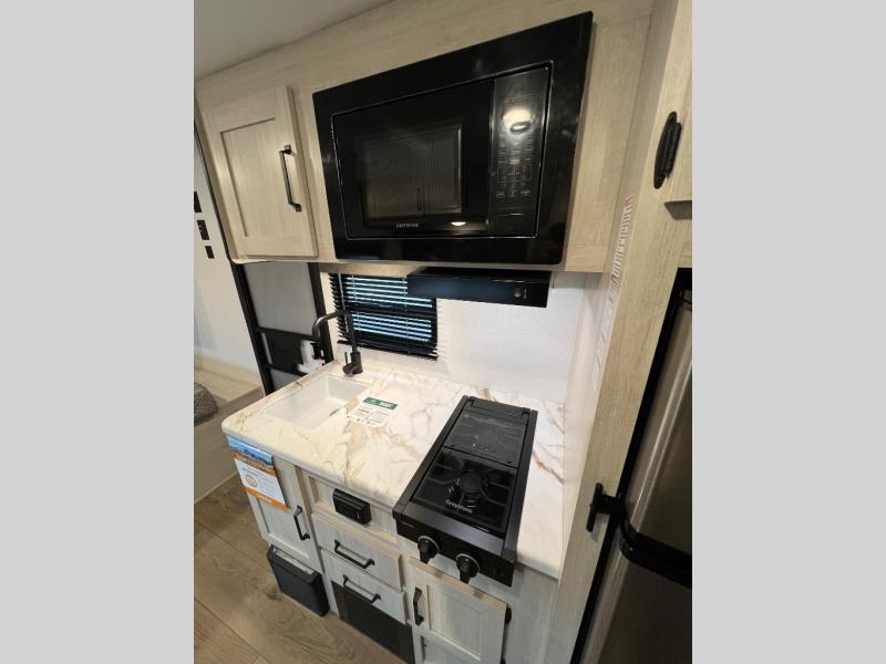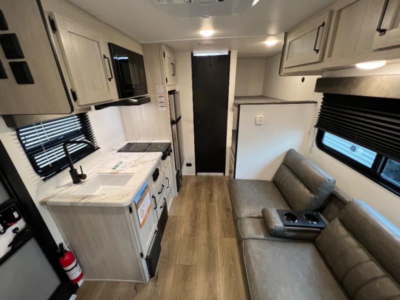 It will be so easy to enjoy camping trips in this single axle travel trailer! There is a front RV queen bed with flip-up storage at the foot of the bed for your belongings, and any additional guests can sleep on the bunk beds and sofa. A full kitchen includes a two-burner cooktop and microwave to cook meals each day, and the 12V black glass refrigerator will keep your food fresh. And a private bath with a toilet and shower will let you freshen up without having to use the camp's facilities!