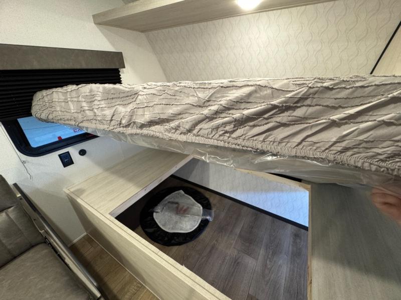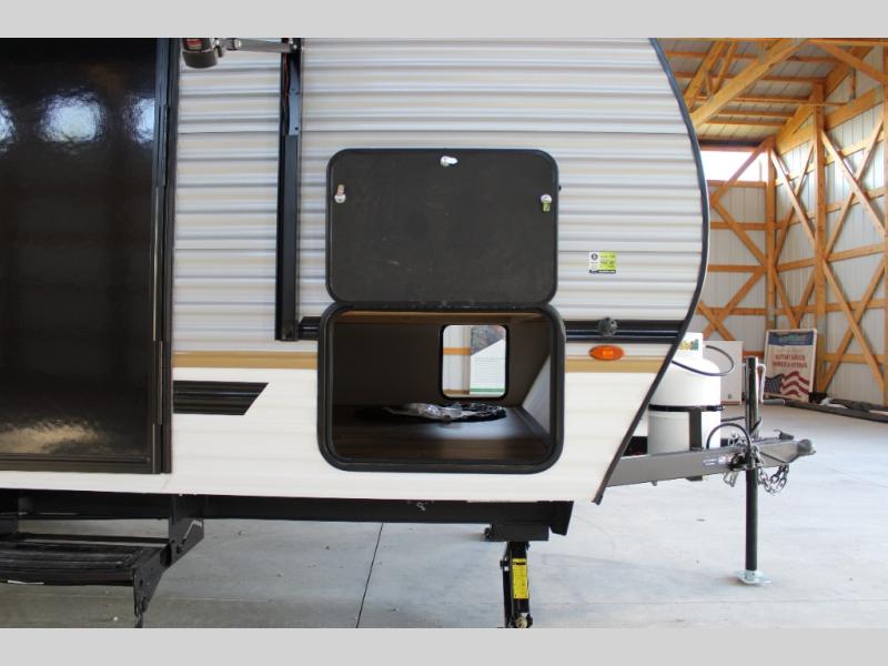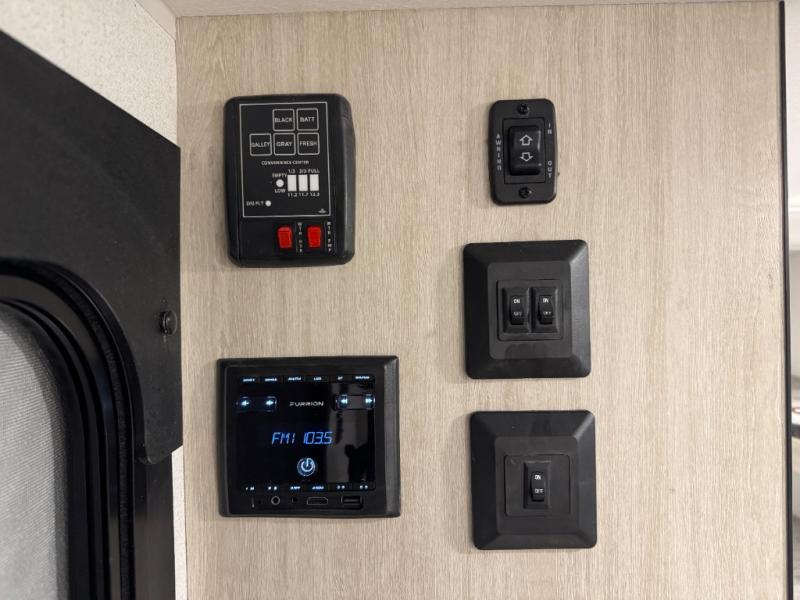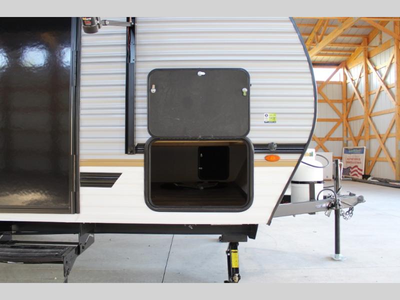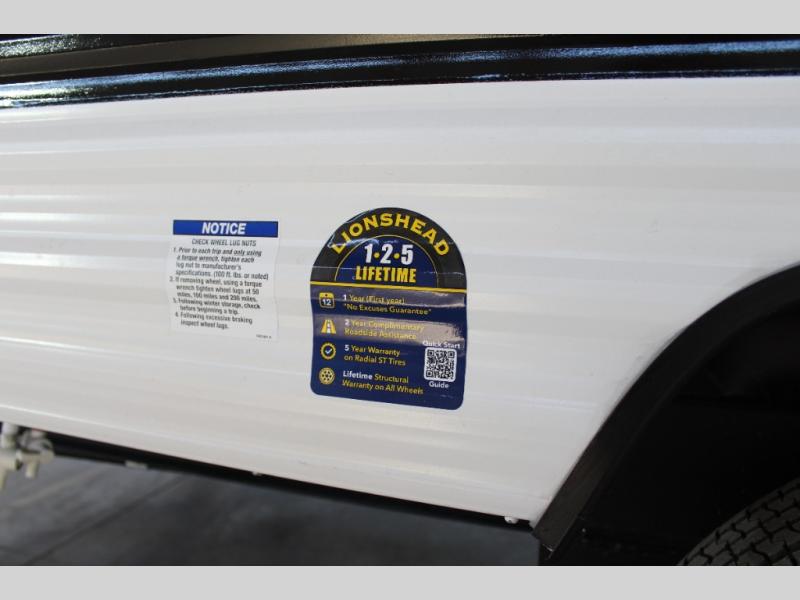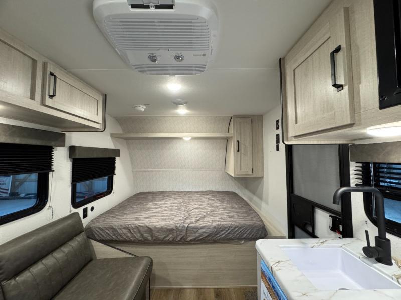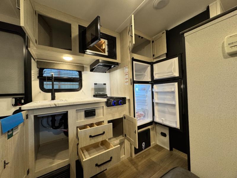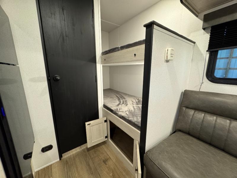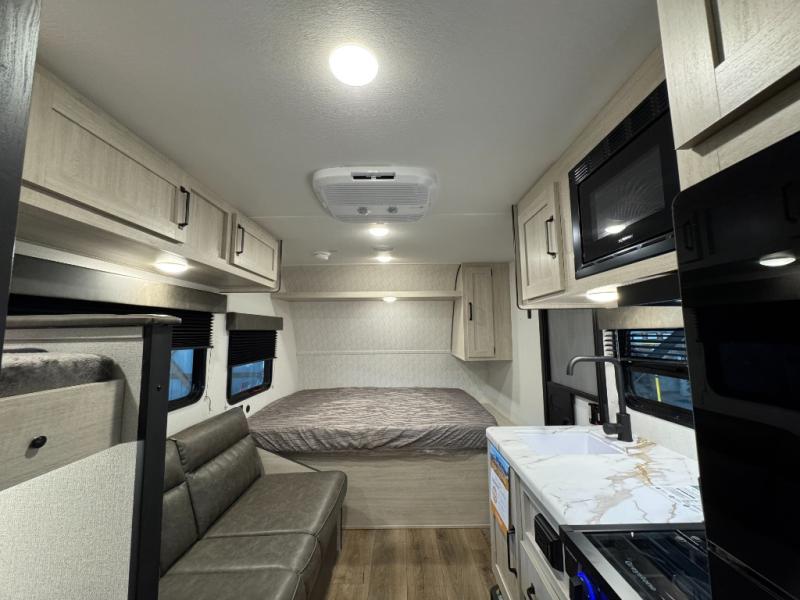 It will be so easy to enjoy camping trips in this single axle travel trailer! There is a front RV queen bed with flip-up storage at the foot of the bed for your belongings, and any additional guests can sleep on the bunk beds and sofa. A full kitchen includes a two-burner cooktop and microwave to cook meals each day, and the 12V black glass refrigerator will keep your food fresh. And a private bath with a toilet and shower will let you freshen up without having to use the camp's facilities!