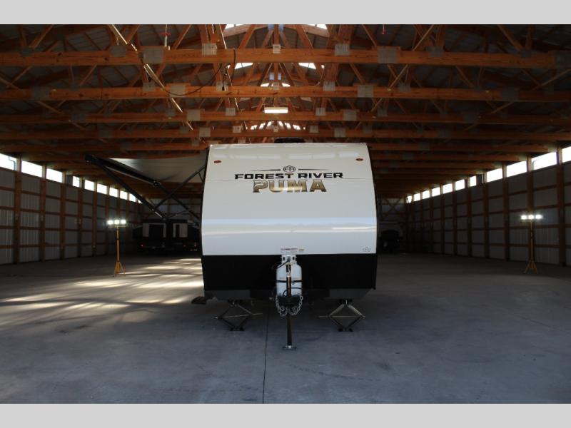 The Puma Camping Edition by Forest River offer an affordable travel trailer for rookie campers or seasoned RVers! They are built with 5/8" tongue and groove plywood flooring and a front diamond plate for added protection. There are also exterior magnetic baggage door latches, back up camera prep, a battery disconnect. Head inside to find Thermofoil countertops with a smooth drop edge, bedroom USB ports and outlets, and pleated shades in the living room.