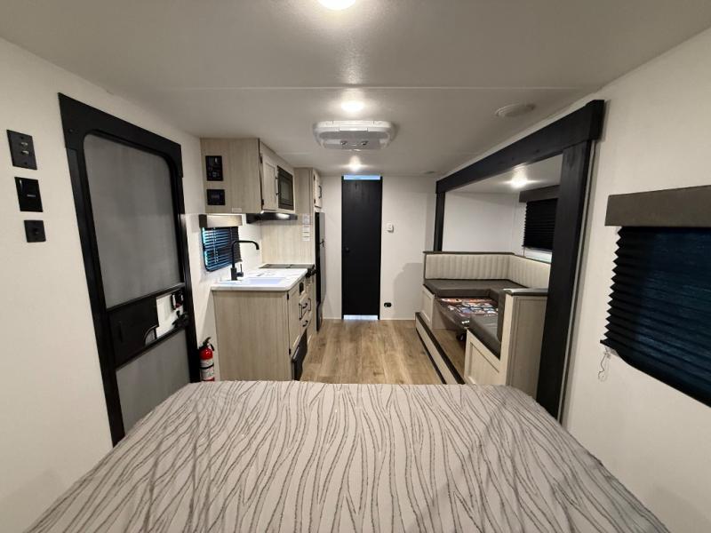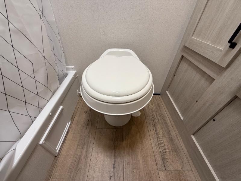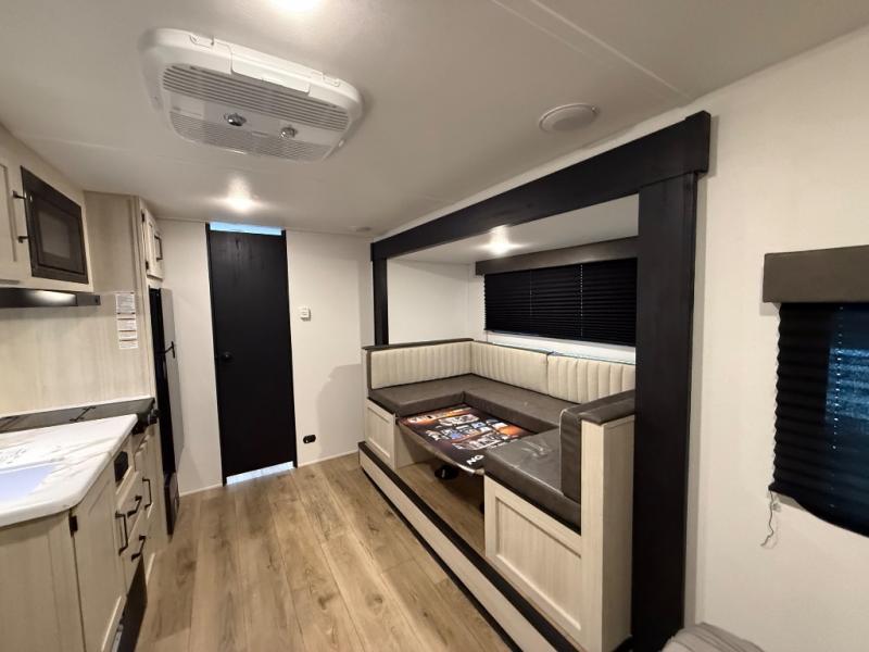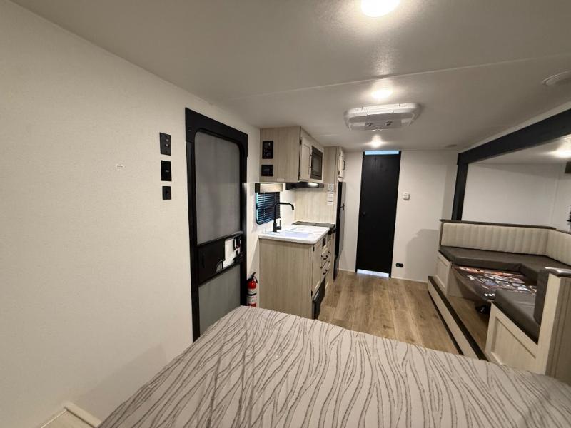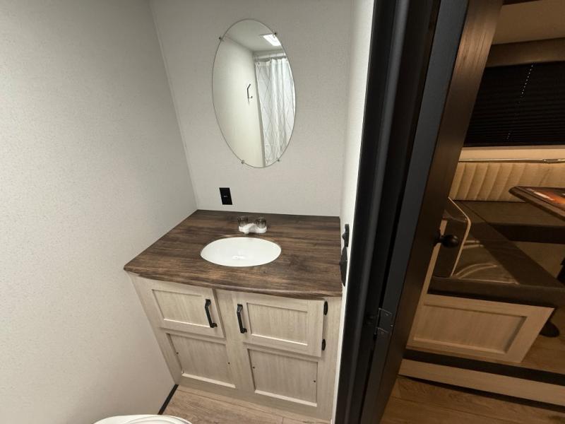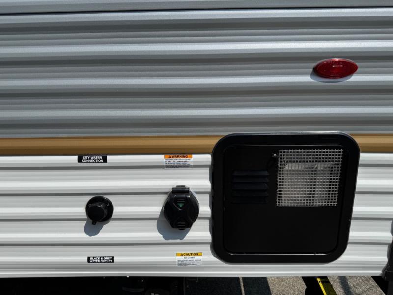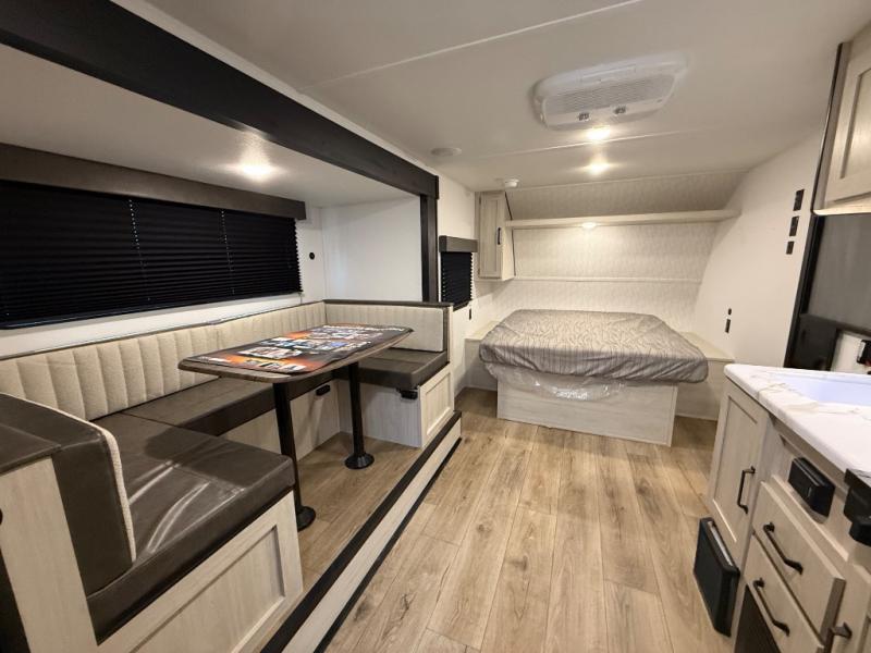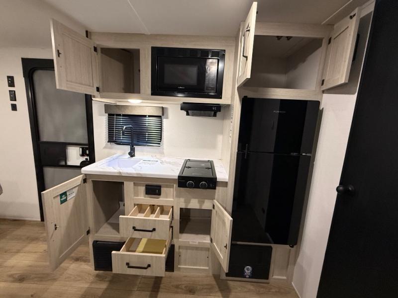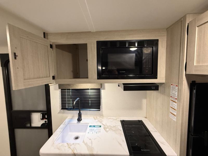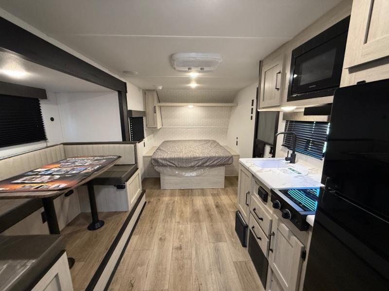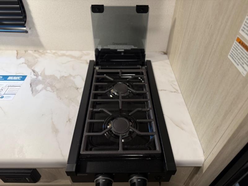 This travel trailer includes everything you need for camping trips at the lake. You'll sleep great each night on the front RV queen bed, or you can choose the optional Murphy bed with a sofa if you need more seating space during the day. The chef of your group can make meals on the two burner cooktop or in the microwave oven, then you can dine around the U-shaped dinette slide. A full rear bath includes a 36" x 30" shower, a toilet, vanity, plus a medicine cabinet to keep your things organized.