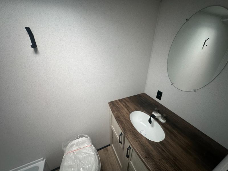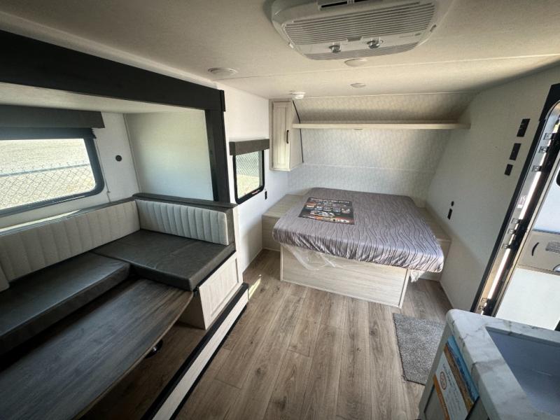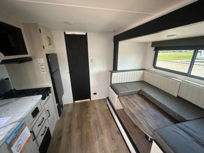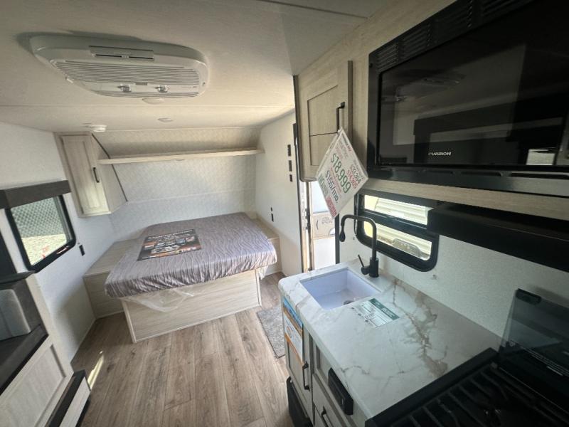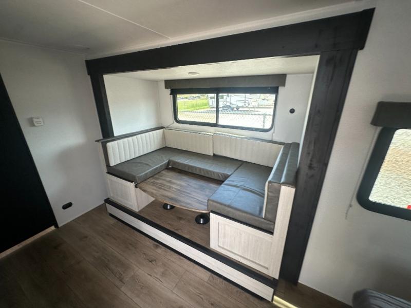This travel trailer includes everything you need for camping trips at the lake. You'll sleep great each night on the front RV queen bed, or you can choose the optional Murphy bed with a sofa if you need more seating space during the day. The chef of your group can make meals on the two burner cooktop or in the microwave oven, then you can dine around the U-shaped dinette slide. A full rear bath includes a 36" x 30" shower, a toilet, vanity, plus a medicine cabinet to keep your things organized.
