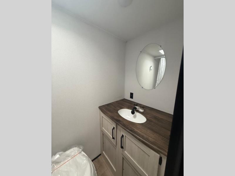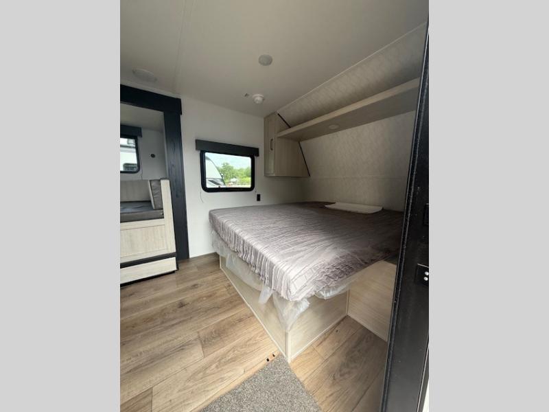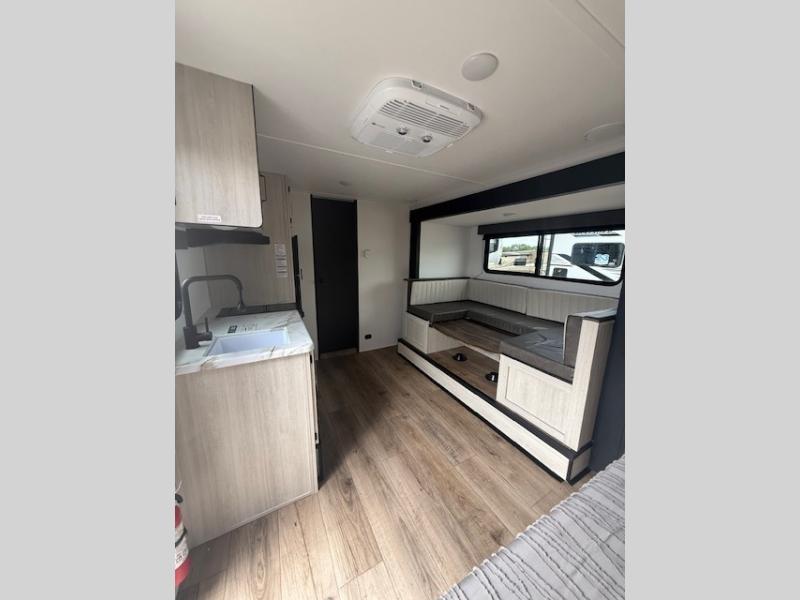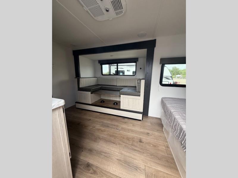 This travel trailer includes everything you need for camping trips at the lake. You'll sleep great each night on the front RV queen bed, or you can choose the optional Murphy bed with a sofa if you need more seating space during the day. The chef of your group can make meals on the two burner cooktop or in the microwave oven, then you can dine around the U-shaped dinette slide. A full rear bath includes a 36" x 30" shower, a toilet, vanity, plus a medicine cabinet to keep your things organized.