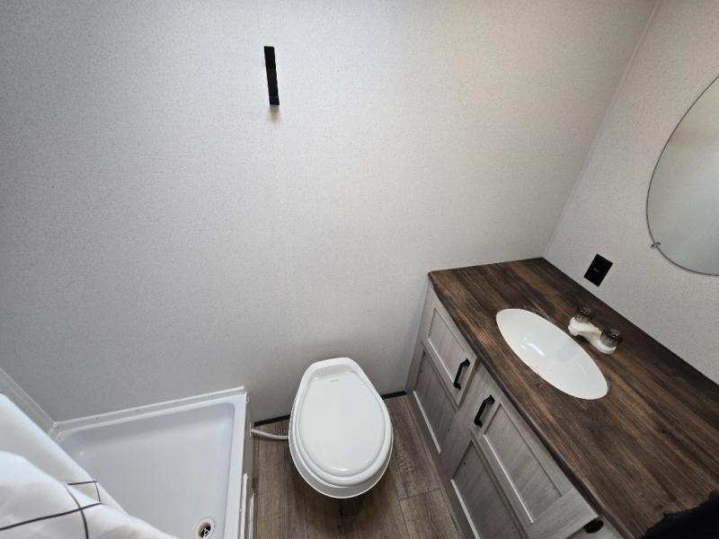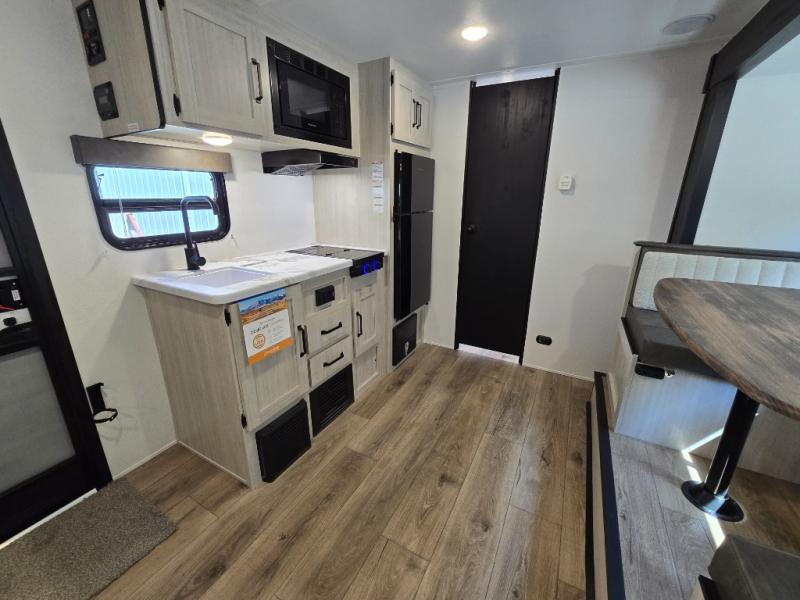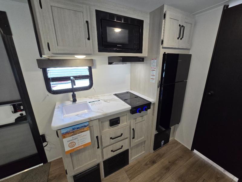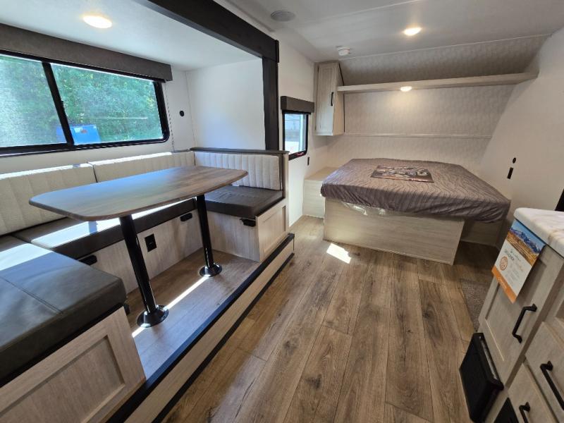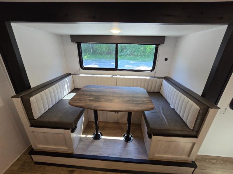 This travel trailer includes everything you need for camping trips at the lake. You'll sleep great each night on the front RV queen bed, or you can choose the optional Murphy bed with a sofa if you need more seating space during the day. The chef of your group can make meals on the two burner cooktop or in the microwave oven, then you can dine around the U-shaped dinette slide. A full rear bath includes a 36" x 30" shower, a toilet, vanity, plus a medicine cabinet to keep your things organized.