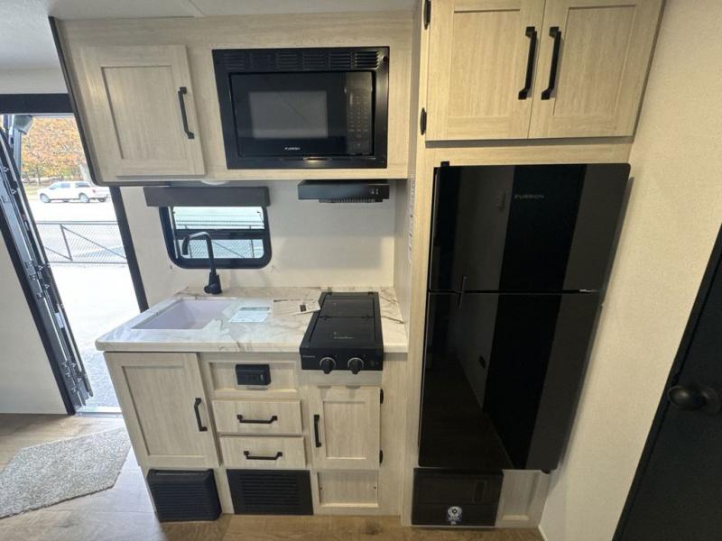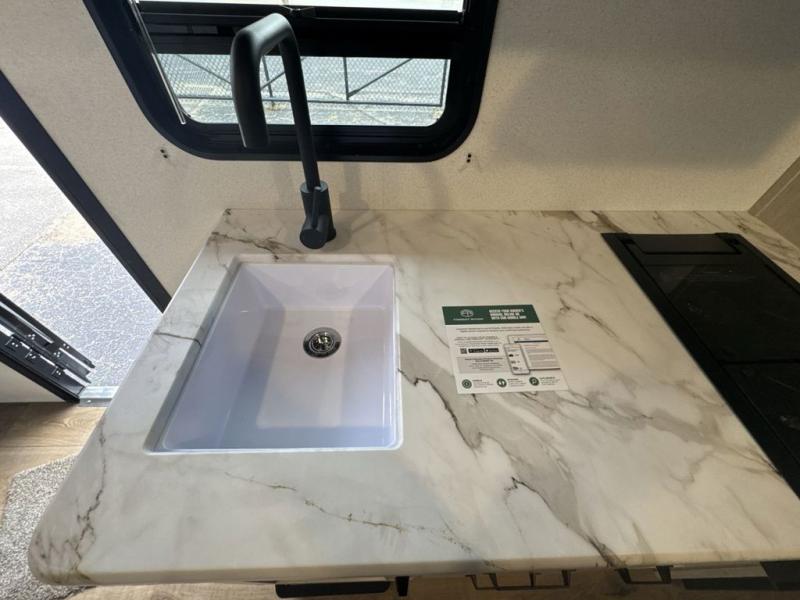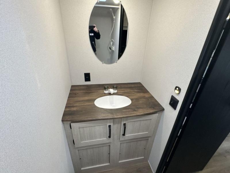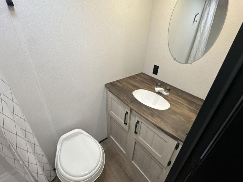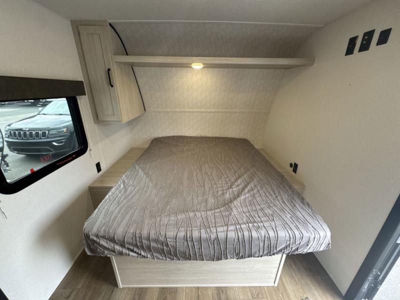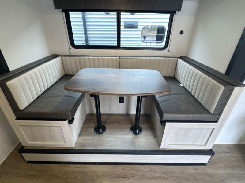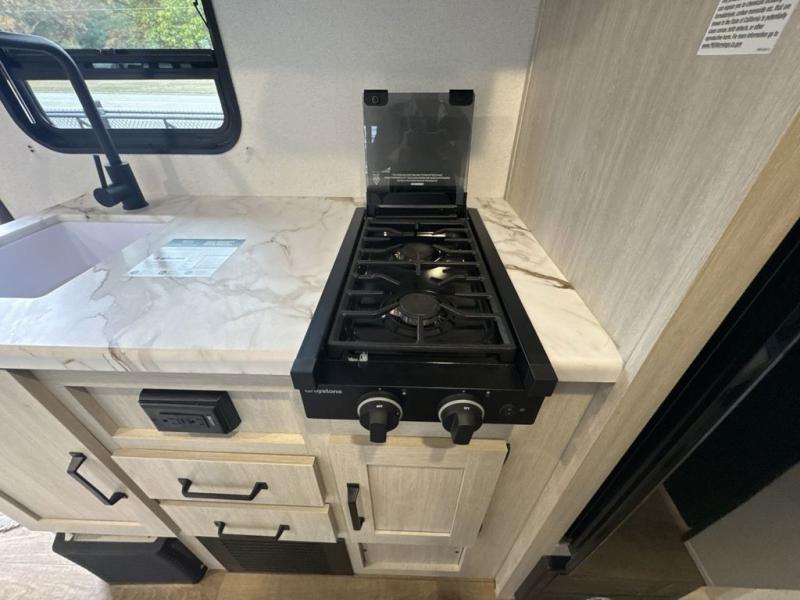 This travel trailer includes everything you need for camping trips at the lake. You'll sleep great each night on the front RV queen bed, or you can choose the optional Murphy bed with a sofa if you need more seating space during the day. The chef of your group can make meals on the two burner cooktop or in the microwave oven, then you can dine around the U-shaped dinette slide. A full rear bath includes a 36" x 30" shower, a toilet, vanity, plus a medicine cabinet to keep your things organized.