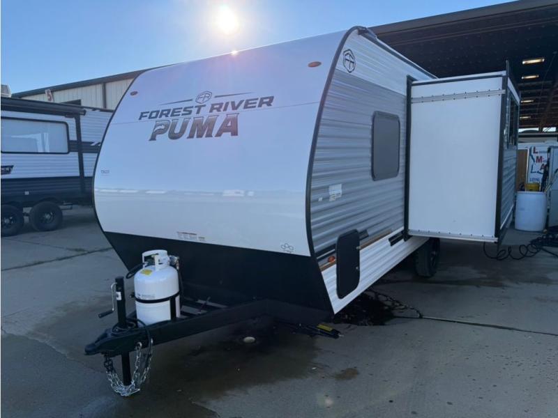 The Puma Camping Edition by Forest River offer an affordable travel trailer for rookie campers or seasoned RVers! They are built with 5/8" tongue and groove plywood flooring and a front diamond plate for added protection. There are also exterior magnetic baggage door latches, back up camera prep, a battery disconnect. Head inside to find Thermofoil countertops with a smooth drop edge, bedroom USB ports and outlets, and pleated shades in the living room.
