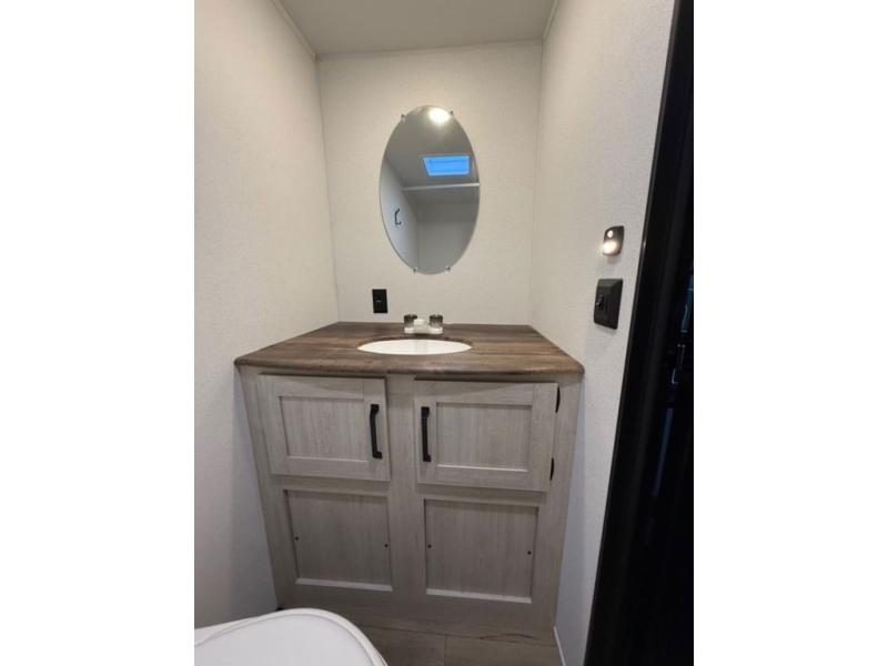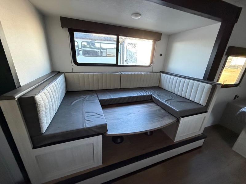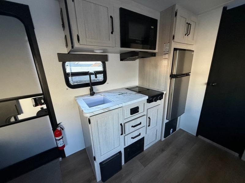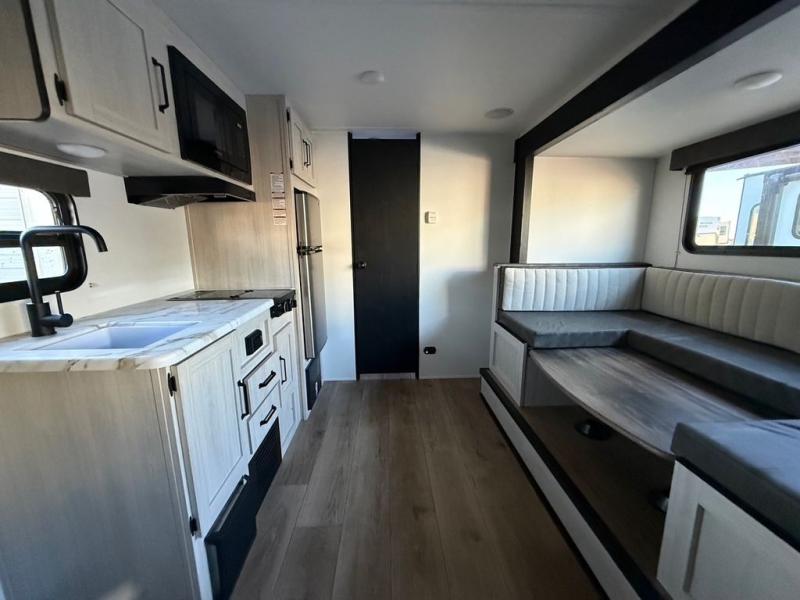This travel trailer includes everything you need for camping trips at the lake. You'll sleep great each night on the front RV queen bed with a shirt closet to keep your things organized, or you can choose the optional Murphy bed with a shelf. The chef of your group can make meals on the two-burner cooktop or in the microwave oven, then you can dine around the U-shaped dinette slide. A full rear bath includes a 36" x 30" shower, a toilet, vanity, plus a medicine cabinet to keep your things organized.