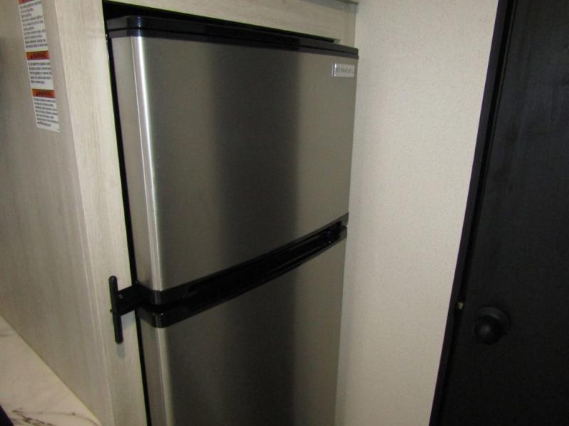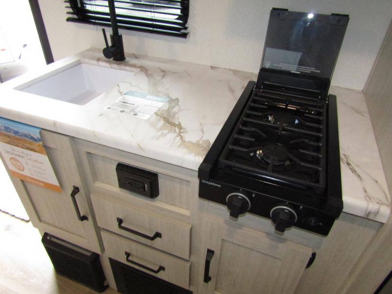 This travel trailer includes everything you need for camping trips at the lake. You'll sleep great each night on the front RV queen bed, or you can choose the optional Murphy bed with a sofa if you need more seating space during the day. The chef of your group can make meals on the two burner cooktop or in the microwave oven, then you can dine around the U-shaped dinette slide. A full rear bath includes a 36" x 30" shower, a toilet, vanity, plus a medicine cabinet to keep your things organized.