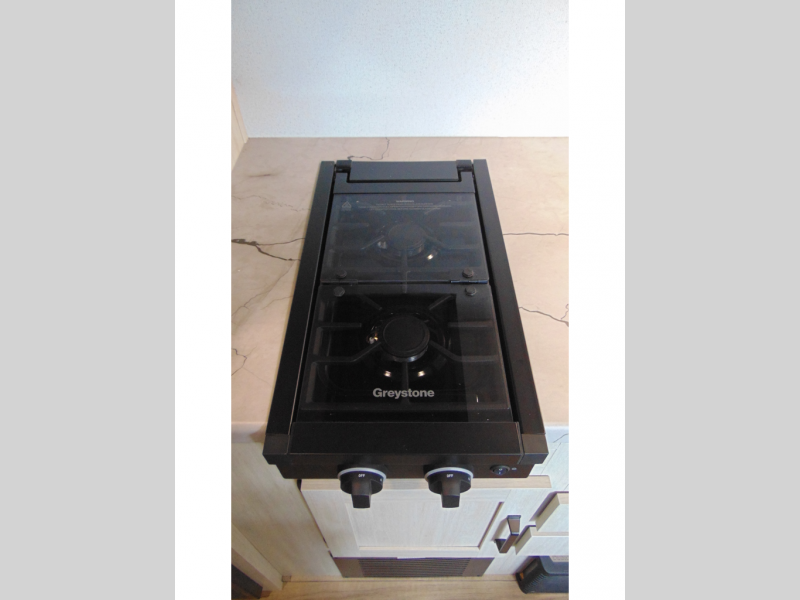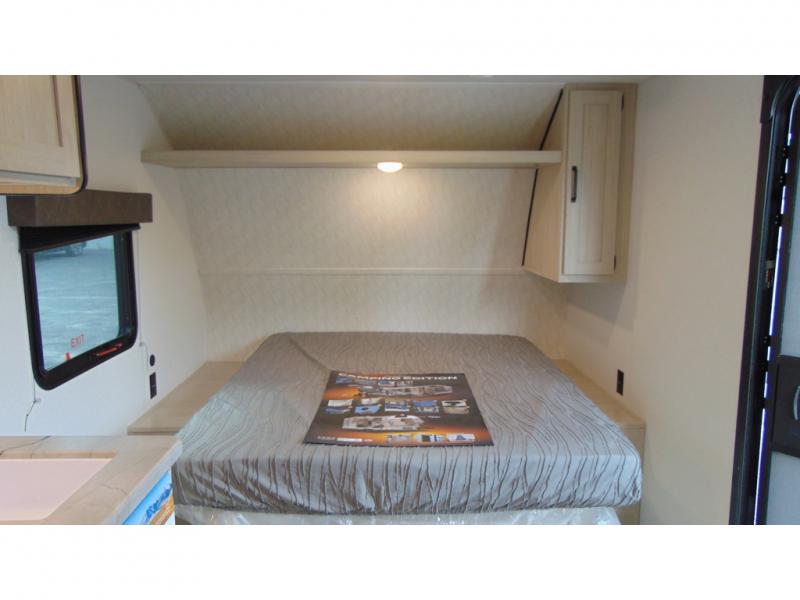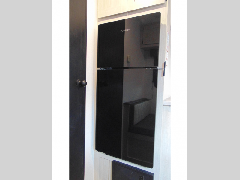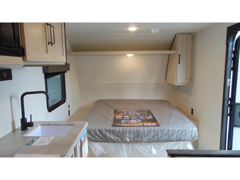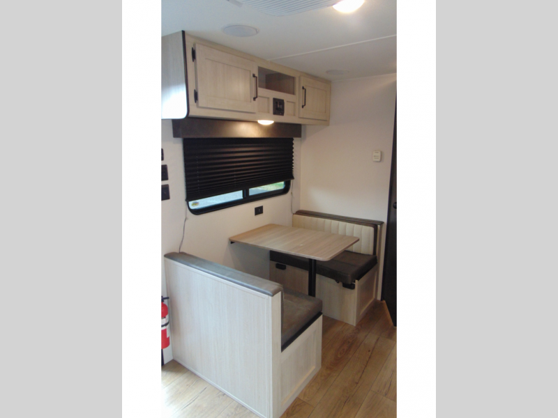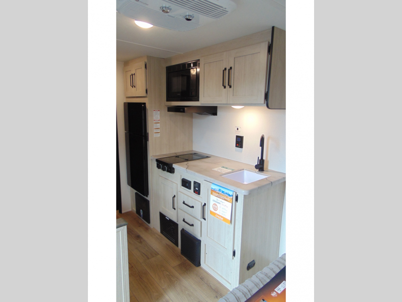 This single axle travel trailer is one you won't want to pass up! There is a front RV queen bed with a bedside shirt closet and overhead shelf for your things, and one more adult or two little ones can sleep on the booth dinette. A full kitchen includes a stainless two burner cooktop and stainless microwave to cook meals each day, and the 4.3 cu. ft. 12V black glass refrigerator will keep your food fresh. This model also includes a full rear bath with a toilet, sink, and 36" x 30" shower for easy cleaning up!