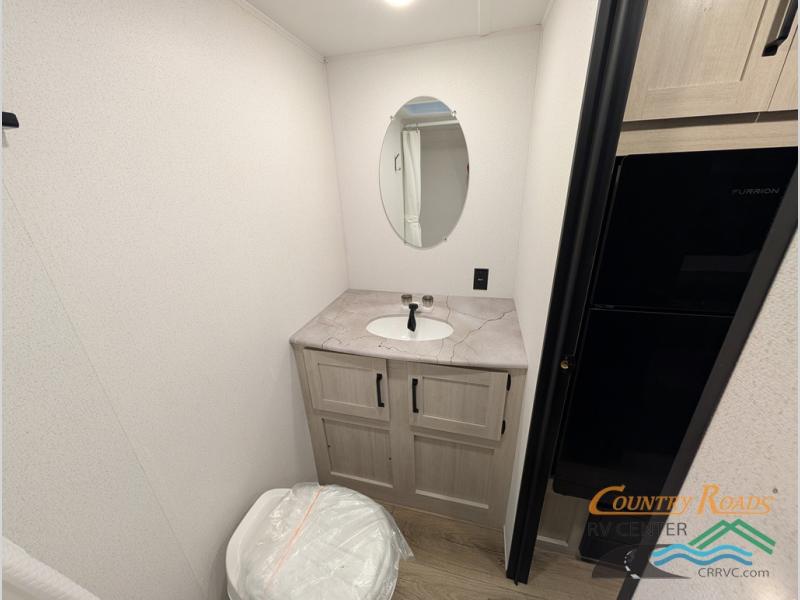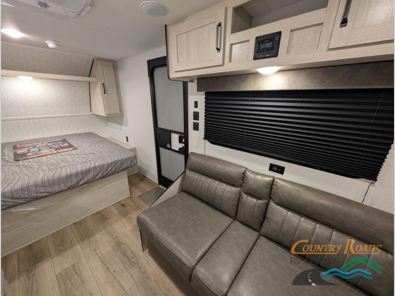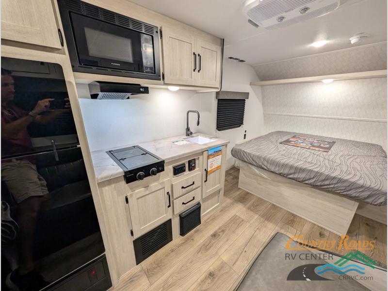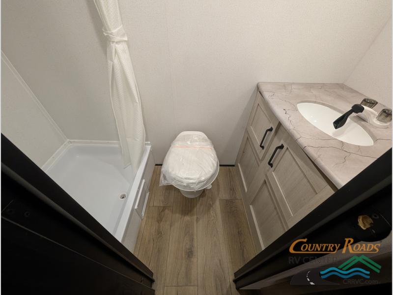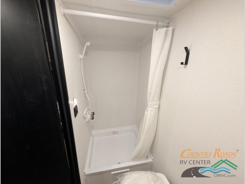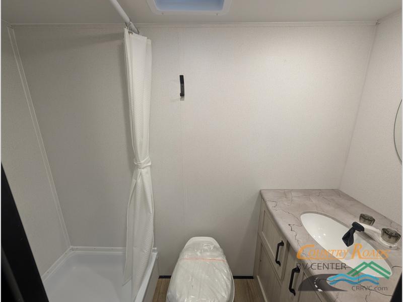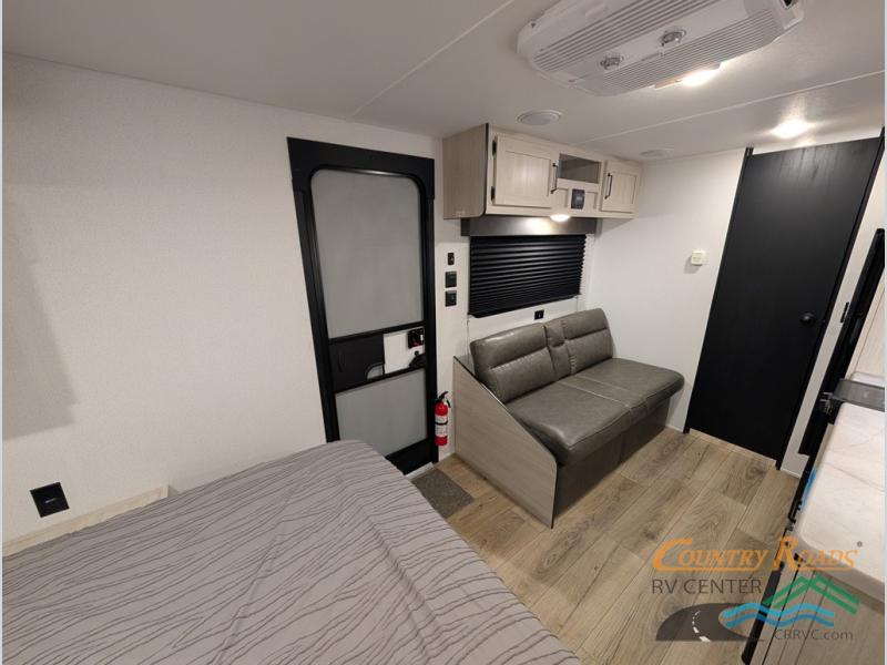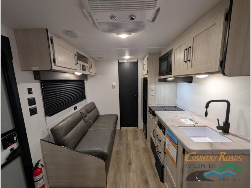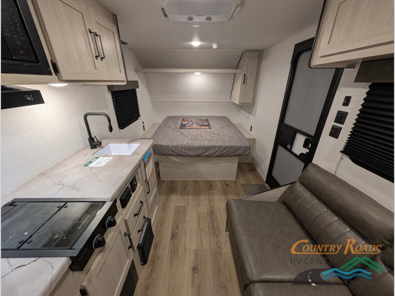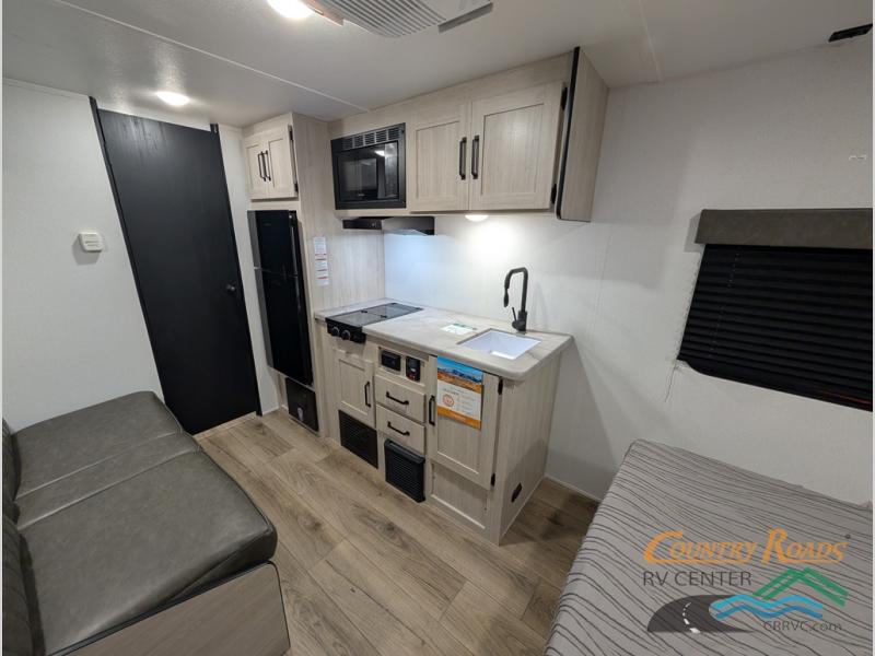 This single axle travel trailer is one you won't want to pass up! There is a front RV queen bed with a bedside shirt closet and overhead shelf for your things, and one more adult or two little ones can sleep on the booth dinette. A full kitchen includes a stainless two burner cooktop and stainless microwave to cook meals each day, and the 4.3 cu. ft. 12V black glass refrigerator will keep your food fresh. This model also includes a full rear bath with a toilet, sink, and 36" x 30" shower for easy cleaning up!