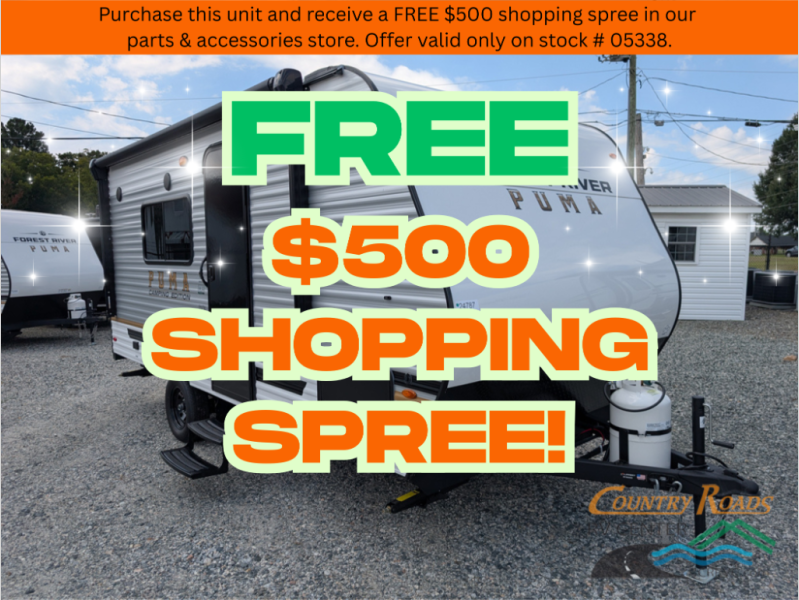 The Puma Camping Edition by Palomino offer an affordable travel trailer for rookie campers or seasoned RVers! They are built with 5/8" tongue and groove plywood flooring and a front diamond plate for added protection. There are also exterior clamp style door latches, back up camera prep, and 20 lb. LP bottles. Head inside to find Thermofoil countertops with a smooth drop edge, bedroom USB ports and outlets, and a GE appliance and kitchen package.