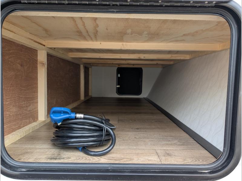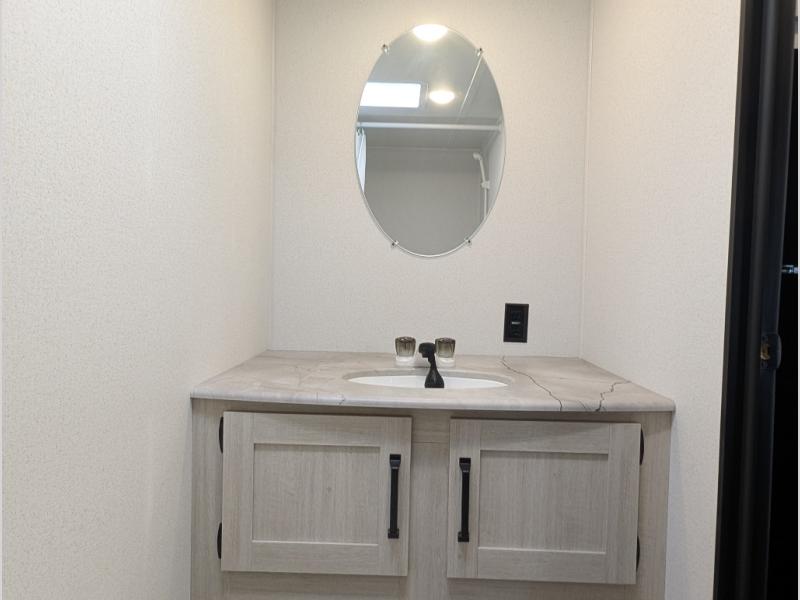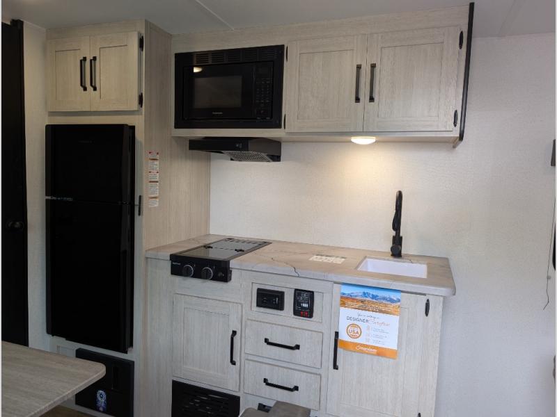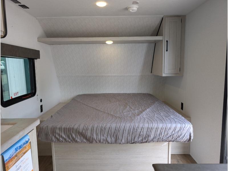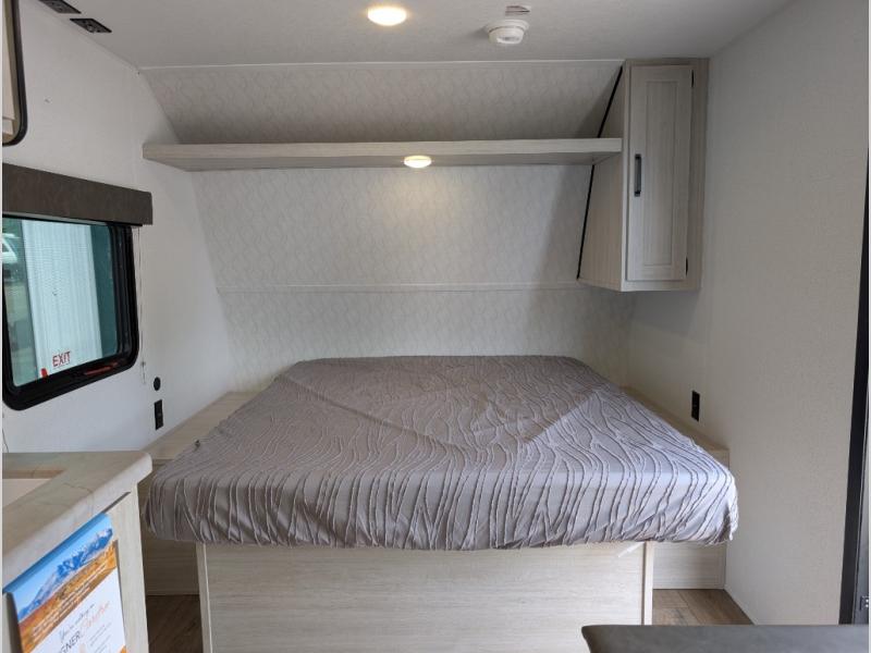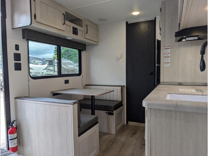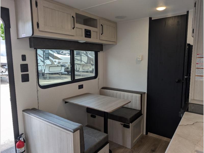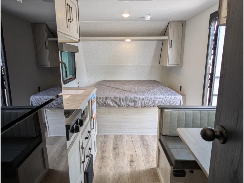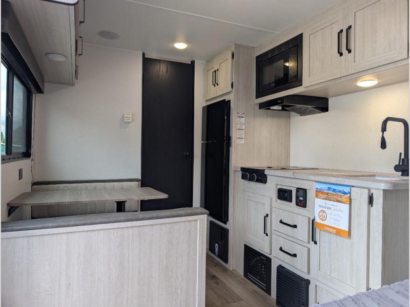 This single axle travel trailer is one you won't want to pass up! There is a front RV queen bed with a bedside shirt closet and overhead shelf for your things, and one more adult or two little ones can sleep on the booth dinette. A full kitchen includes a stainless two burner cooktop and stainless microwave to cook meals each day, and the 4.3 cu. ft. 12V black glass refrigerator will keep your food fresh. This model also includes a full rear bath with a toilet, sink, and 36" x 30" shower for easy cleaning up!