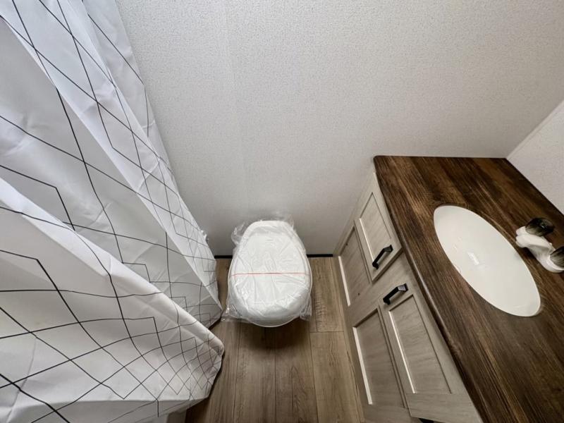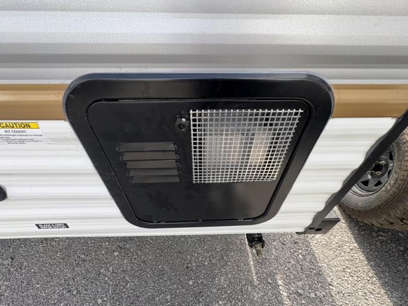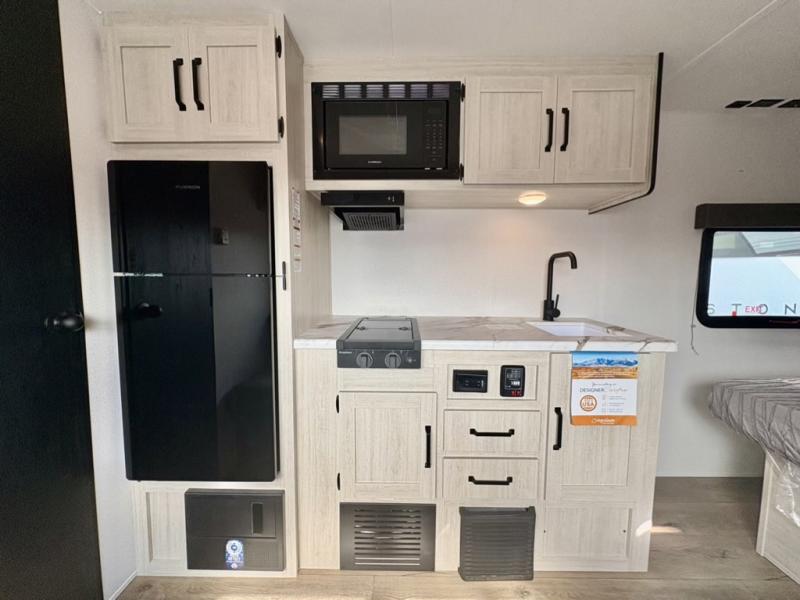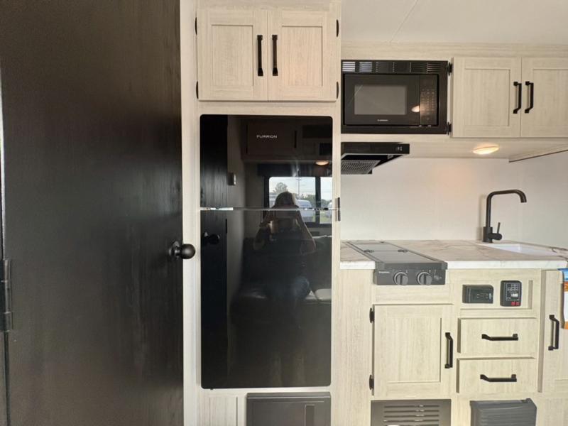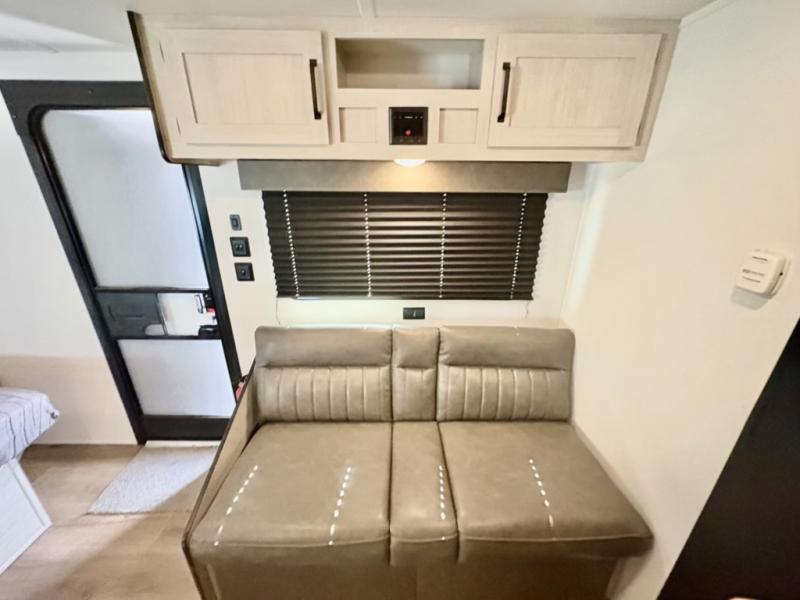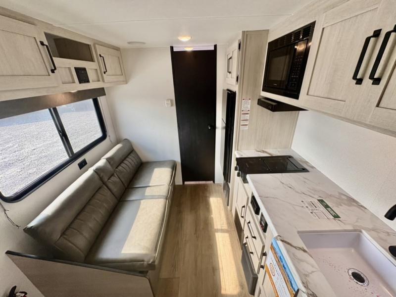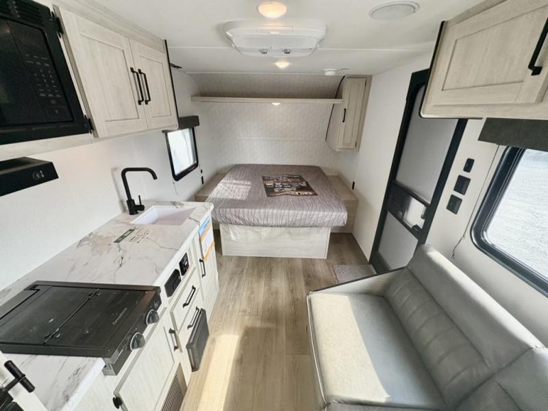 This single axle travel trailer is one you won't want to pass up! There is a front RV queen bed with a bedside shirt closet and overhead shelf for your things, and one more adult or two little ones can sleep on the booth dinette. A full kitchen includes a stainless two burner cooktop and stainless microwave to cook meals each day, and the 4.3 cu. ft. 12V black glass refrigerator will keep your food fresh. This model also includes a full rear bath with a toilet, sink, and 36" x 30" shower for easy cleaning up!