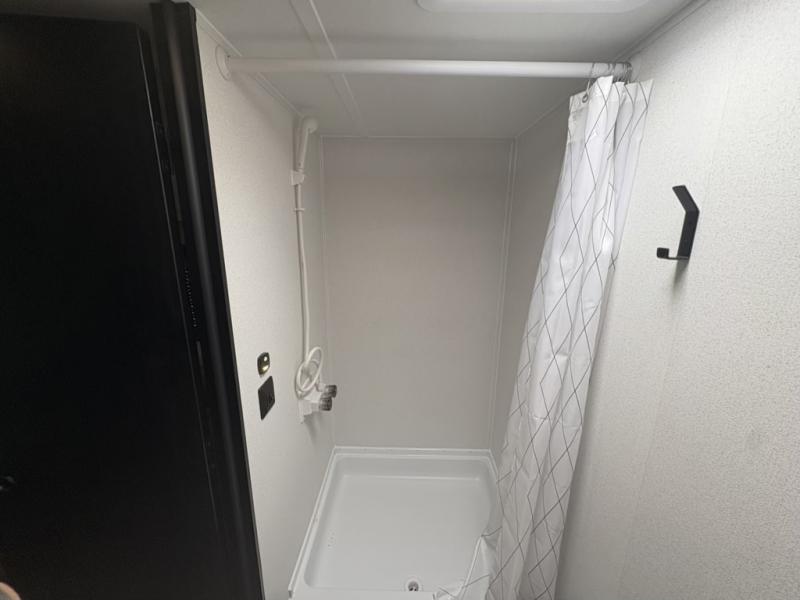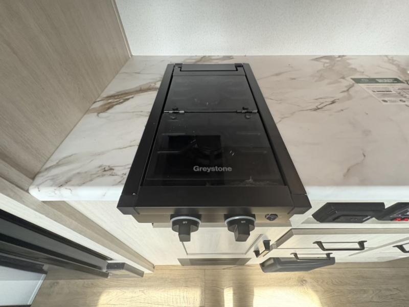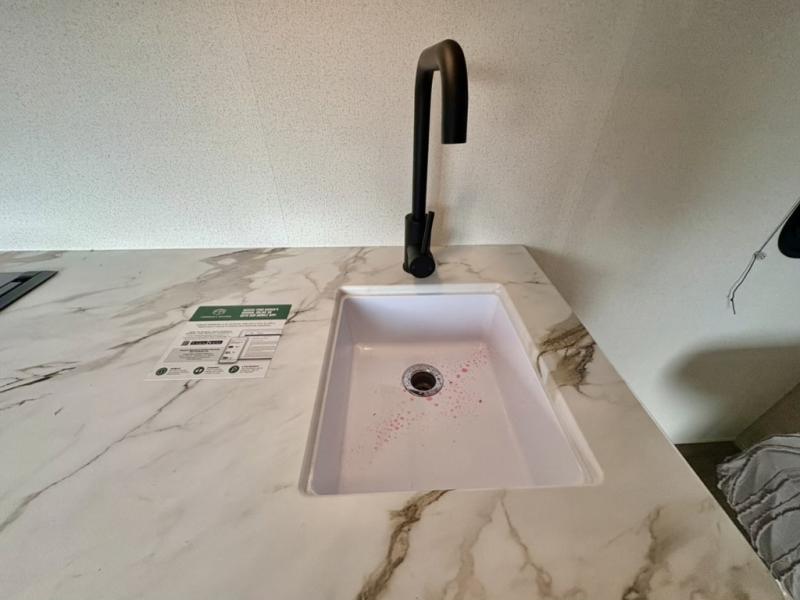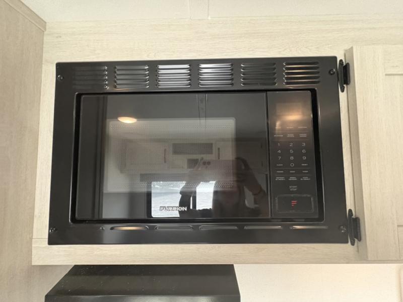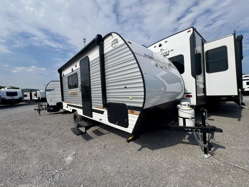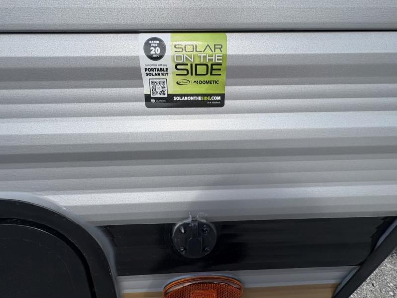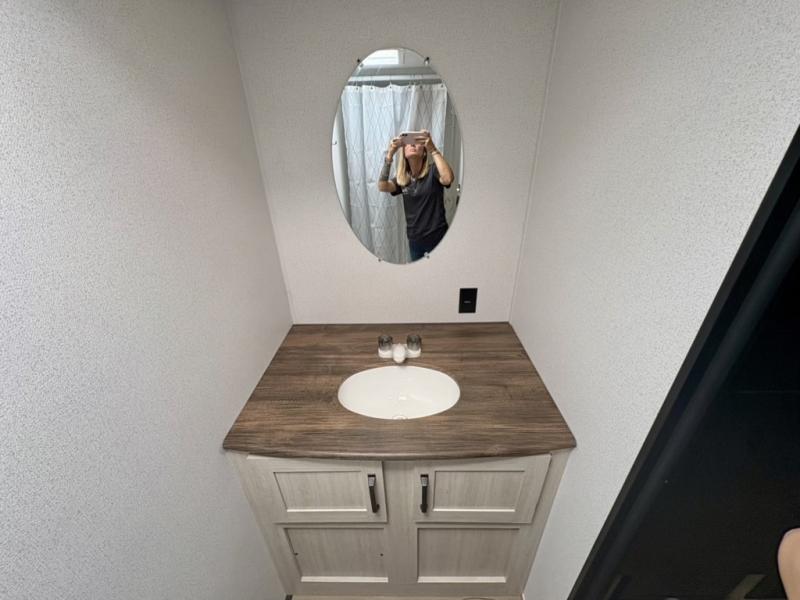This single axle travel trailer is one you won't want to pass up! There is a front RV queen bed with a bedside shirt closet and overhead shelf for your things, and one more adult or two little ones can sleep on the booth dinette. A full kitchen includes a stainless two burner cooktop and stainless microwave to cook meals each day, and the 4.3 cu. ft. 12V black glass refrigerator will keep your food fresh. This model also includes a full rear bath with a toilet, sink, and 36" x 30" shower for easy cleaning up!