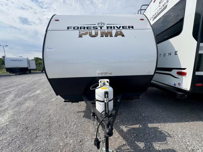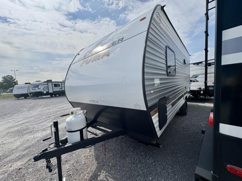 The Puma Camping Edition by Palomino offer an affordable travel trailer for rookie campers or seasoned RVers! They are built with 5/8" tongue and groove plywood flooring and a front diamond plate for added protection. There are also exterior clamp style door latches, back up camera prep, and 20 lb. LP bottles. Head inside to find Thermofoil countertops with a smooth drop edge, bedroom USB ports and outlets, and a GE appliance and kitchen package.