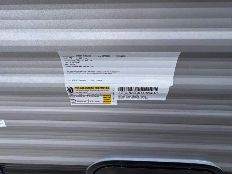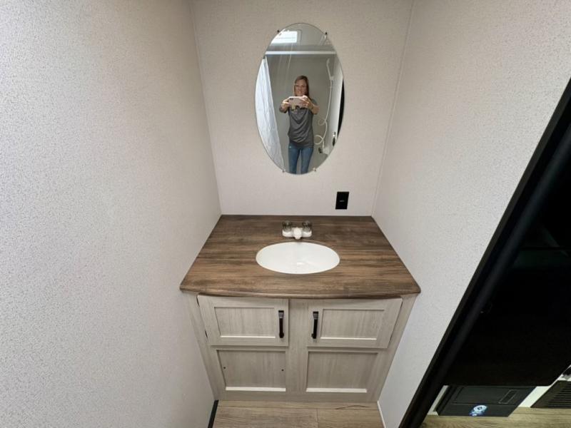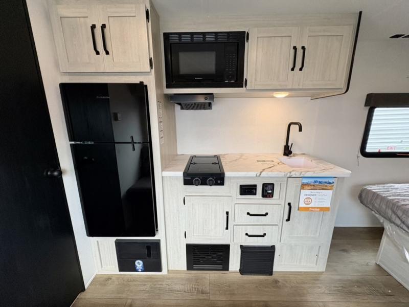 This single axle travel trailer is one you won't want to pass up! There is a front RV queen bed with a bedside shirt closet and overhead shelf for your things, and one more adult or two little ones can sleep on the booth dinette. A full kitchen includes a stainless two burner cooktop and stainless microwave to cook meals each day, and the 4.3 cu. ft. 12V black glass refrigerator will keep your food fresh. This model also includes a full rear bath with a toilet, sink, and 36" x 30" shower for easy cleaning up!