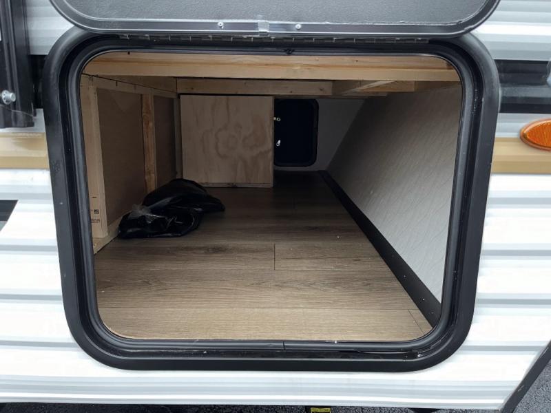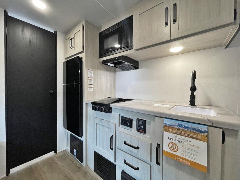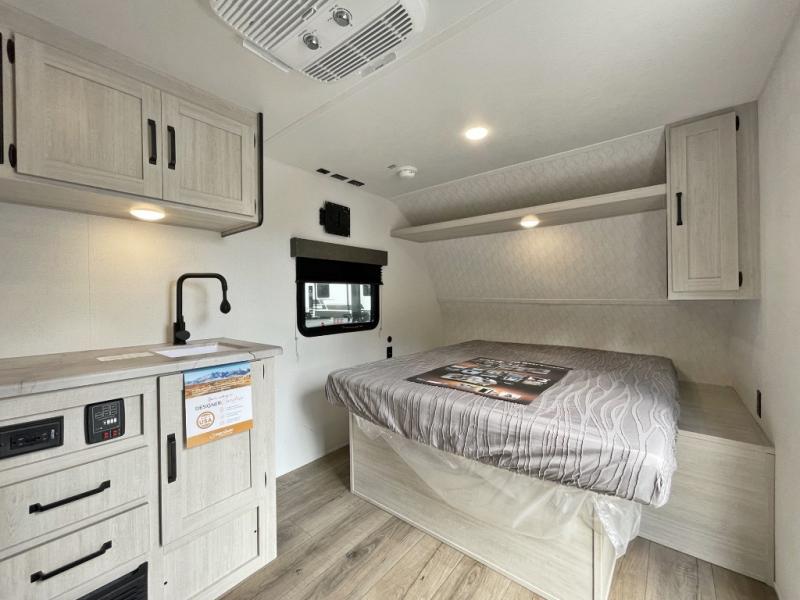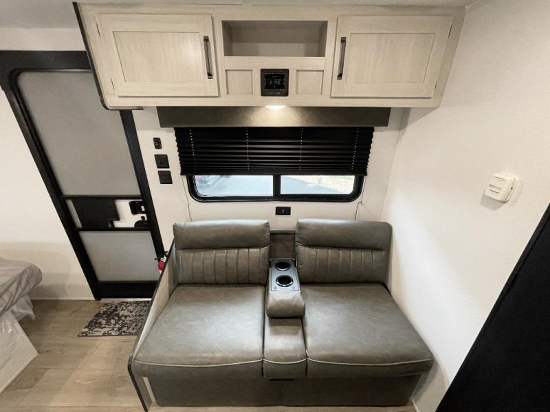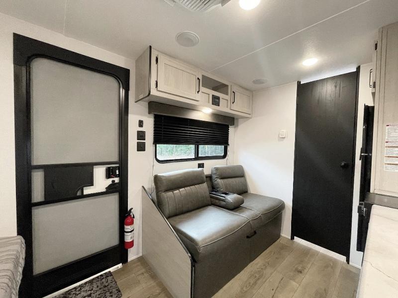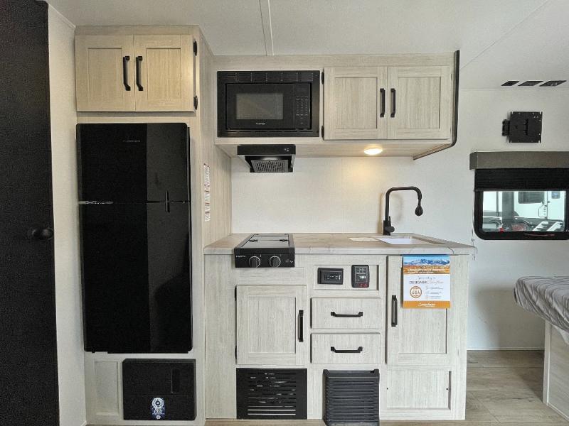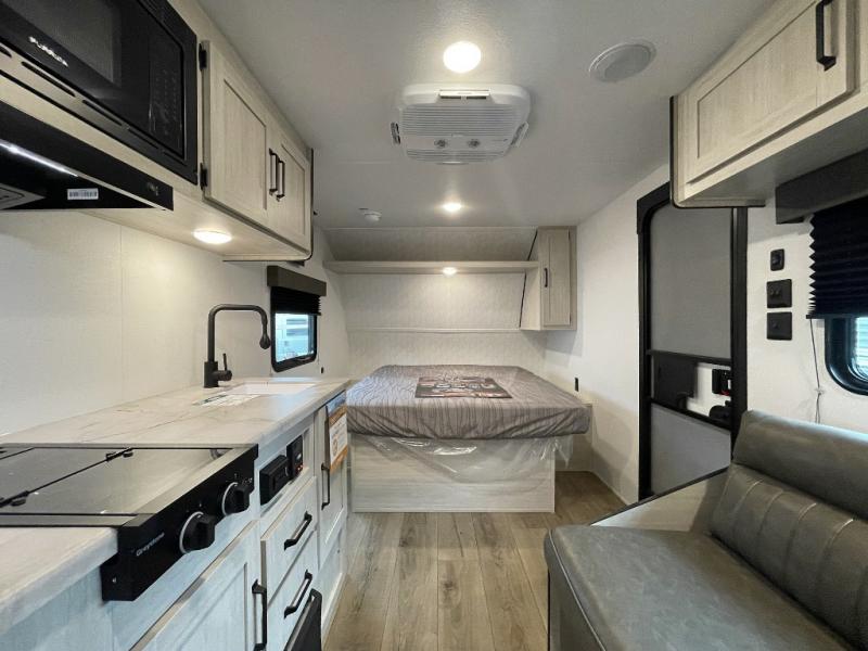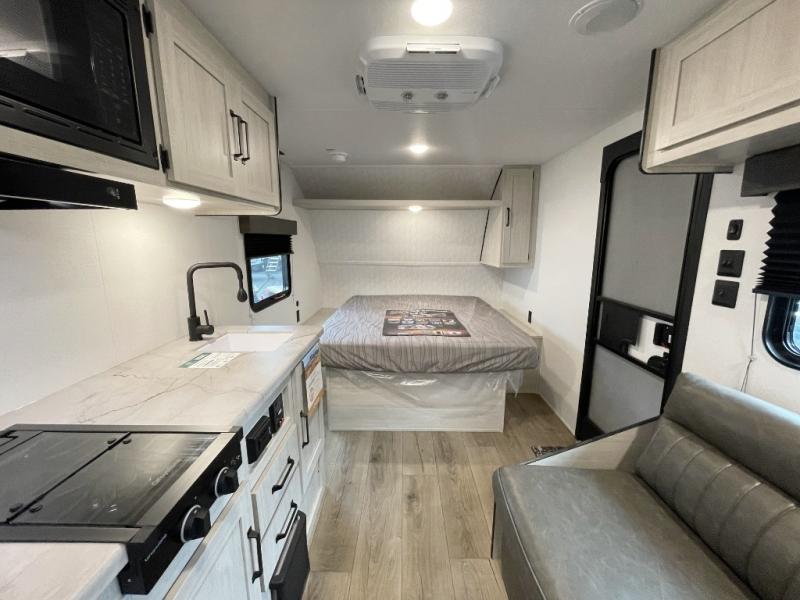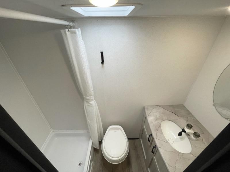 This single axle travel trailer is one you won't want to pass up! There is a front RV queen bed with a bedside shirt closet and overhead shelf for your things, and one more adult or two little ones can sleep on the booth dinette. A full kitchen includes a stainless two burner cooktop and stainless microwave to cook meals each day, and the 4.3 cu. ft. 12V black glass refrigerator will keep your food fresh. This model also includes a full rear bath with a toilet, sink, and 36" x 30" shower for easy cleaning up!