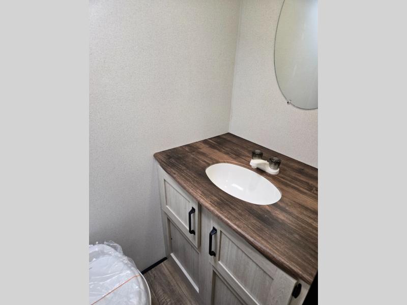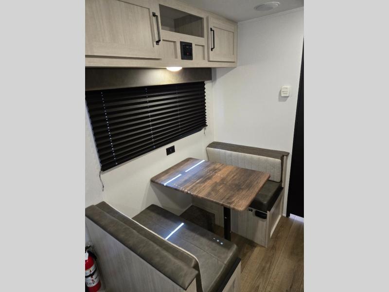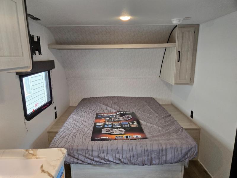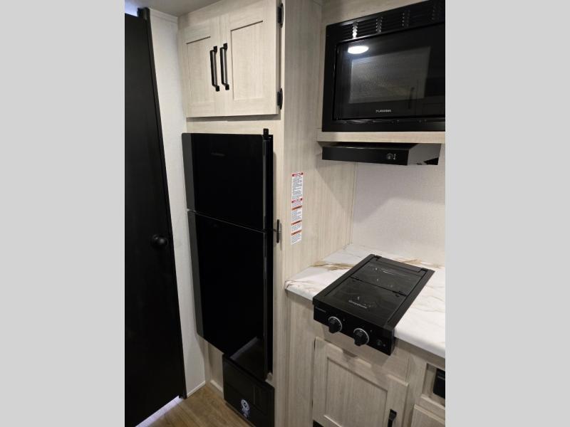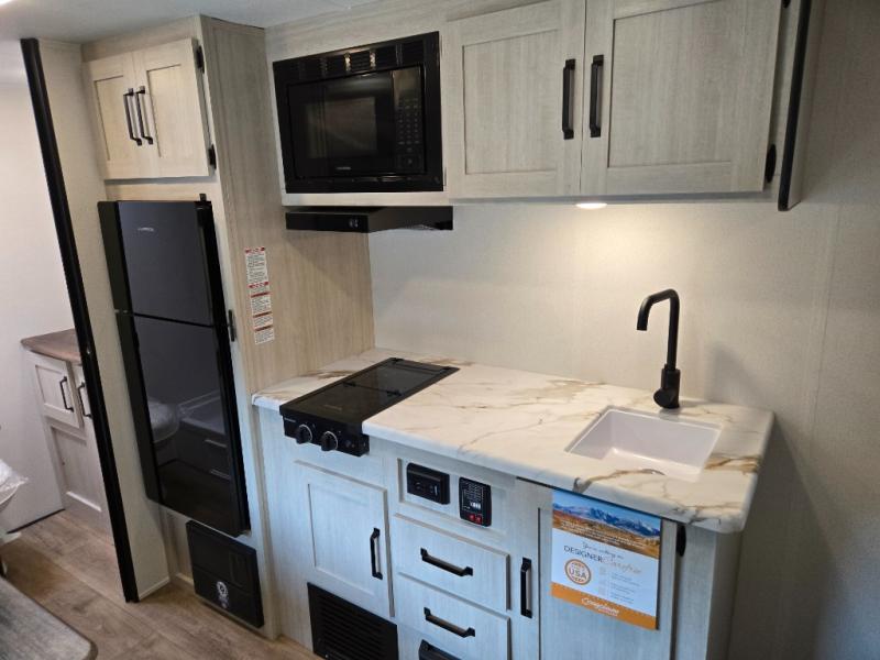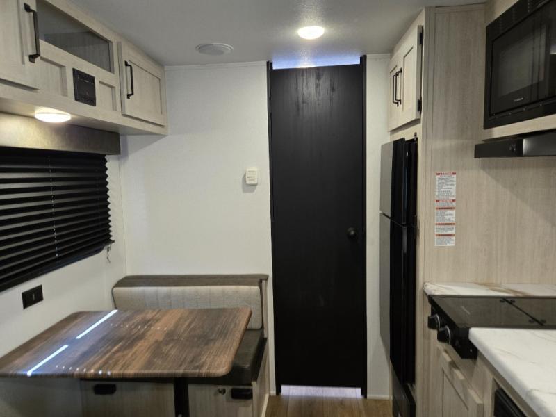 This single axle travel trailer is one you won't want to pass up! There is a front RV queen bed with a bedside shirt closet and overhead shelf for your things, and one more adult or two little ones can sleep on the booth dinette. A full kitchen includes a stainless two burner cooktop and stainless microwave to cook meals each day, and the 4.3 cu. ft. 12V black glass refrigerator will keep your food fresh. This model also includes a full rear bath with a toilet, sink, and 36" x 30" shower for easy cleaning up!