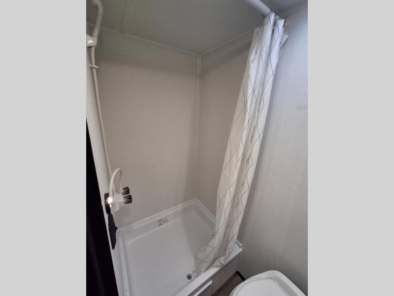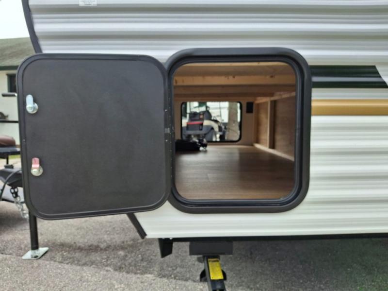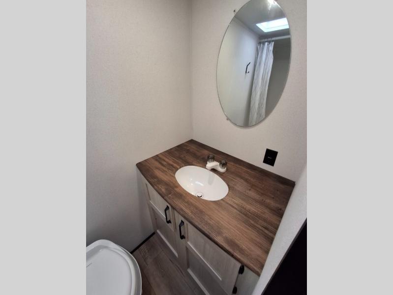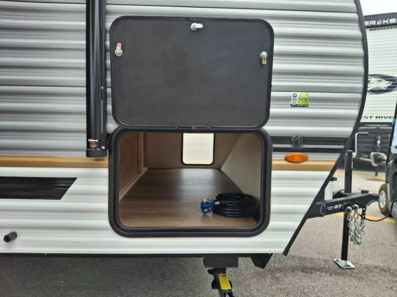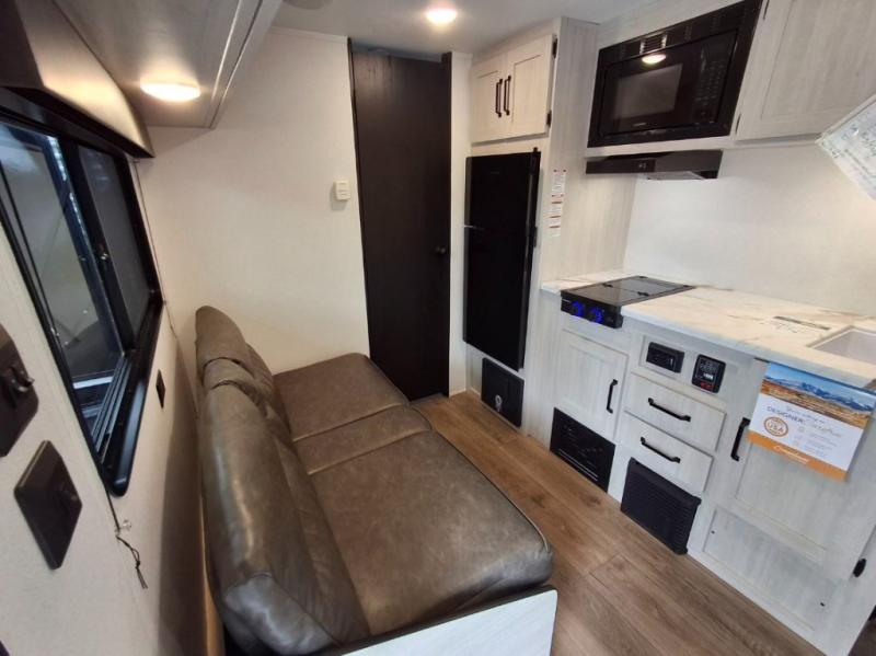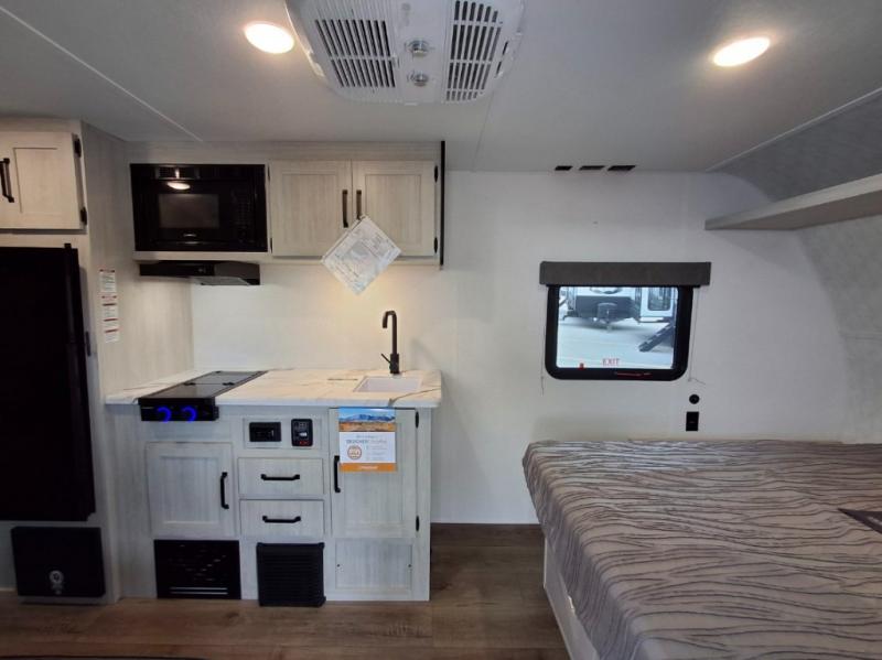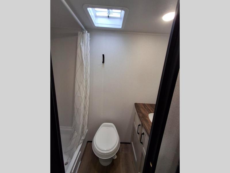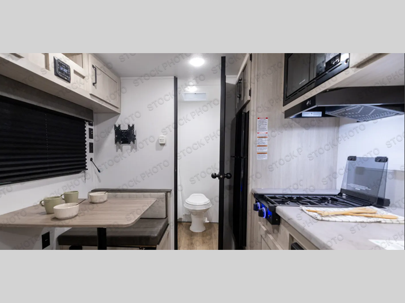 This single axle travel trailer is one you won't want to pass up! There is a front RV queen bed with a bedside shirt closet and overhead shelf for your things, and one more adult or two little ones can sleep on the booth dinette. A full kitchen includes a stainless two burner cooktop and stainless microwave to cook meals each day, and the 4.3 cu. ft. 12V black glass refrigerator will keep your food fresh. This model also includes a full rear bath with a toilet, sink, and 36" x 30" shower for easy cleaning up!