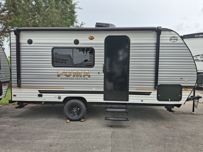 The Puma Camping Edition by Palomino offer an affordable travel trailer for rookie campers or seasoned RVers! They are built with 5/8" tongue and groove plywood flooring and a front diamond plate for added protection. There are also exterior clamp style door latches, back up camera prep, and 20 lb. LP bottles. Head inside to find Thermofoil countertops with a smooth drop edge, bedroom USB ports and outlets, and a GE appliance and kitchen package.