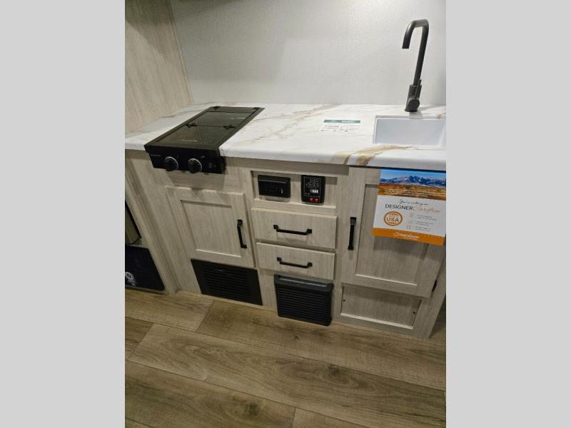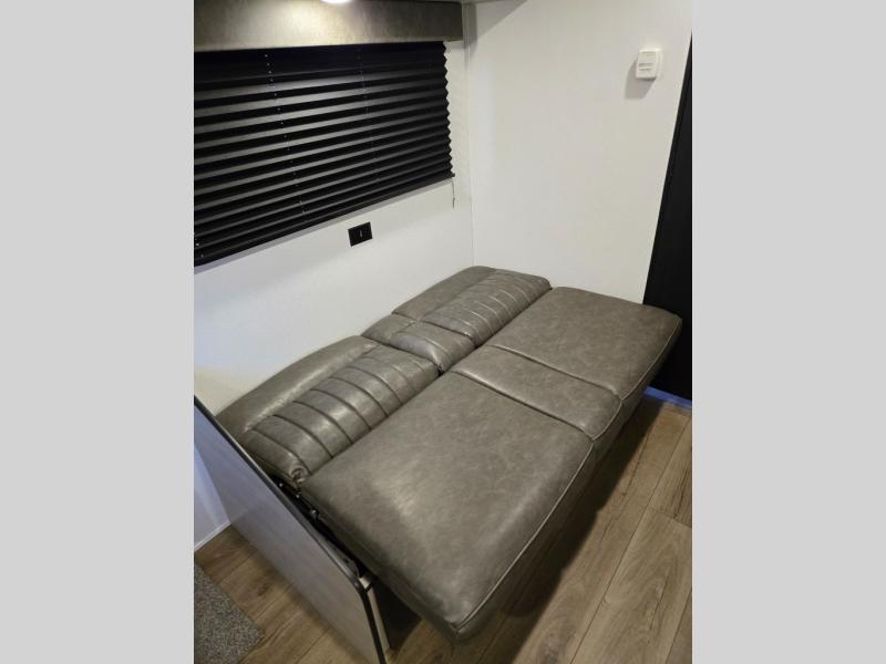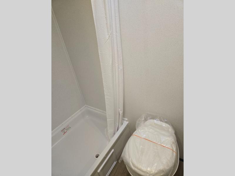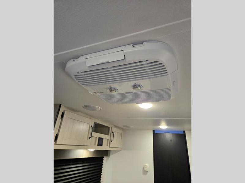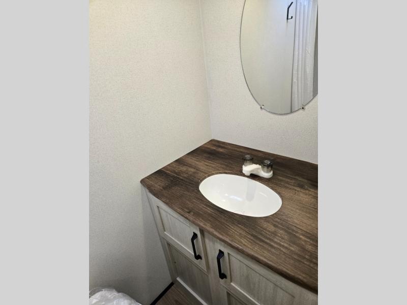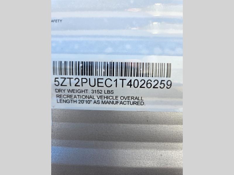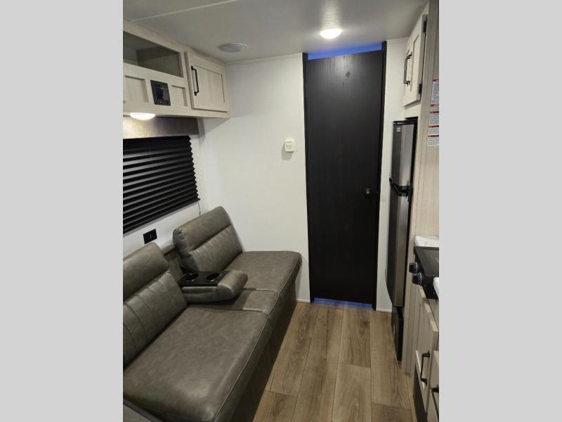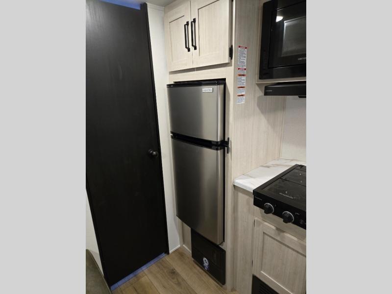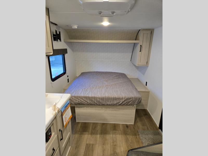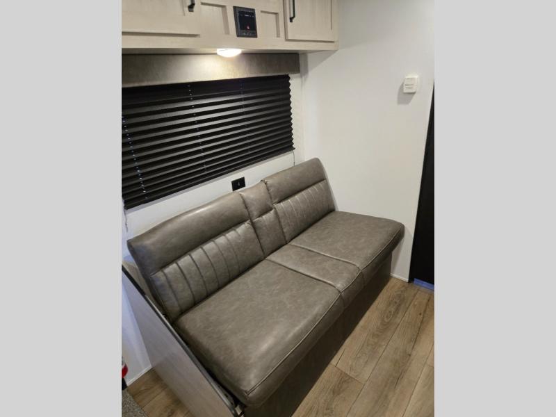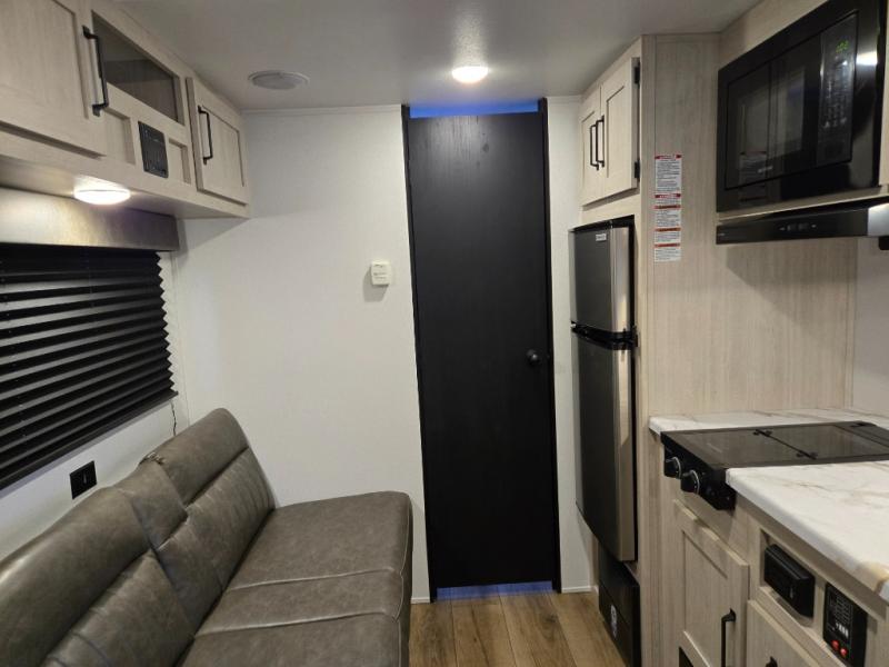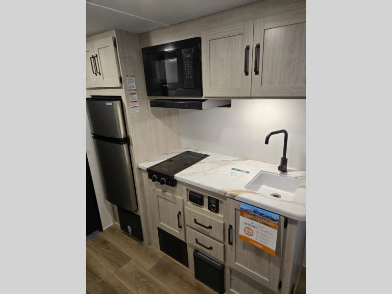 This single axle travel trailer is one you won't want to pass up! There is a front RV queen bed with a bedside shirt closet and overhead shelf for your things, and one more adult or two little ones can sleep on the booth dinette. A full kitchen includes a stainless two burner cooktop and microwave to cook meals each day, and the 12V black glass refrigerator will keep your food fresh. This model also includes a full rear bath with a toilet, sink, and 36" x 30" shower for easy cleaning up!