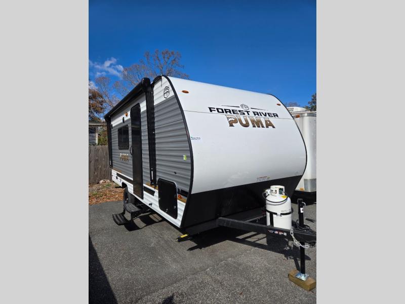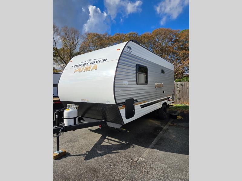 The Puma Camping Edition by Forest River offer an affordable travel trailer for rookie campers or seasoned RVers! They are built with 5/8" tongue and groove plywood flooring and a front diamond plate for added protection. There are also exterior magnetic baggage door latches, back up camera prep, a battery disconnect. Head inside to find Thermofoil countertops with a smooth drop edge, bedroom USB ports and outlets, and pleated shades in the living room.