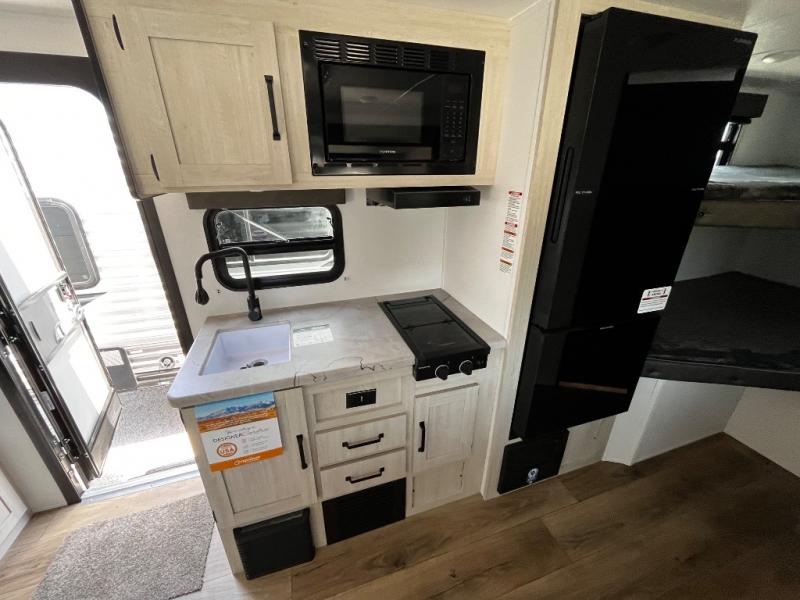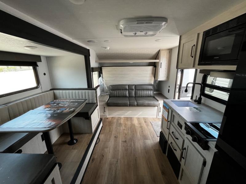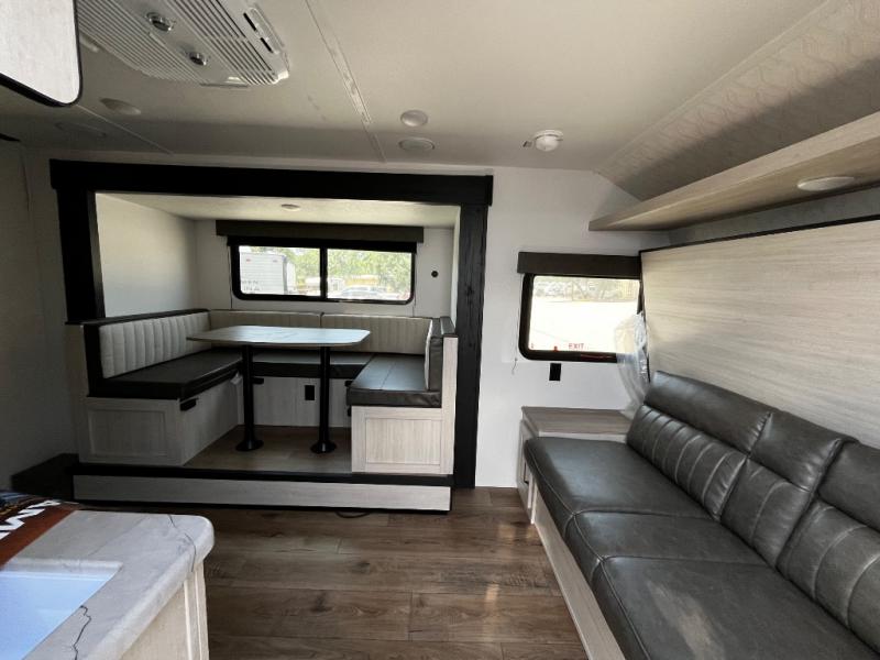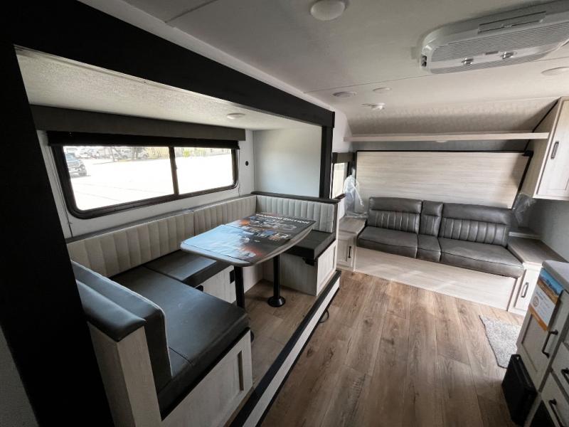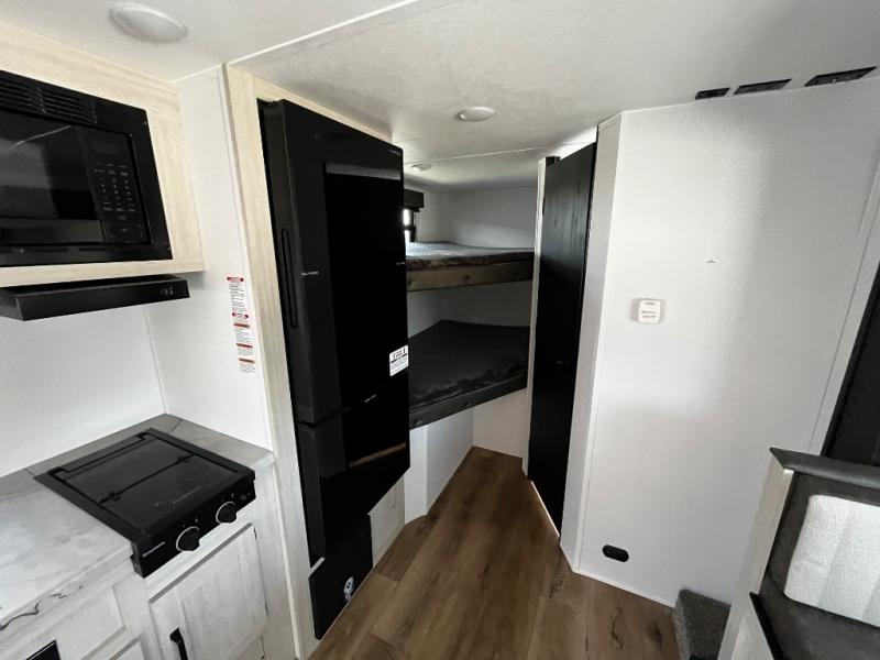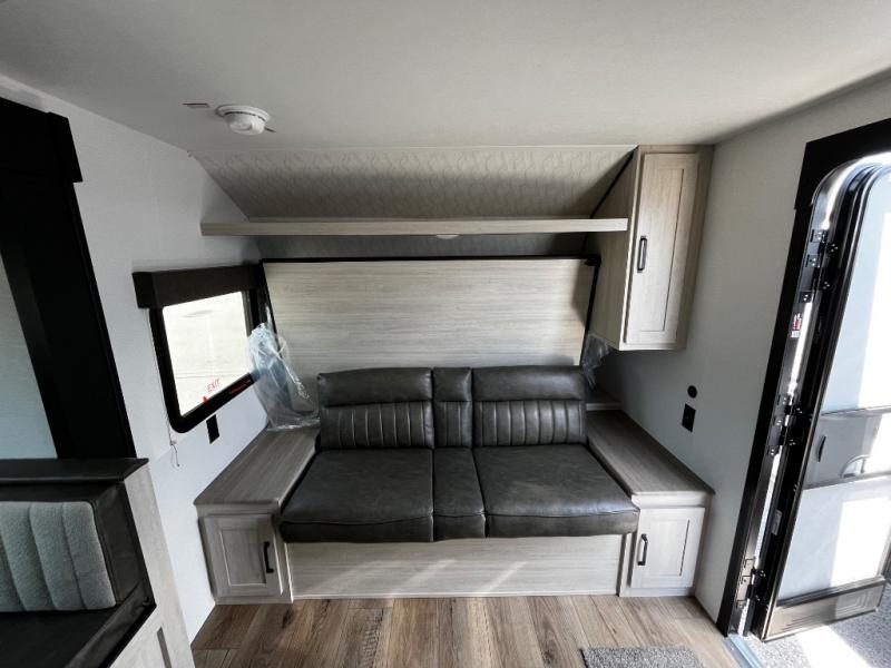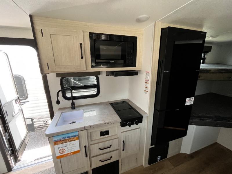 The whole gang will love camping in this travel trailer since there are double-size bunks for compact sleeping spaces and a slide out for more space to relax! The front RV queen bed is sure to provide a great night's rest, and you can choose the optional Murphy bed if you're needing more seating space during the day. Once you've made dinner on the two burner cooktop, you can dine around the U-shaped dinette. And an optional mini kitchen with a griddle is available if you'd rather cook outdoors! This unit includes ample storage space for your things, including exterior storage and storage under the bunks!