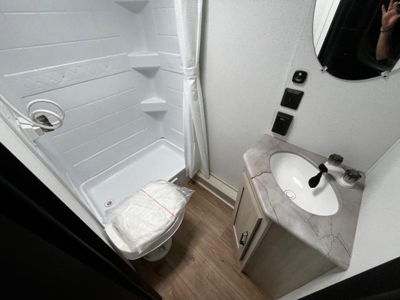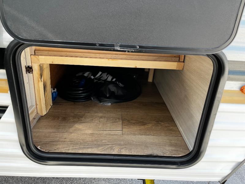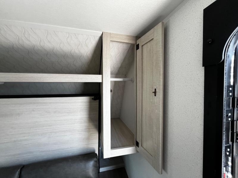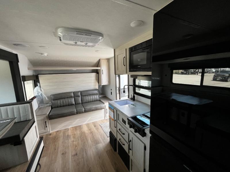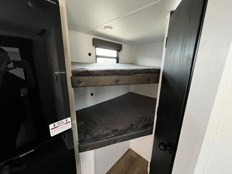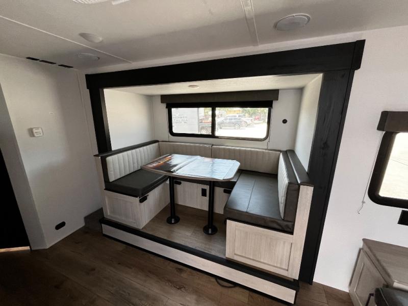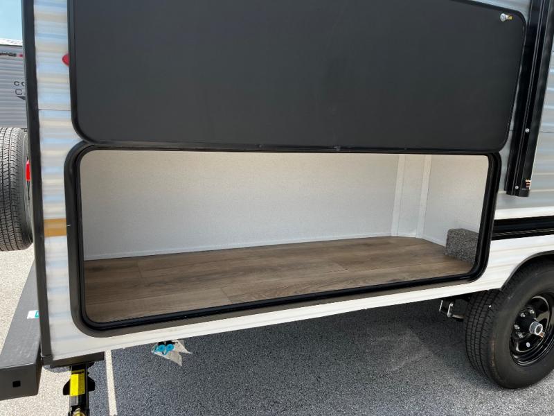 The whole gang will love camping in this travel trailer since there are double-size bunks for compact sleeping spaces and a slide out for more space to relax! The front RV queen bed is sure to provide a great night's rest, and you can choose the optional Murphy bed if you're needing more seating space during the day. Once you've made dinner on the two burner cooktop, you can dine around the U-shaped dinette. And an optional mini kitchen with a griddle is available if you'd rather cook outdoors! This unit includes ample storage space for your things, including exterior storage and storage under the bunks!