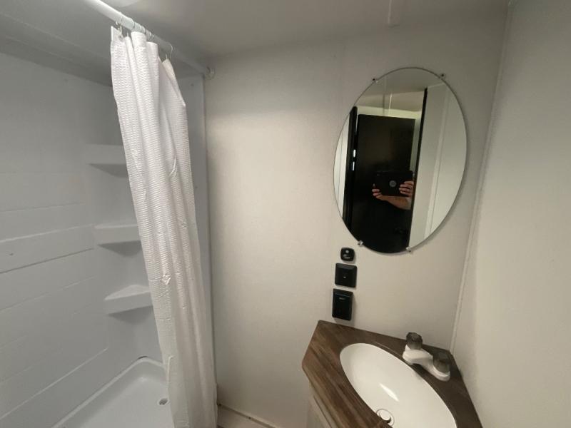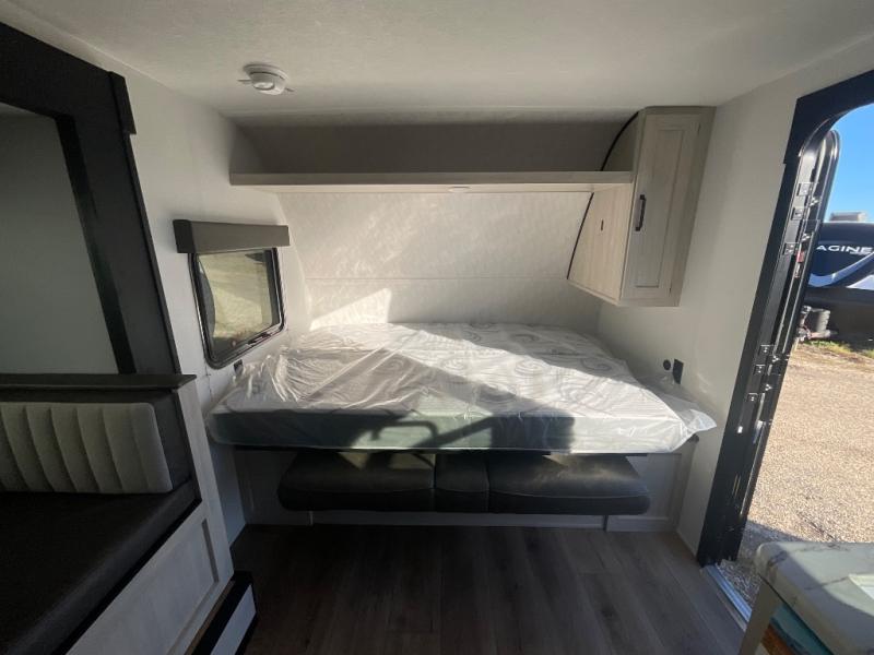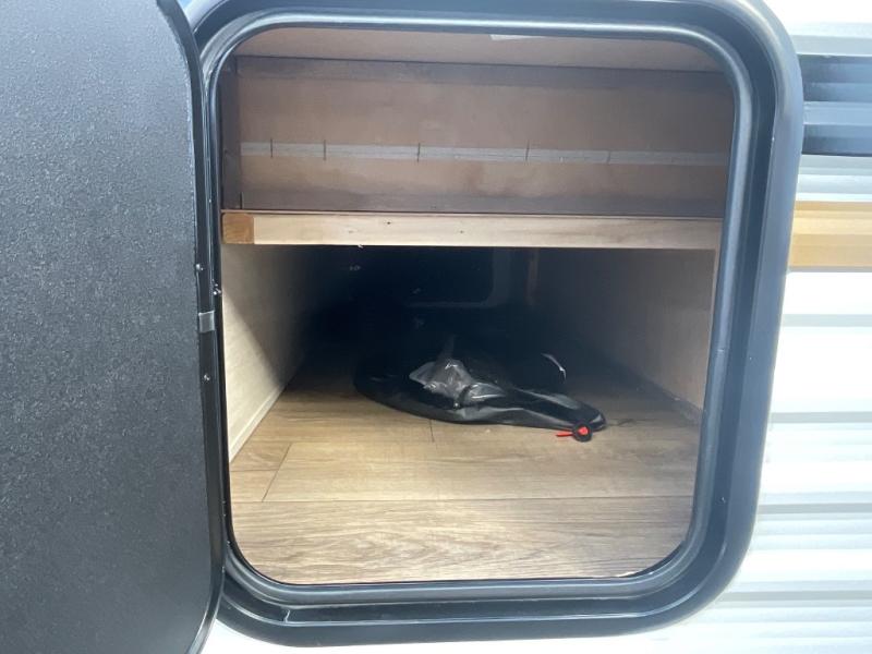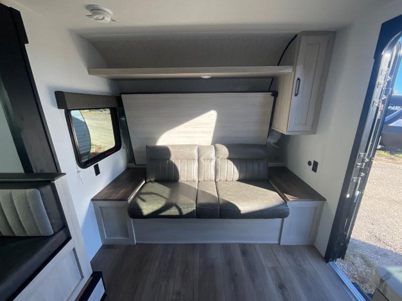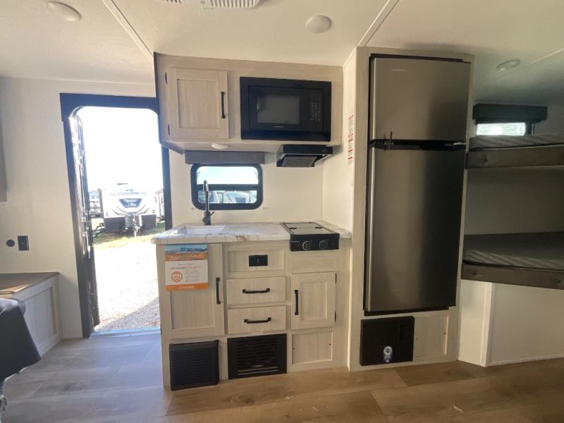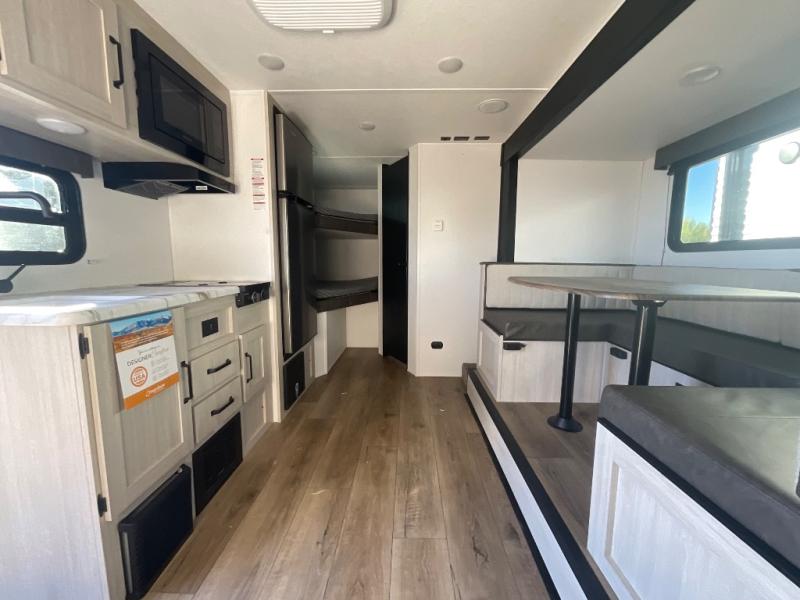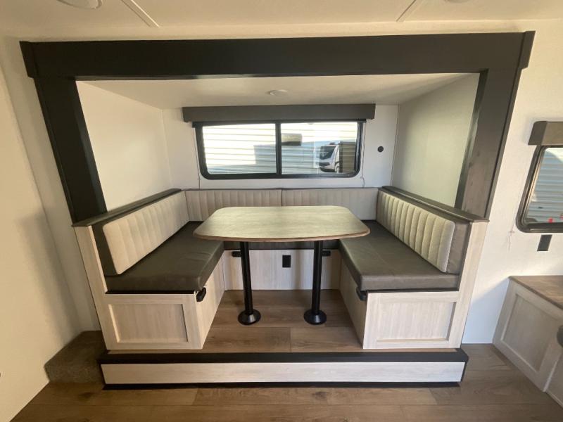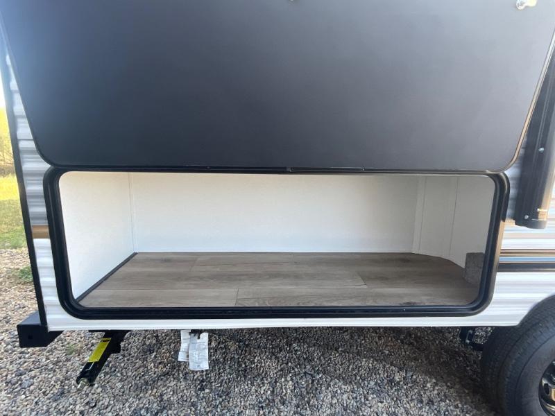 The whole gang will love camping in this travel trailer since there are double-size bunks for compact sleeping spaces and a slide out for more space to relax! The front RV queen bed is sure to provide a great night's rest, and you can choose the optional Murphy bed if you're needing more seating space during the day. Once you've made dinner on the two-burner cooktop, you can dine around the U-shaped dinette. And an optional mini kitchen with a griddle is available if you'd rather cook outdoors! This unit includes ample storage space for your things, including exterior storage and storage under the bunks!