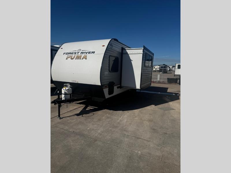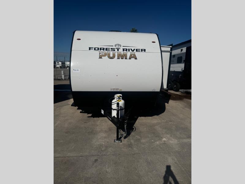 The Puma Camping Edition by Forest River offer an affordable travel trailer for rookie campers or seasoned RVers! They are built with 5/8" tongue and groove plywood flooring and a front diamond plate for added protection. There are also exterior magnetic baggage door latches, back up camera prep, a battery disconnect. Head inside to find Thermofoil countertops with a smooth drop edge, bedroom USB ports and outlets, and pleated shades in the living room.