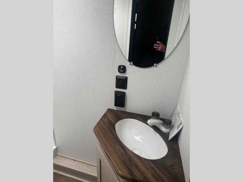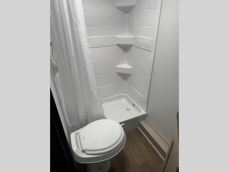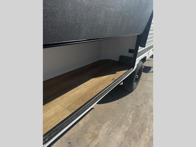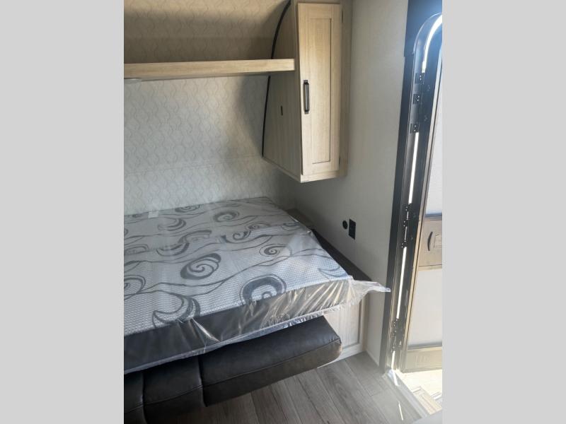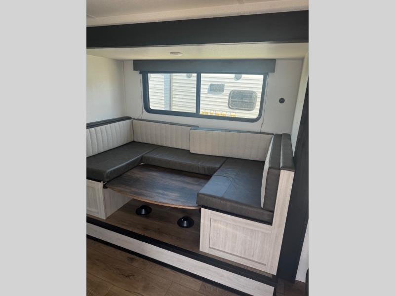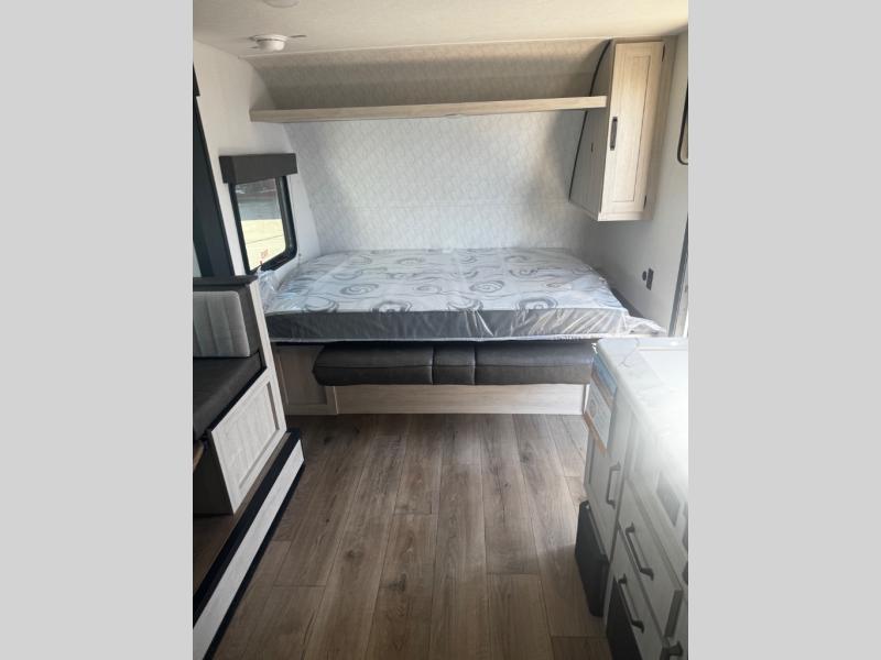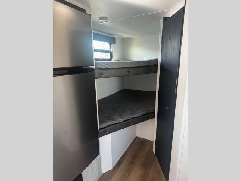 The whole gang will love camping in this travel trailer since there are double-size bunks for compact sleeping spaces and a slide out for more space to relax! The front RV queen bed is sure to provide a great night's rest, and you can choose the optional Murphy bed if you're needing more seating space during the day. Once you've made dinner on the two-burner cooktop, you can dine around the U-shaped dinette. And an optional mini kitchen with a griddle is available if you'd rather cook outdoors! This unit includes ample storage space for your things, including exterior storage and storage under the bunks!