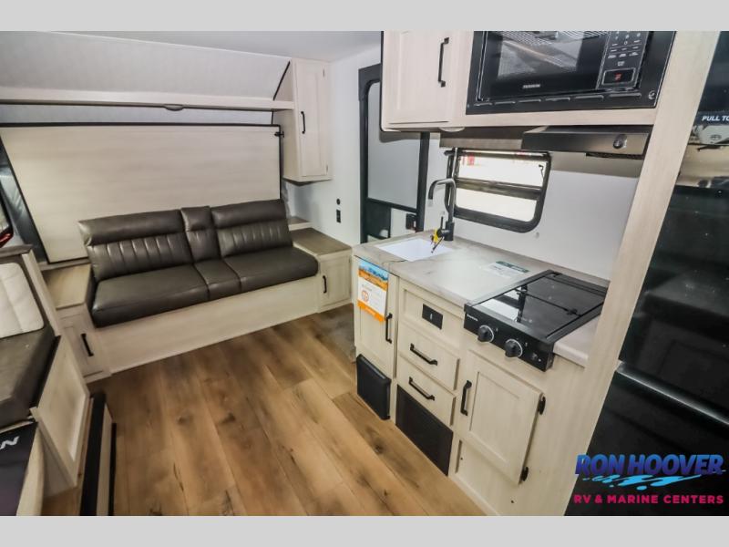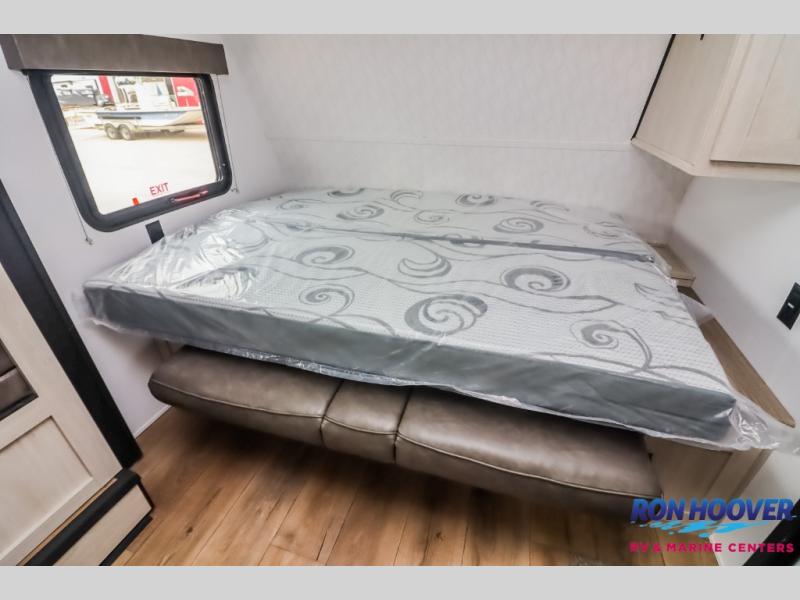 The whole gang will love camping in this travel trailer since there are double-size bunks for compact sleeping spaces and a slide out for more space to relax! The front RV queen bed is sure to provide a great night's rest, and you can choose the optional Murphy bed if you're needing more seating space during the day. Once you've made dinner on the two burner cooktop, you can dine around the U-shaped dinette. And an optional mini kitchen with a griddle is available if you'd rather cook outdoors! This unit includes ample storage space for your things, including exterior storage and storage under the bunks!