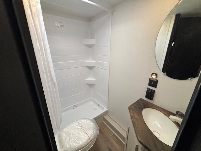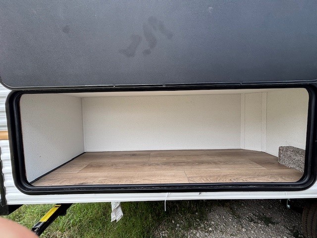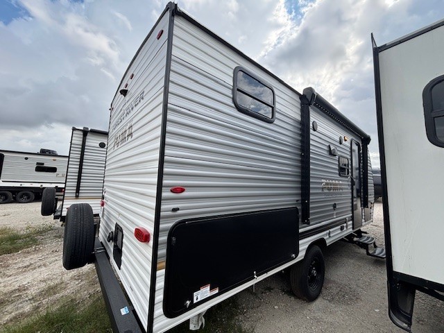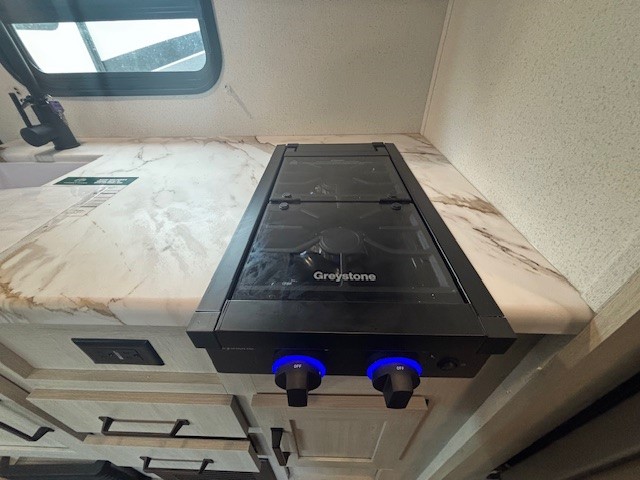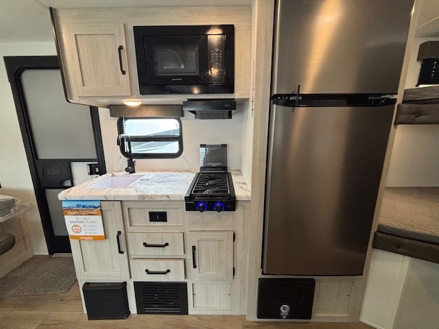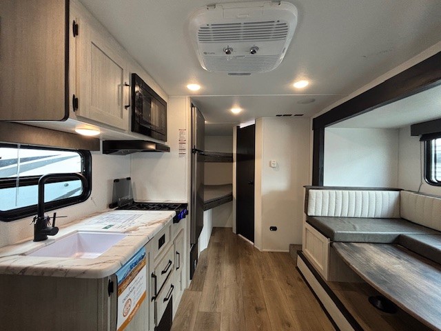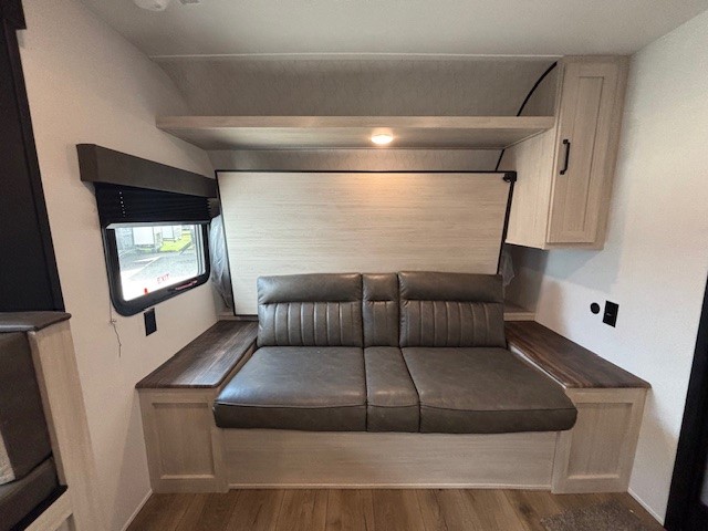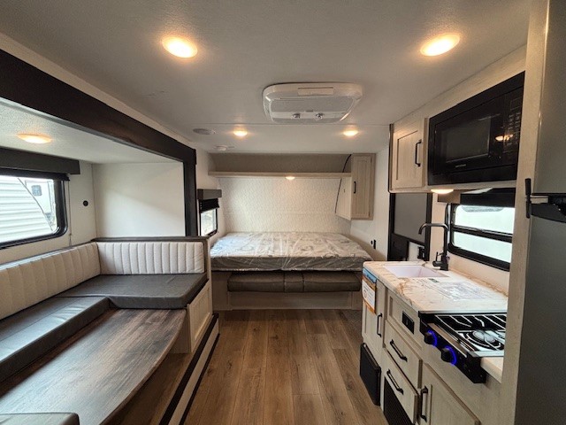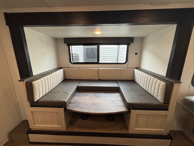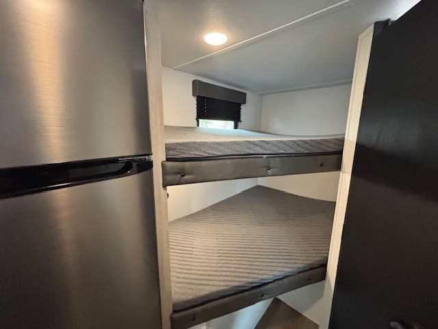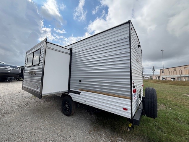 The whole gang will love camping in this travel trailer since there are double-size bunks for compact sleeping spaces and a slide out for more space to relax! The front RV queen bed is sure to provide a great night's rest, and you can choose the optional Murphy bed if you're needing more seating space during the day. Once you've made dinner on the two-burner cooktop, you can dine around the U-shaped dinette. And an optional mini kitchen with a griddle is available if you'd rather cook outdoors! This unit includes ample storage space for your things, including exterior storage and storage under the bunks!