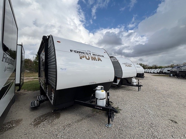 The Puma Camping Edition by Forest River offer an affordable travel trailer for rookie campers or seasoned RVers! They are built with 5/8" tongue and groove plywood flooring and a front diamond plate for added protection. There are also exterior magnetic baggage door latches, back up camera prep, a battery disconnect. Head inside to find Thermofoil countertops with a smooth drop edge, bedroom USB ports and outlets, and pleated shades in the living room.