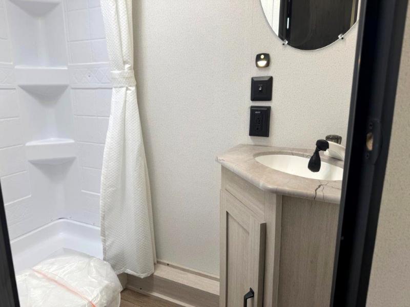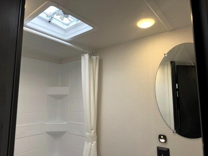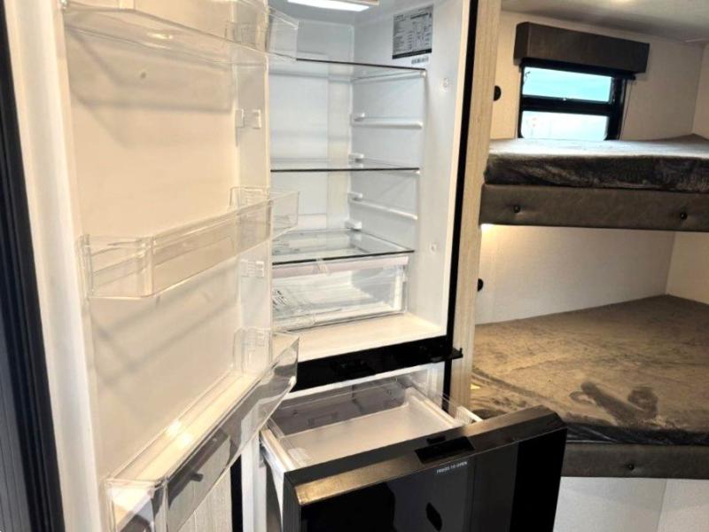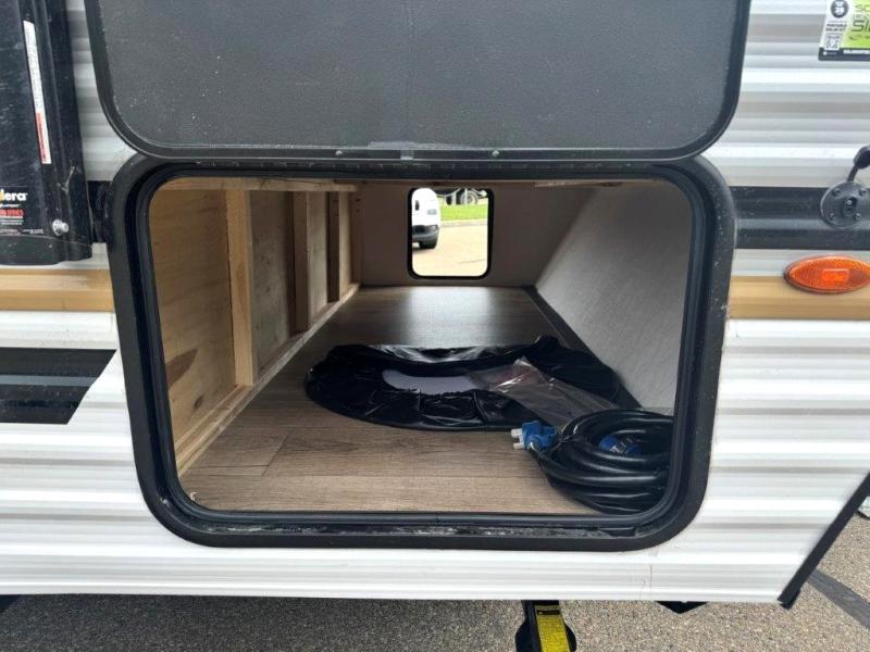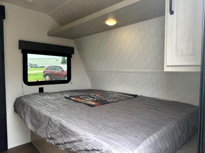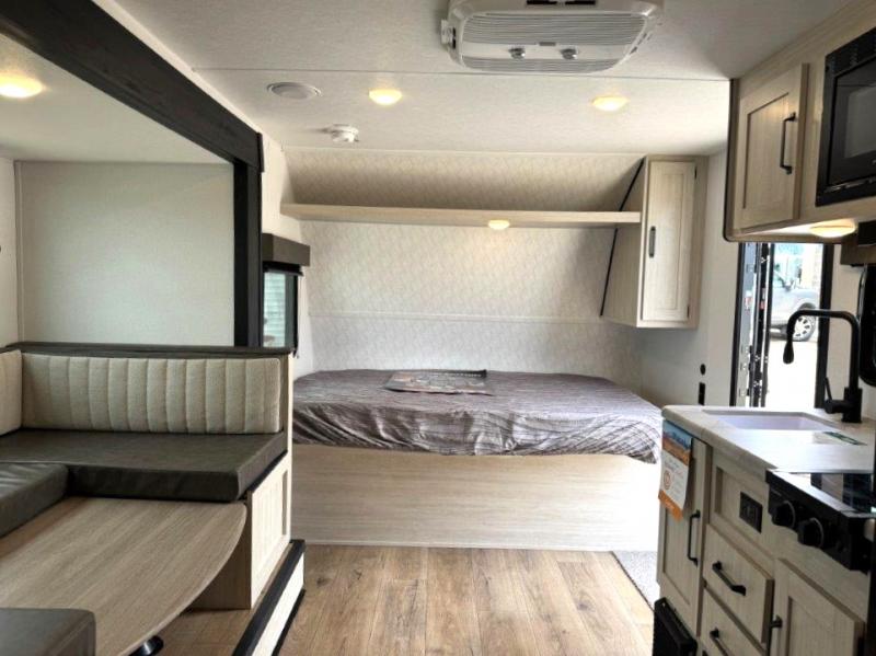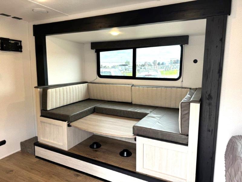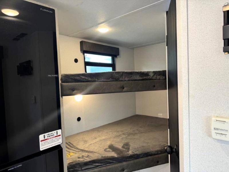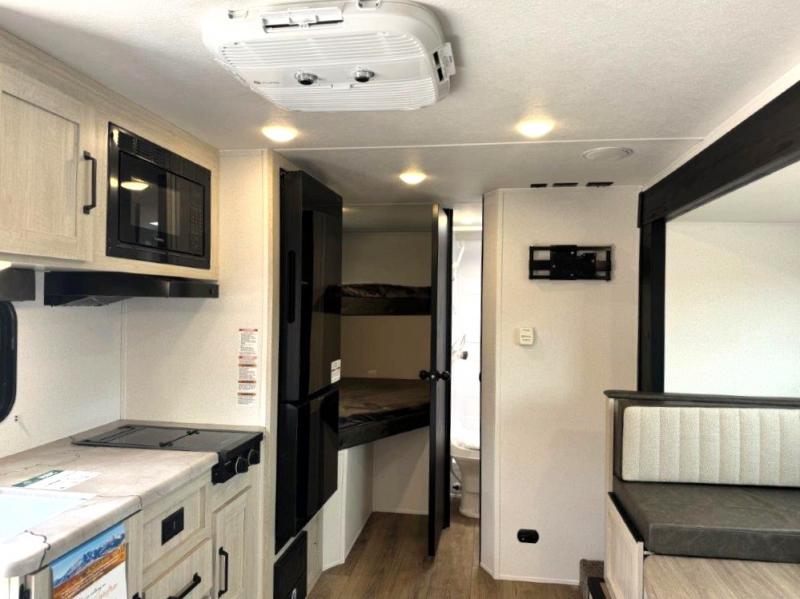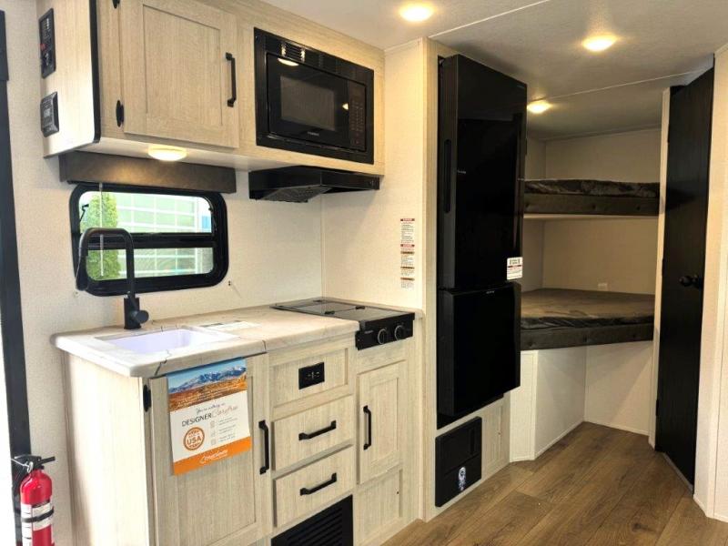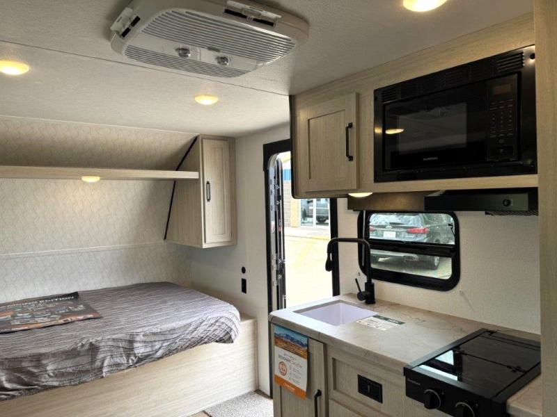 The whole gang will love camping in this travel trailer since there are double-size bunks for compact sleeping spaces and a slide out for more space to relax! The front RV queen bed is sure to provide a great night's rest, and you can choose the optional Murphy bed if you're needing more seating space during the day. Once you've made dinner on the two burner cooktop, you can dine around the U-shaped dinette. And an optional mini kitchen with a griddle is available if you'd rather cook outdoors! This unit includes ample storage space for your things, including exterior storage and storage under the bunks!