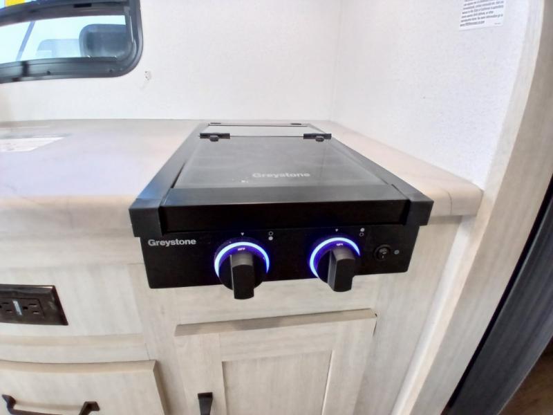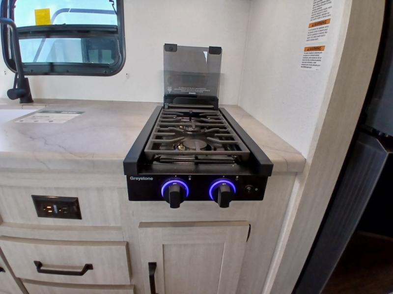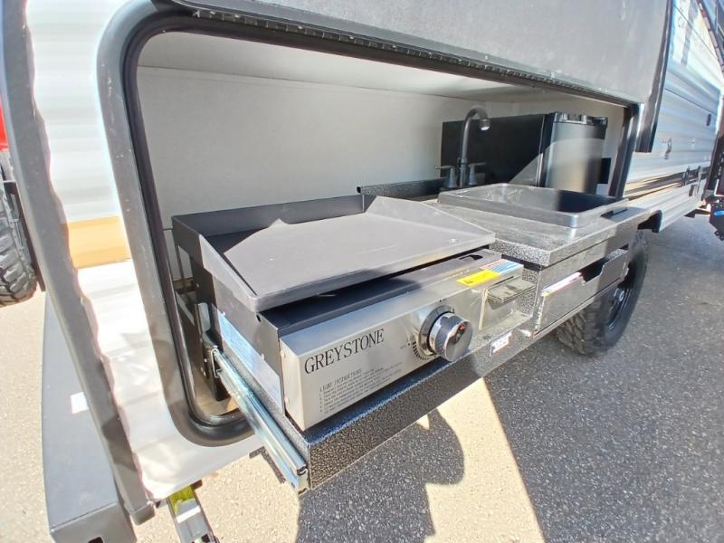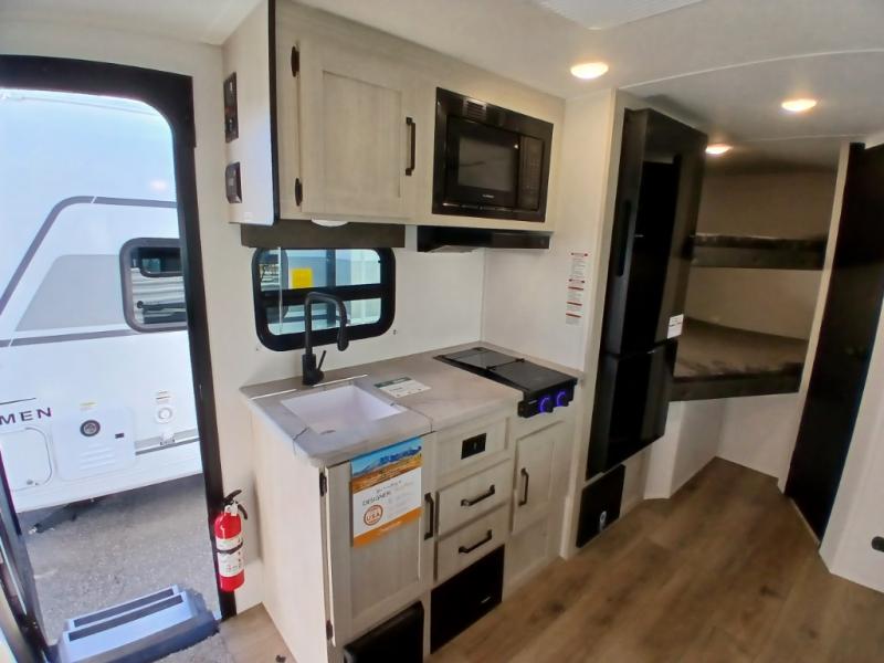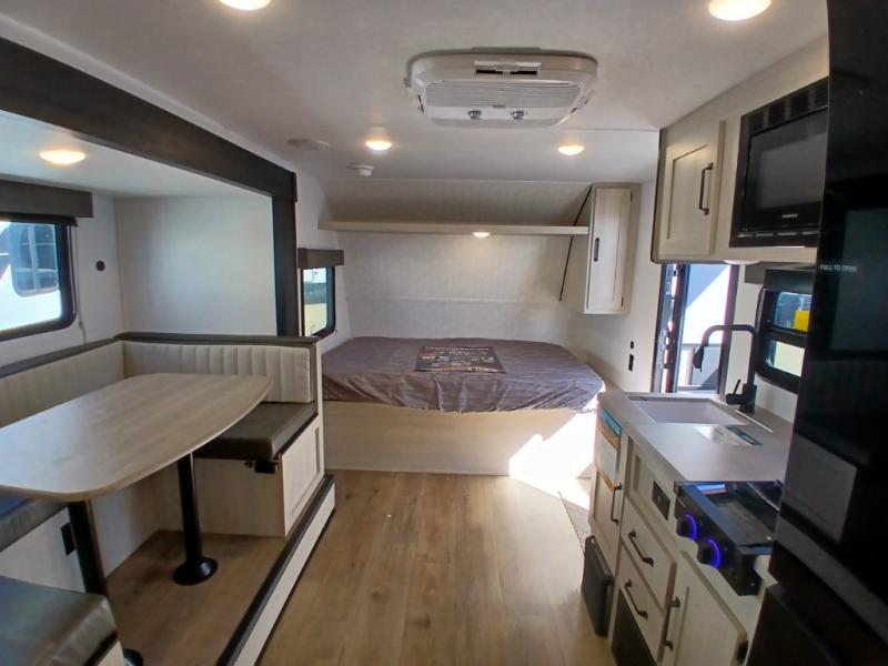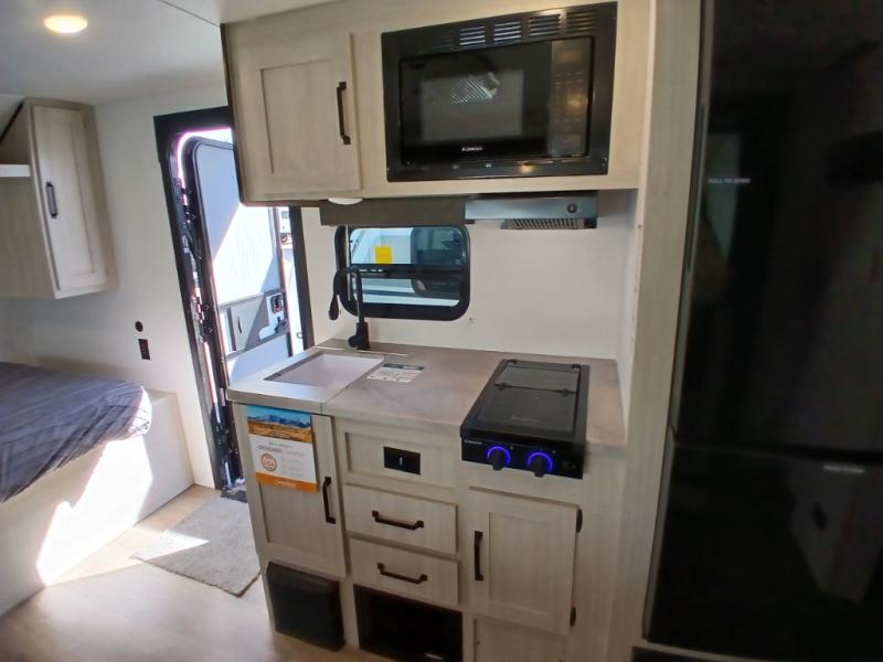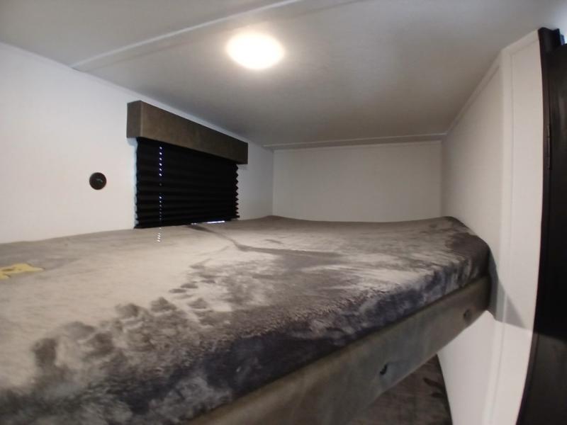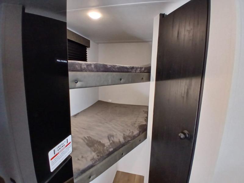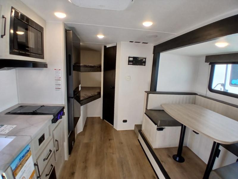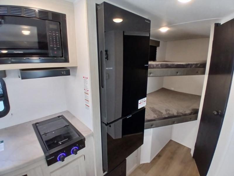 The whole gang will love camping in this travel trailer since there are double-size bunks for compact sleeping spaces and a slide out for more space to relax! The front RV queen bed is sure to provide a great night's rest, and you can choose the optional Murphy bed if you're needing more seating space during the day. Once you've made dinner on the two burner cooktop, you can dine around the U-shaped dinette. And an optional mini kitchen with a griddle is available if you'd rather cook outdoors! This unit includes ample storage space for your things, including exterior storage and storage under the bunks!