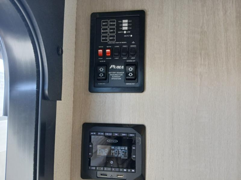 The Puma Camping Edition by Palomino offer an affordable travel trailer for rookie campers or seasoned RVers! They are built with 5/8" tongue and groove plywood flooring and a front diamond plate for added protection. There are also exterior clamp style door latches, back up camera prep, and 20 lb. LP bottles. Head inside to find Thermofoil countertops with a smooth drop edge, bedroom USB ports and outlets, and a GE appliance and kitchen package.