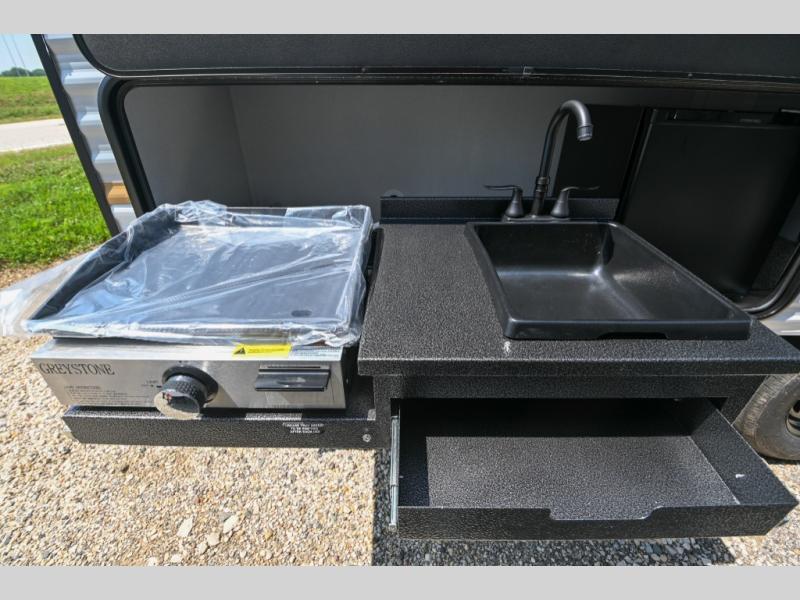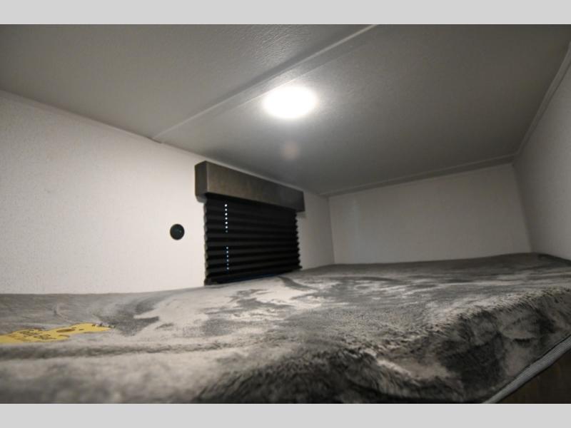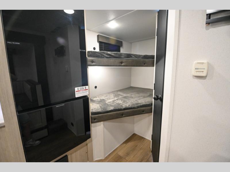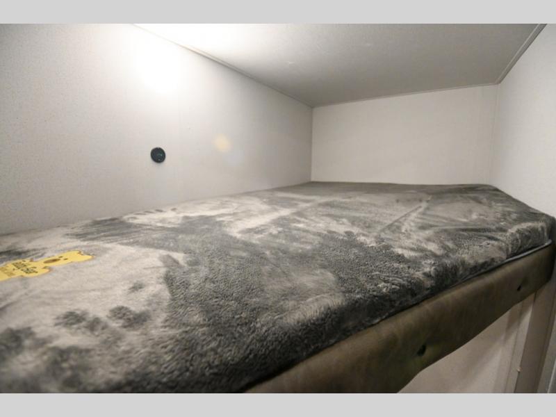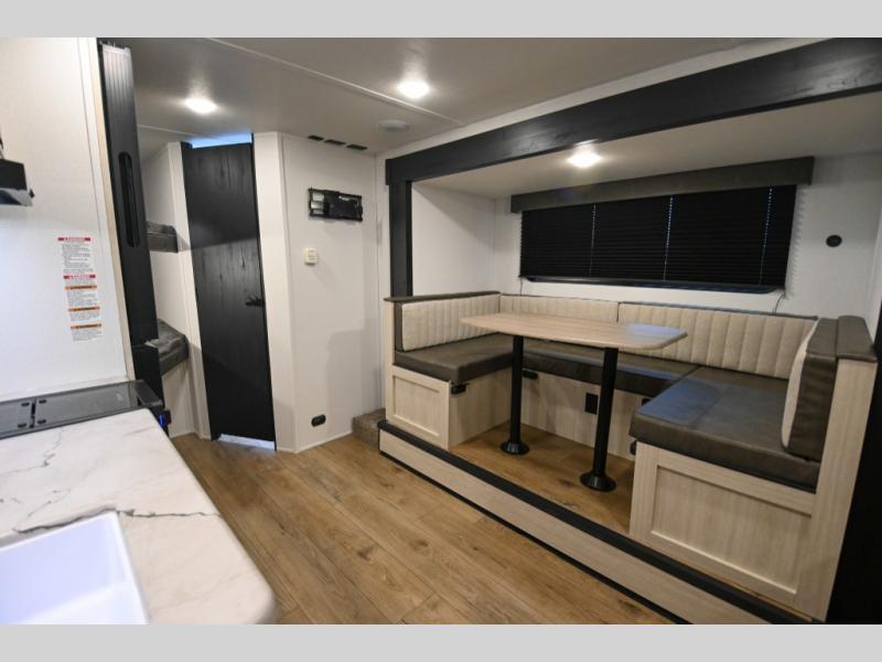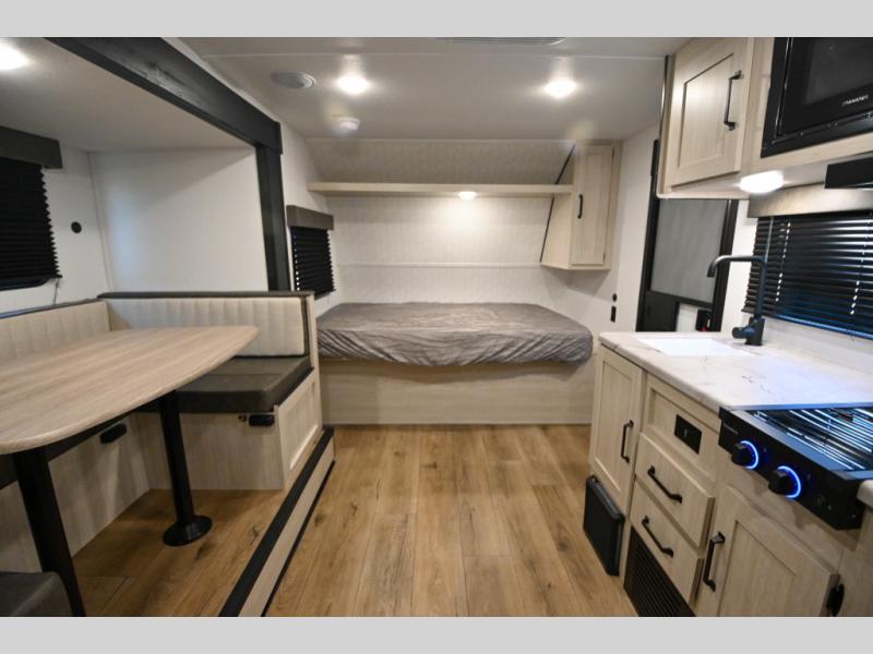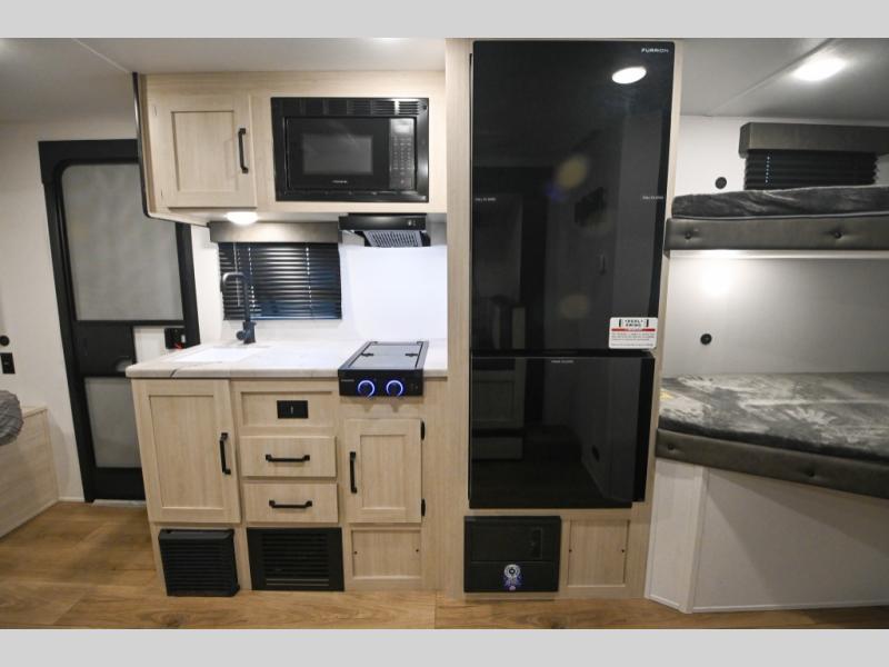 The whole gang will love camping in this travel trailer since there are double-size bunks for compact sleeping spaces and a slide out for more space to relax! The front RV queen bed is sure to provide a great night's rest, and you can choose the optional Murphy bed if you're needing more seating space during the day. Once you've made dinner on the two burner cooktop, you can dine around the U-shaped dinette. And an optional mini kitchen with a griddle is available if you'd rather cook outdoors! This unit includes ample storage space for your things, including exterior storage and storage under the bunks!