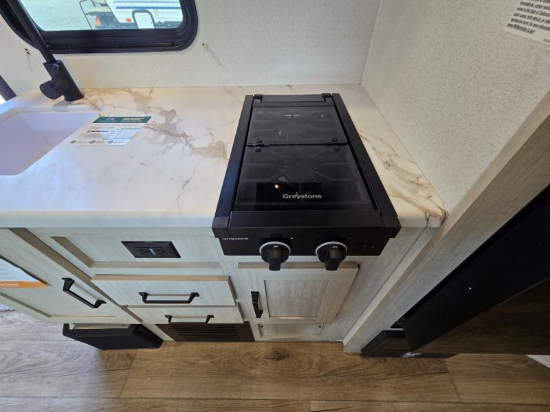 Includes a two-burner cooktop and microwave for simple meal prep. -