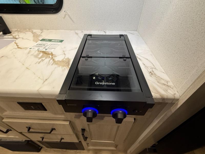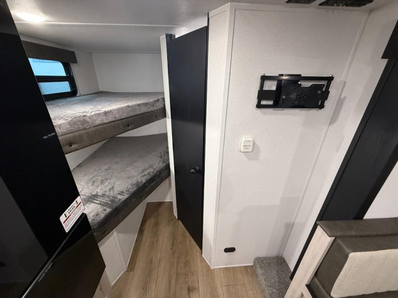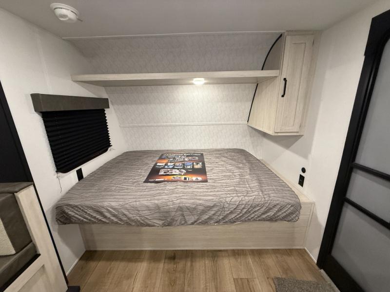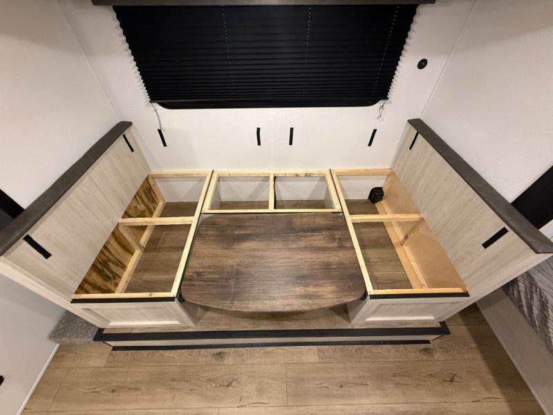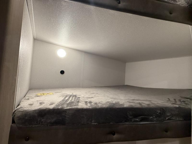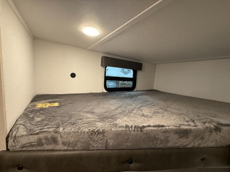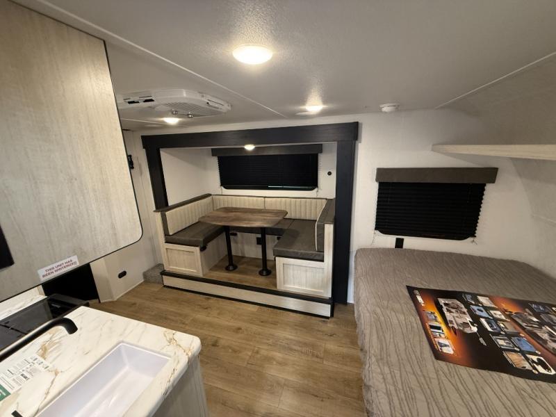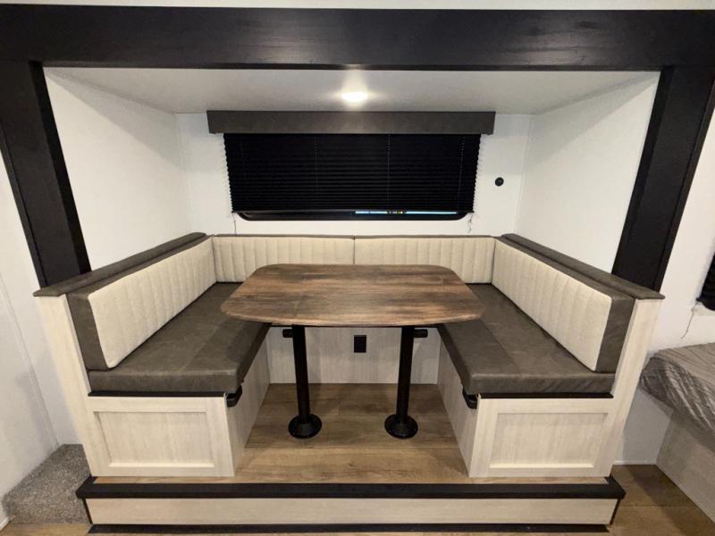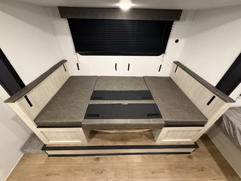 The whole gang will love camping in this travel trailer since there are double-size bunks for compact sleeping spaces and a slide out for more space to relax! The front RV queen bed is sure to provide a great night's rest, and you can choose the optional Murphy bed if you're needing more seating space during the day. Once you've made dinner on the two burner cooktop, you can dine around the U-shaped dinette. And an optional mini kitchen with a griddle is available if you'd rather cook outdoors! This unit includes ample storage space for your things, including exterior storage and storage under the bunks!