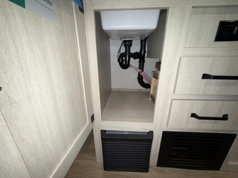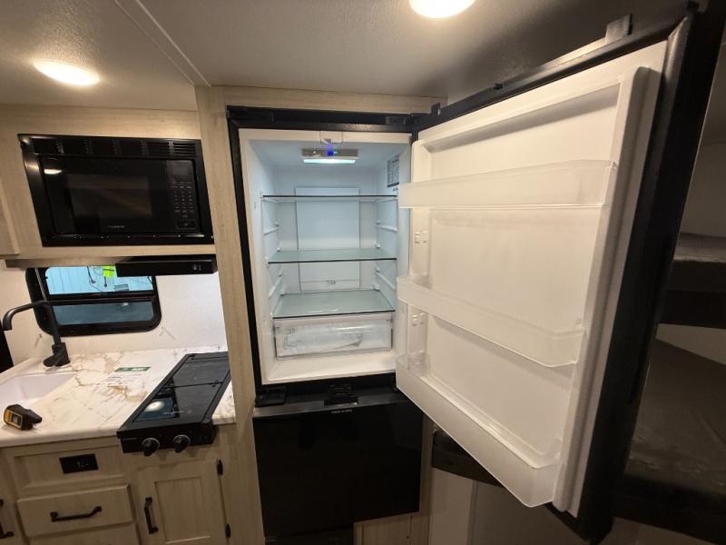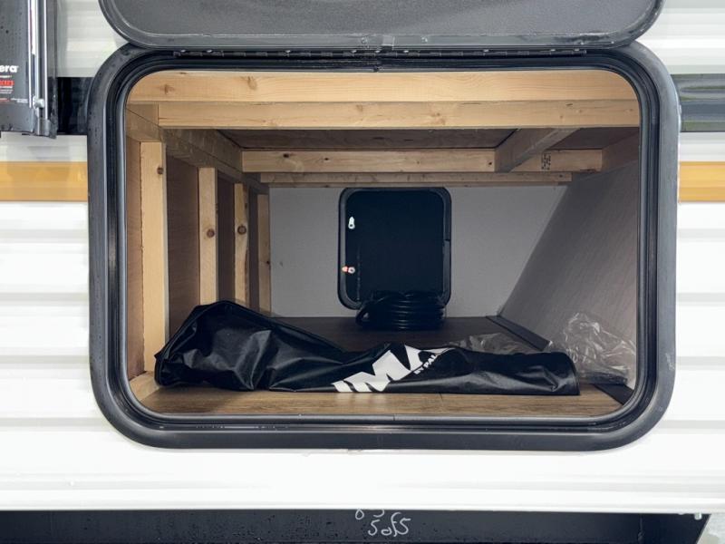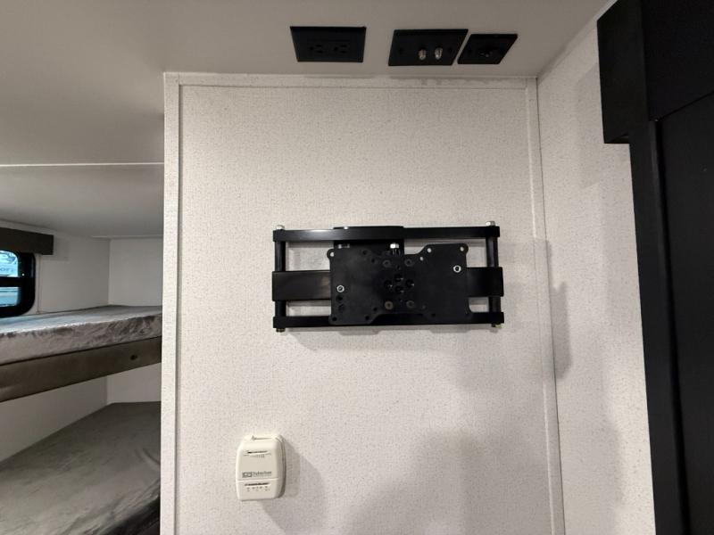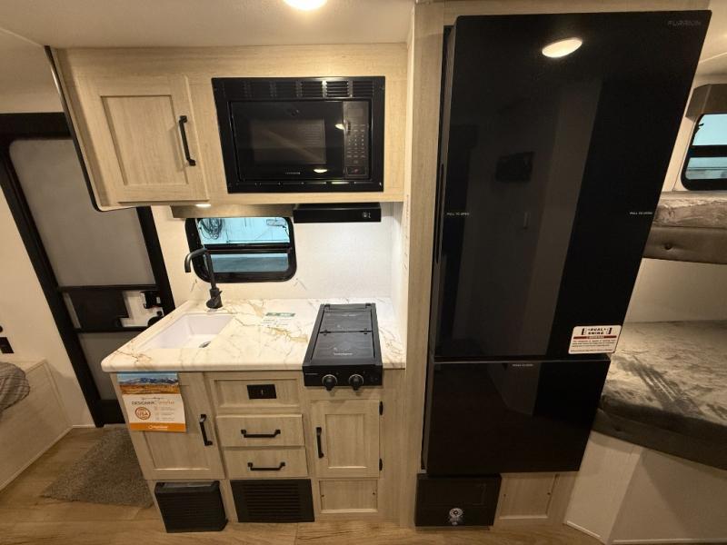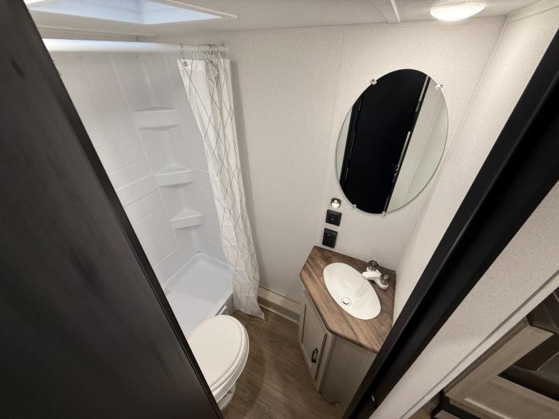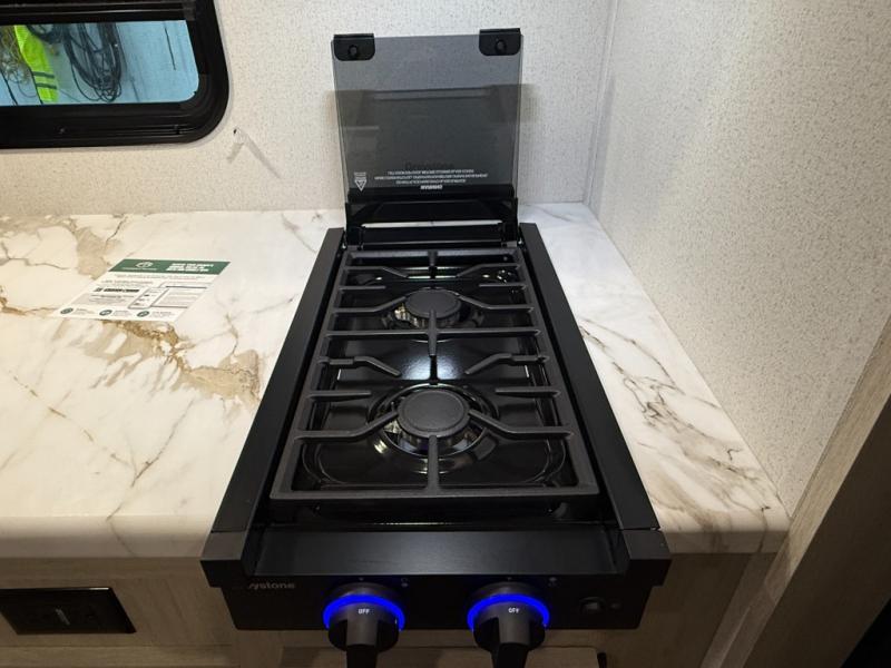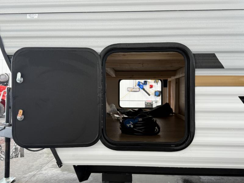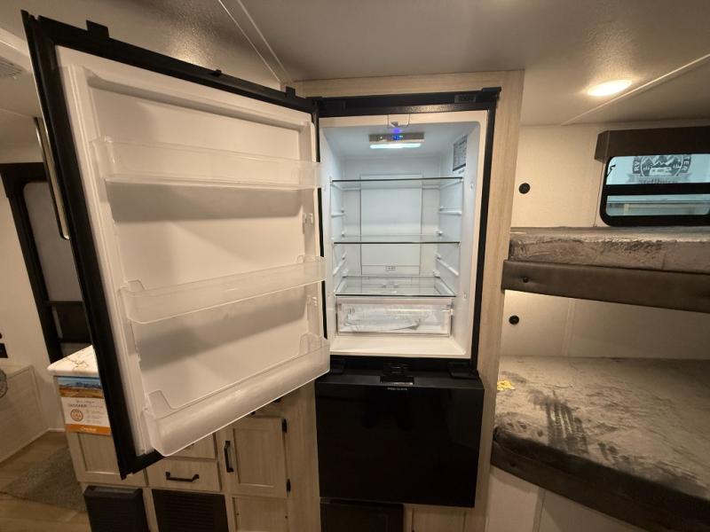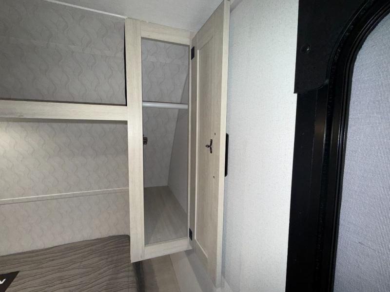 The whole gang will love camping in this travel trailer since there are double-size bunks for compact sleeping spaces and a slide out for more space to relax! The front RV queen bed is sure to provide a great night's rest, and you can choose the optional Murphy bed if you're needing more seating space during the day. Once you've made dinner on the two burner cooktop, you can dine around the U-shaped dinette. And an optional mini kitchen with a griddle is available if you'd rather cook outdoors! This unit includes ample storage space for your things, including exterior storage and storage under the bunks!