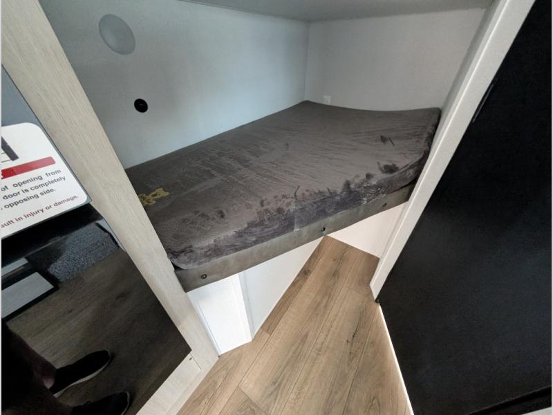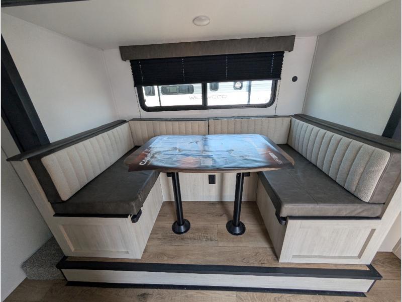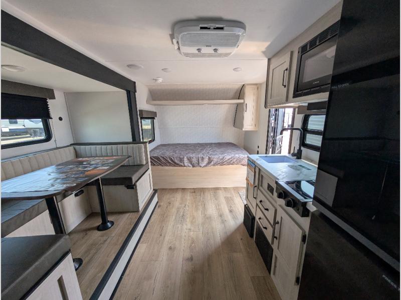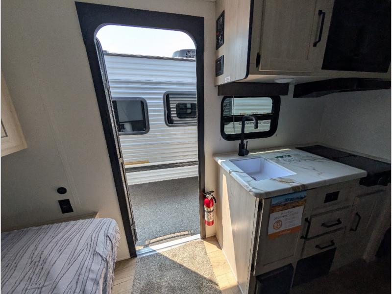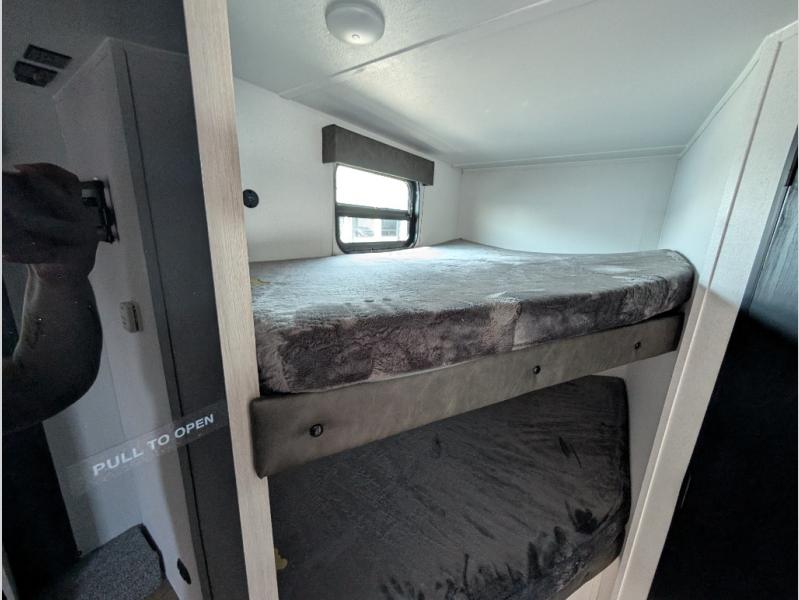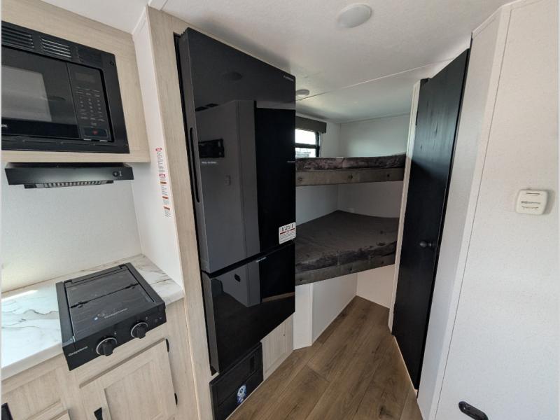 The whole gang will love camping in this travel trailer since there are double-size bunks for compact sleeping spaces and a slide out for more space to relax! The front RV queen bed is sure to provide a great night's rest, and you can choose the optional Murphy bed if you're needing more seating space during the day. Once you've made dinner on the two burner cooktop, you can dine around the U-shaped dinette. And an optional mini kitchen with a griddle is available if you'd rather cook outdoors! This unit includes ample storage space for your things, including exterior storage and storage under the bunks!
