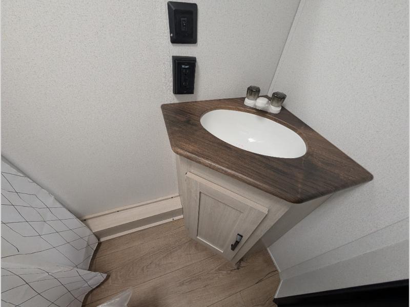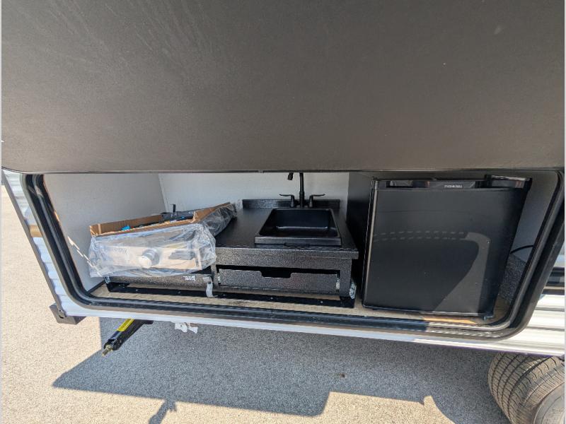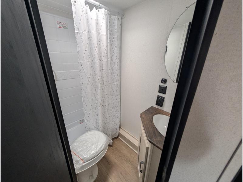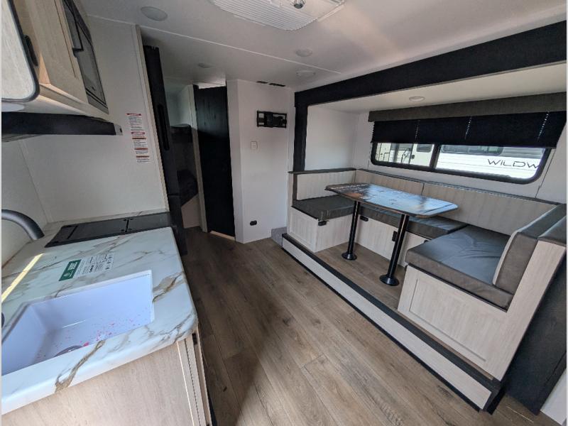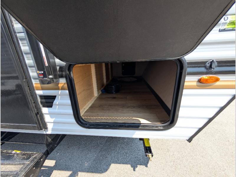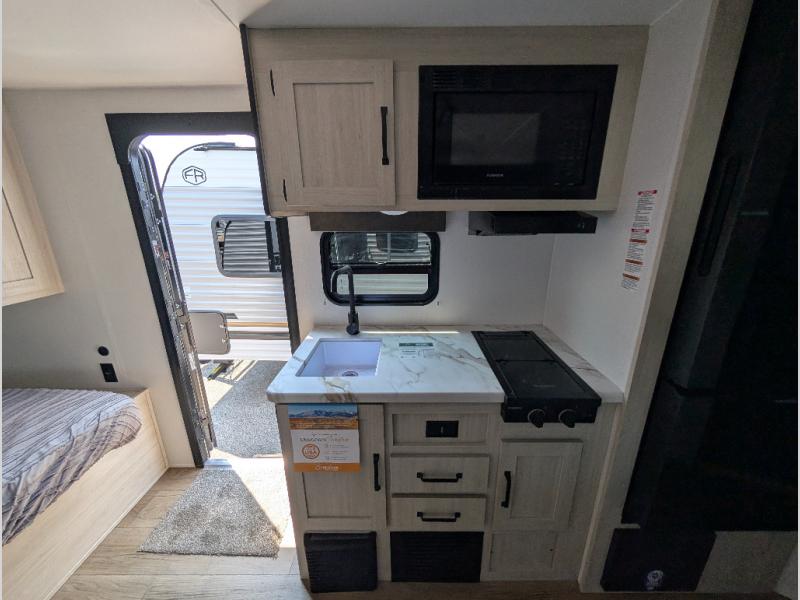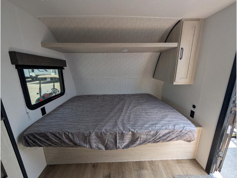 The whole gang will love camping in this travel trailer since there are double-size bunks for compact sleeping spaces and a slide out for more space to relax! The front RV queen bed is sure to provide a great night's rest, and you can choose the optional Murphy bed if you're needing more seating space during the day. Once you've made dinner on the two burner cooktop, you can dine around the U-shaped dinette. And an optional mini kitchen with a griddle is available if you'd rather cook outdoors! This unit includes ample storage space for your things, including exterior storage and storage under the bunks!