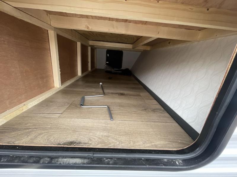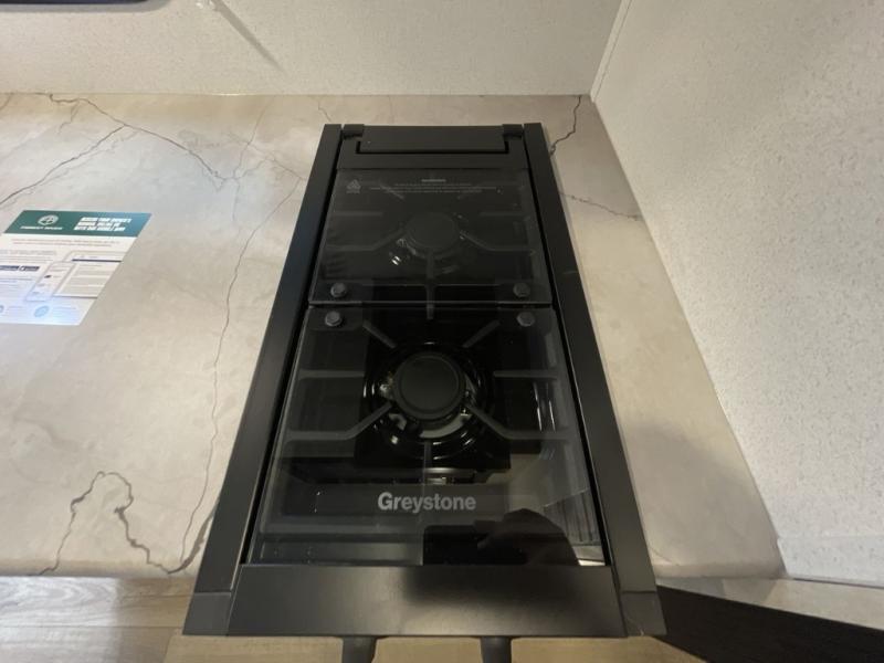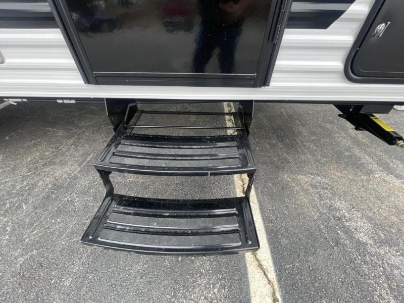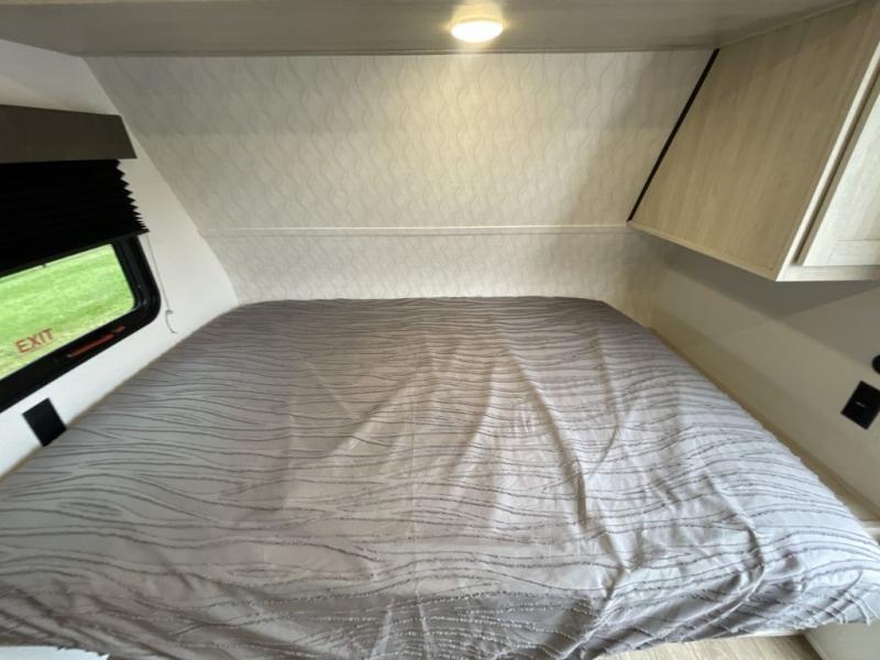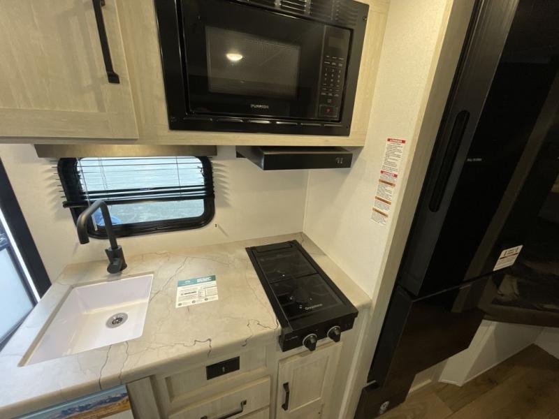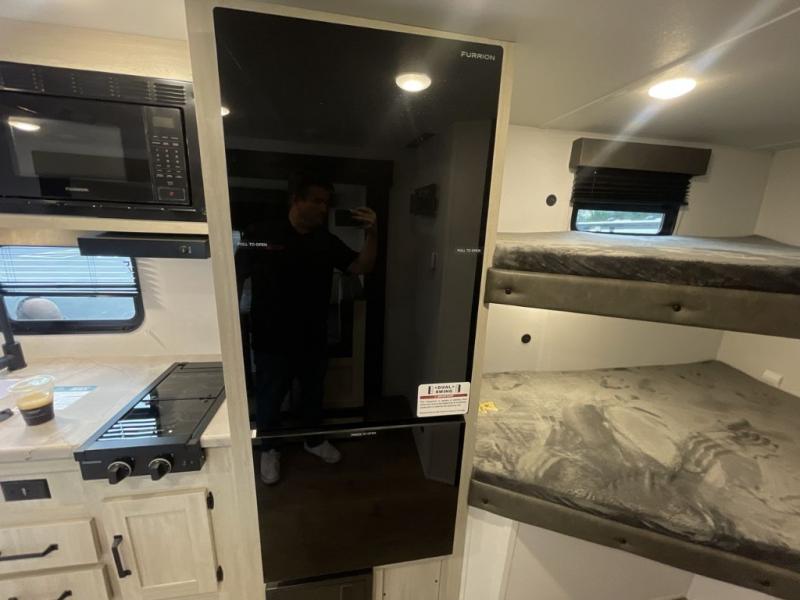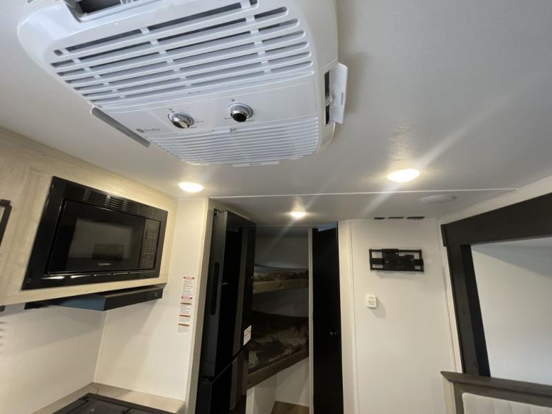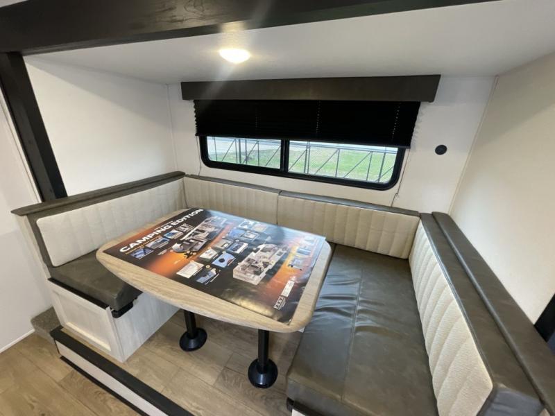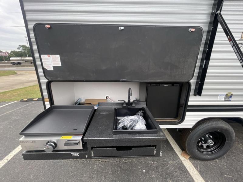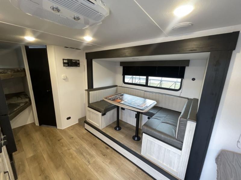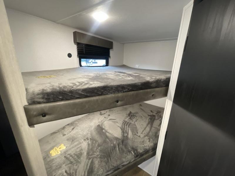 The whole gang will love camping in this travel trailer since there are double-size bunks for compact sleeping spaces and a slide out for more space to relax! The front RV queen bed is sure to provide a great night's rest, and you can choose the optional Murphy bed if you're needing more seating space during the day. Once you've made dinner on the two burner cooktop, you can dine around the U-shaped dinette. And an optional mini kitchen with a griddle is available if you'd rather cook outdoors! This unit includes ample storage space for your things, including exterior storage and storage under the bunks!
