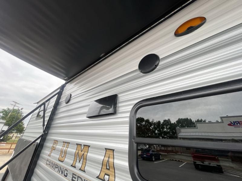 The Puma Camping Edition by Palomino offer an affordable travel trailer for rookie campers or seasoned RVers! They are built with 5/8" tongue and groove plywood flooring and a front diamond plate for added protection. There are also exterior clamp style door latches, back up camera prep, and 20 lb. LP bottles. Head inside to find Thermofoil countertops with a smooth drop edge, bedroom USB ports and outlets, and a GE appliance and kitchen package.