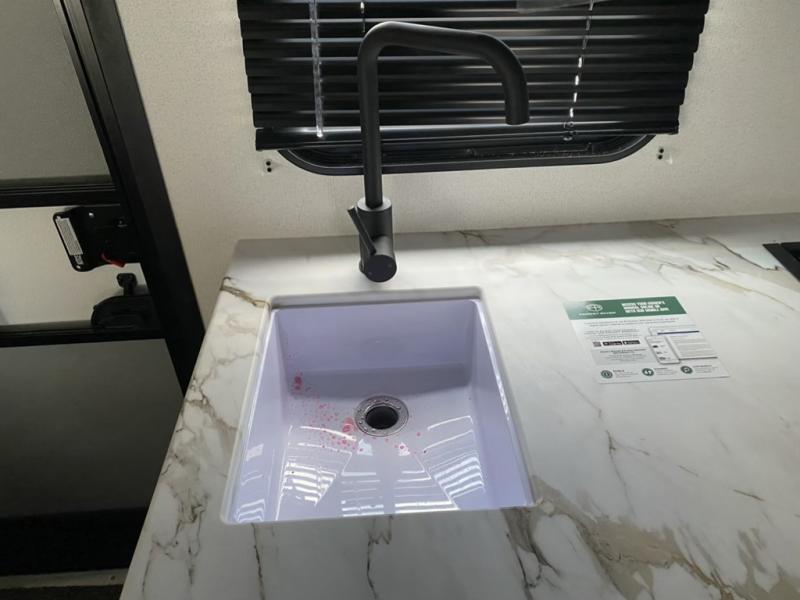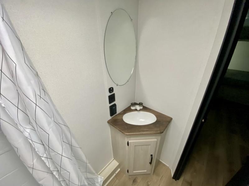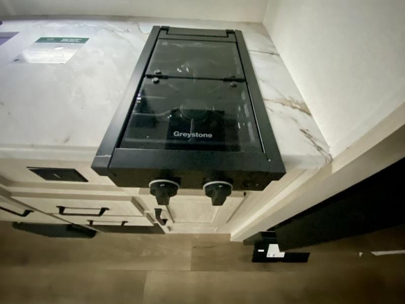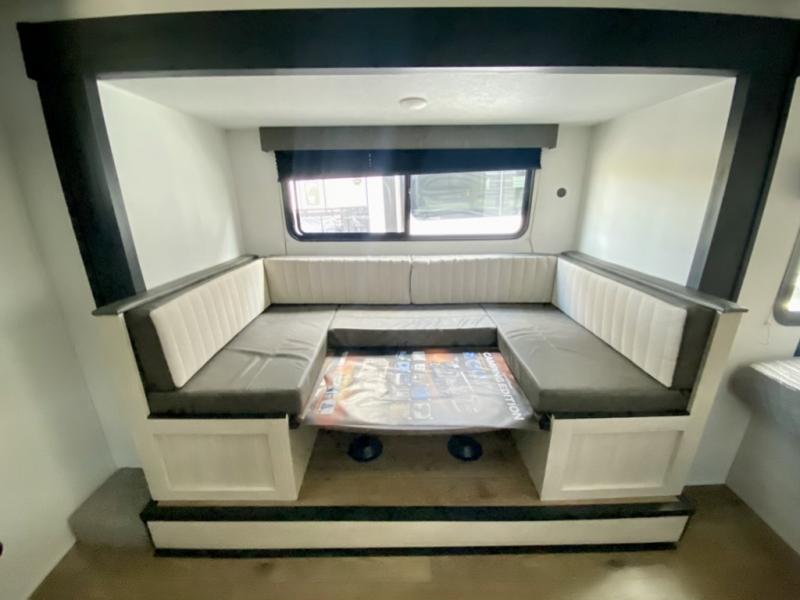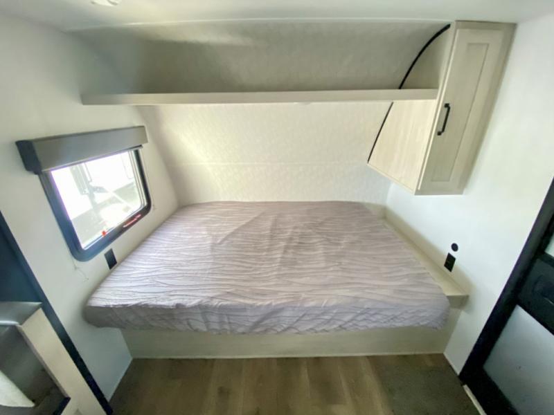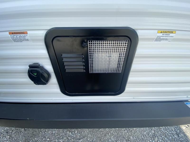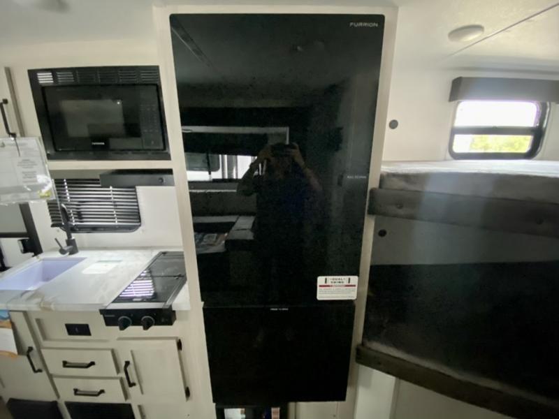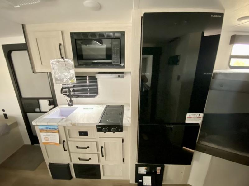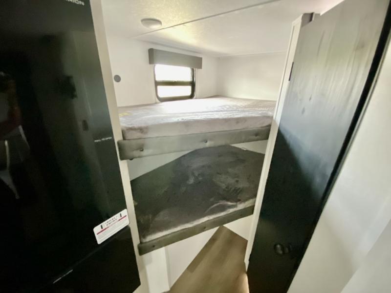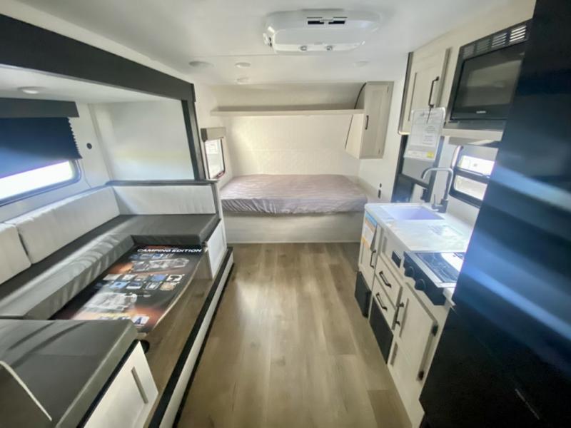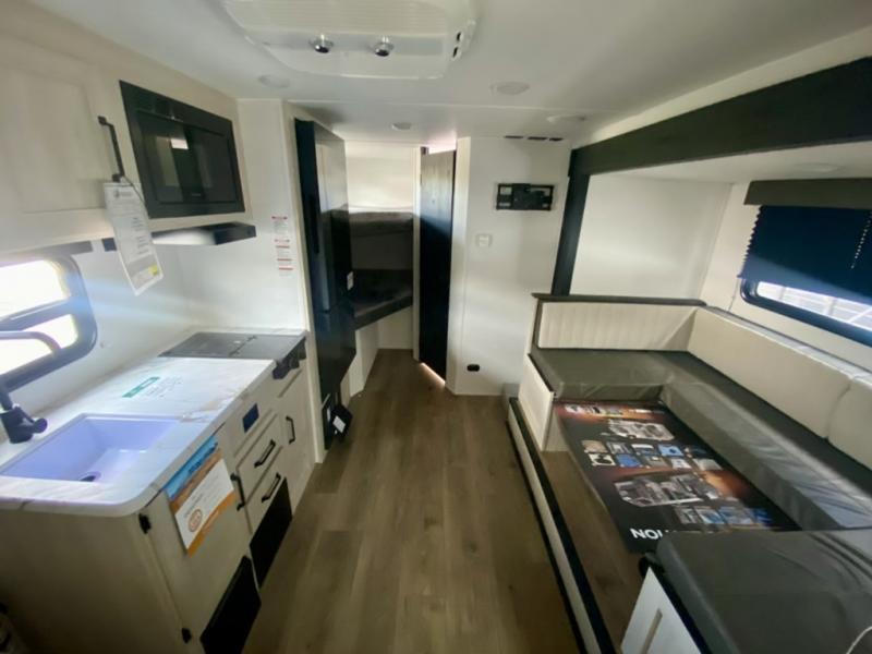 The whole gang will love camping in this travel trailer since there are double-size bunks for compact sleeping spaces and a slide out for more space to relax! The front RV queen bed is sure to provide a great night's rest, and you can choose the optional Murphy bed if you're needing more seating space during the day. Once you've made dinner on the two burner cooktop, you can dine around the U-shaped dinette. And an optional mini kitchen with a griddle is available if you'd rather cook outdoors! This unit includes ample storage space for your things, including exterior storage and storage under the bunks!
