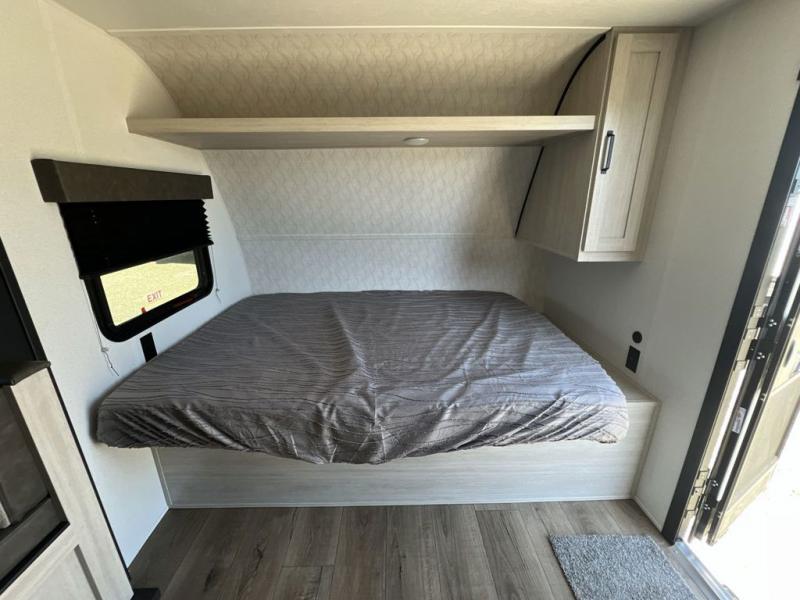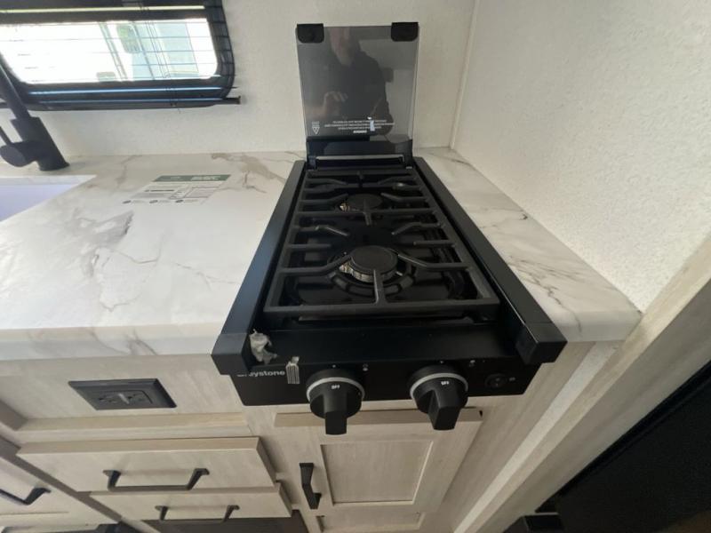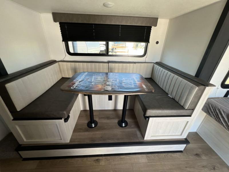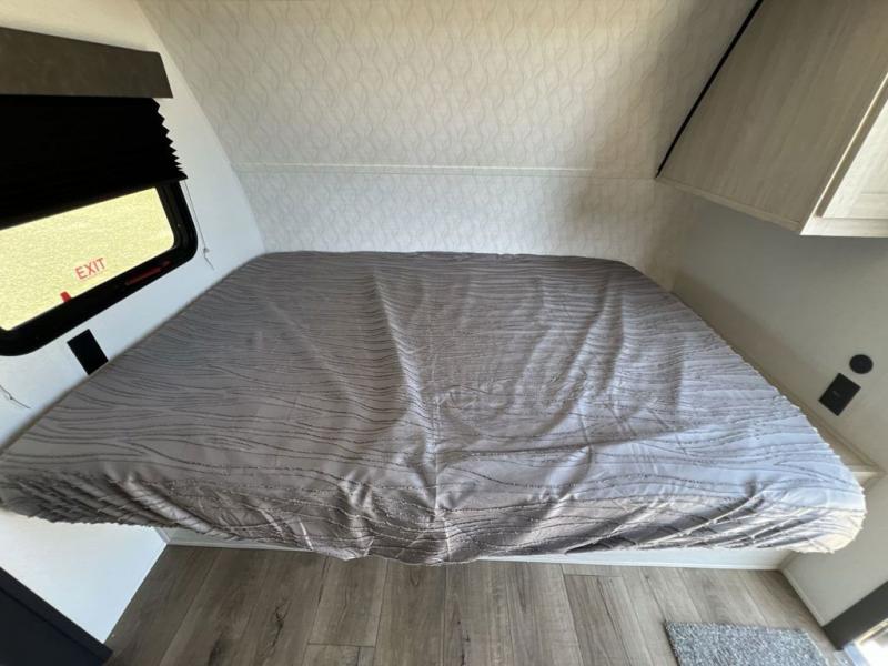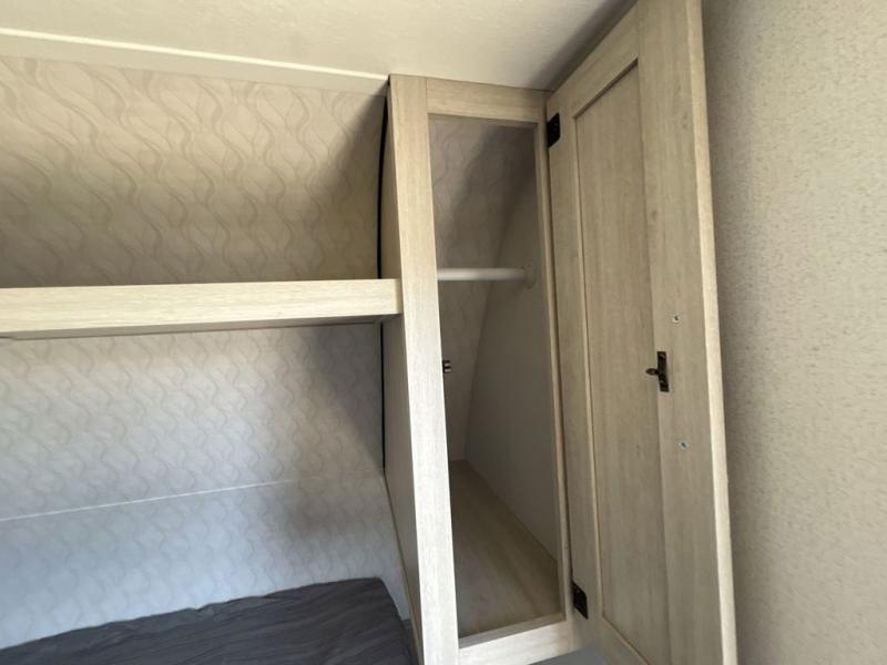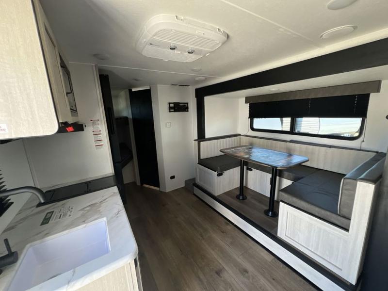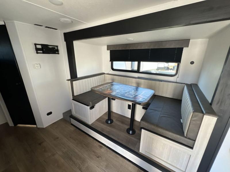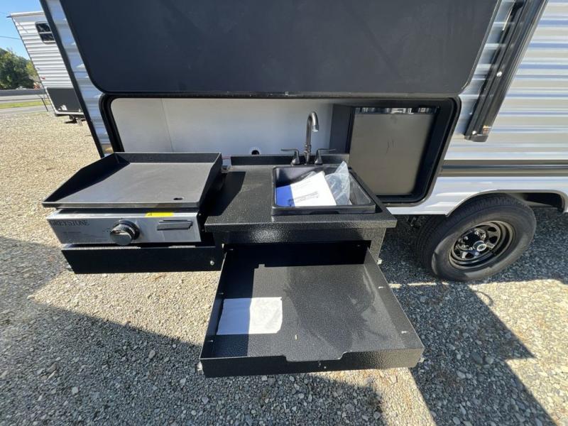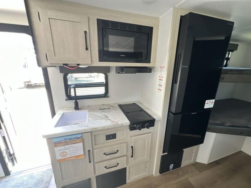 The whole gang will love camping in this travel trailer since there are double-size bunks for compact sleeping spaces and a slide out for more space to relax! The front RV queen bed is sure to provide a great night's rest, and you can choose the optional Murphy bed if you're needing more seating space during the day. Once you've made dinner on the two burner cooktop, you can dine around the U-shaped dinette. And an optional mini kitchen with a griddle is available if you'd rather cook outdoors! This unit includes ample storage space for your things, including exterior storage and storage under the bunks!